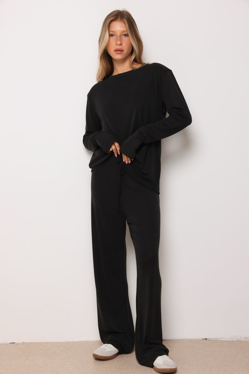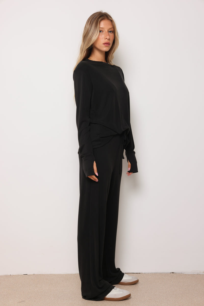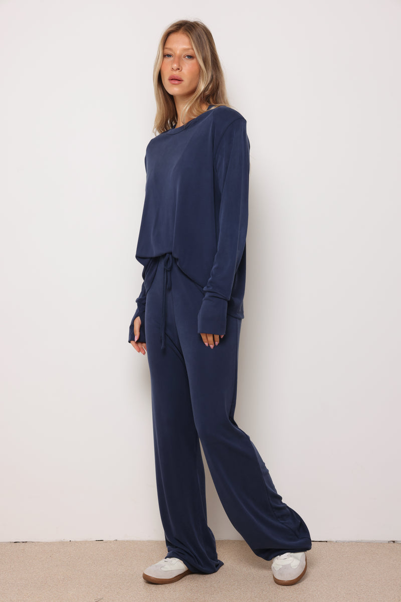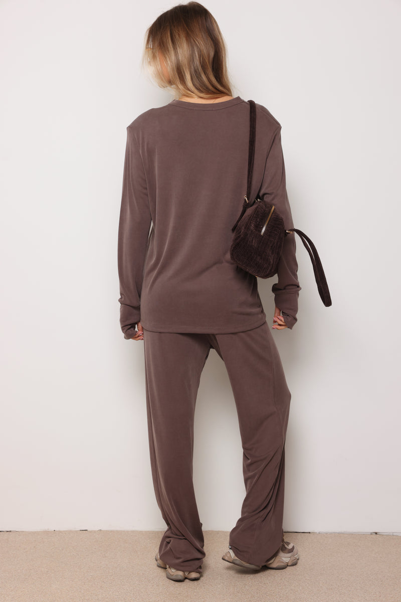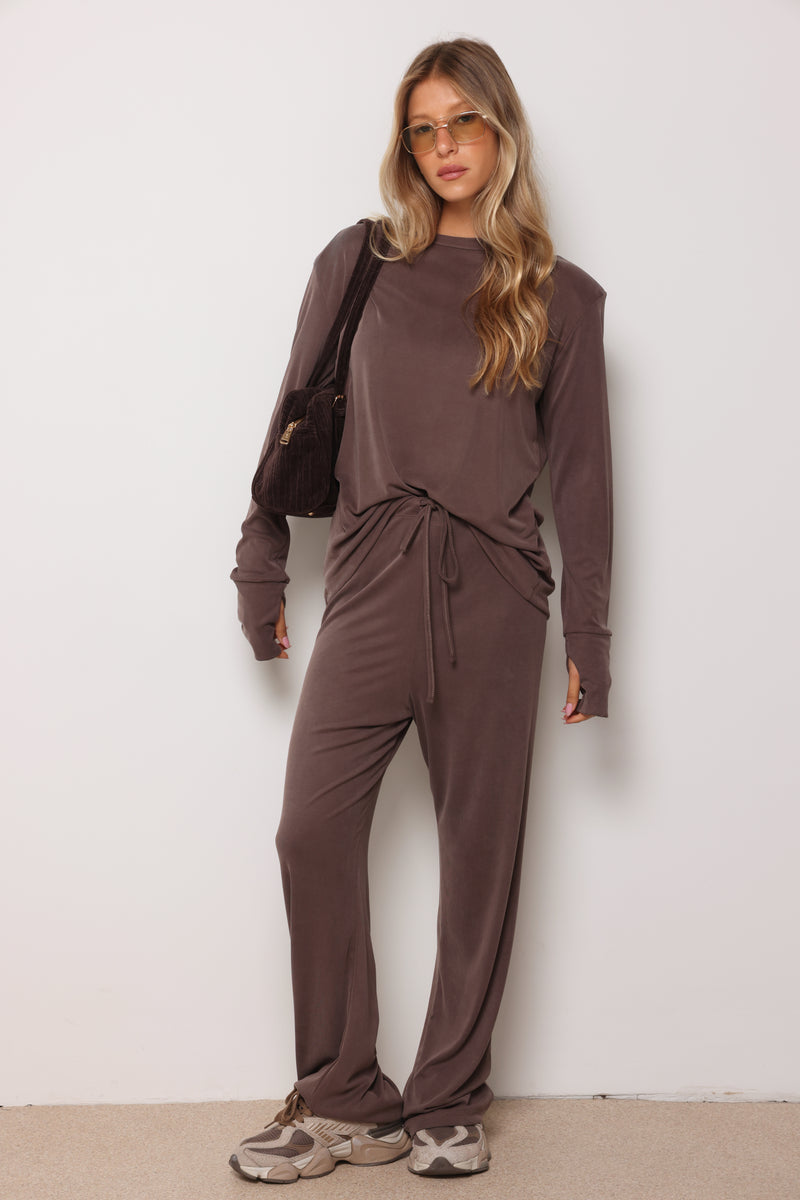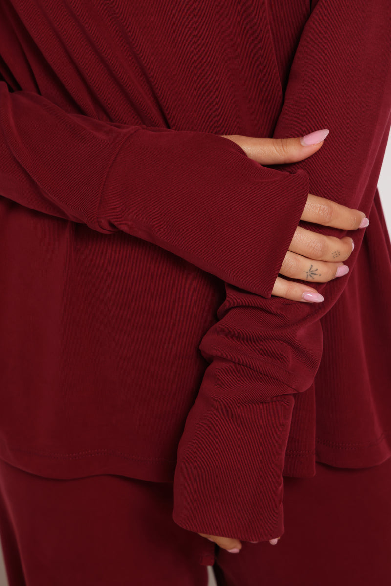 סט מבד ריב מודאל, נמתח ורך, סופר נעים ויפה עם כריות בכתפיים, כפפה באגודל ומכנסיים מתרחבים.
