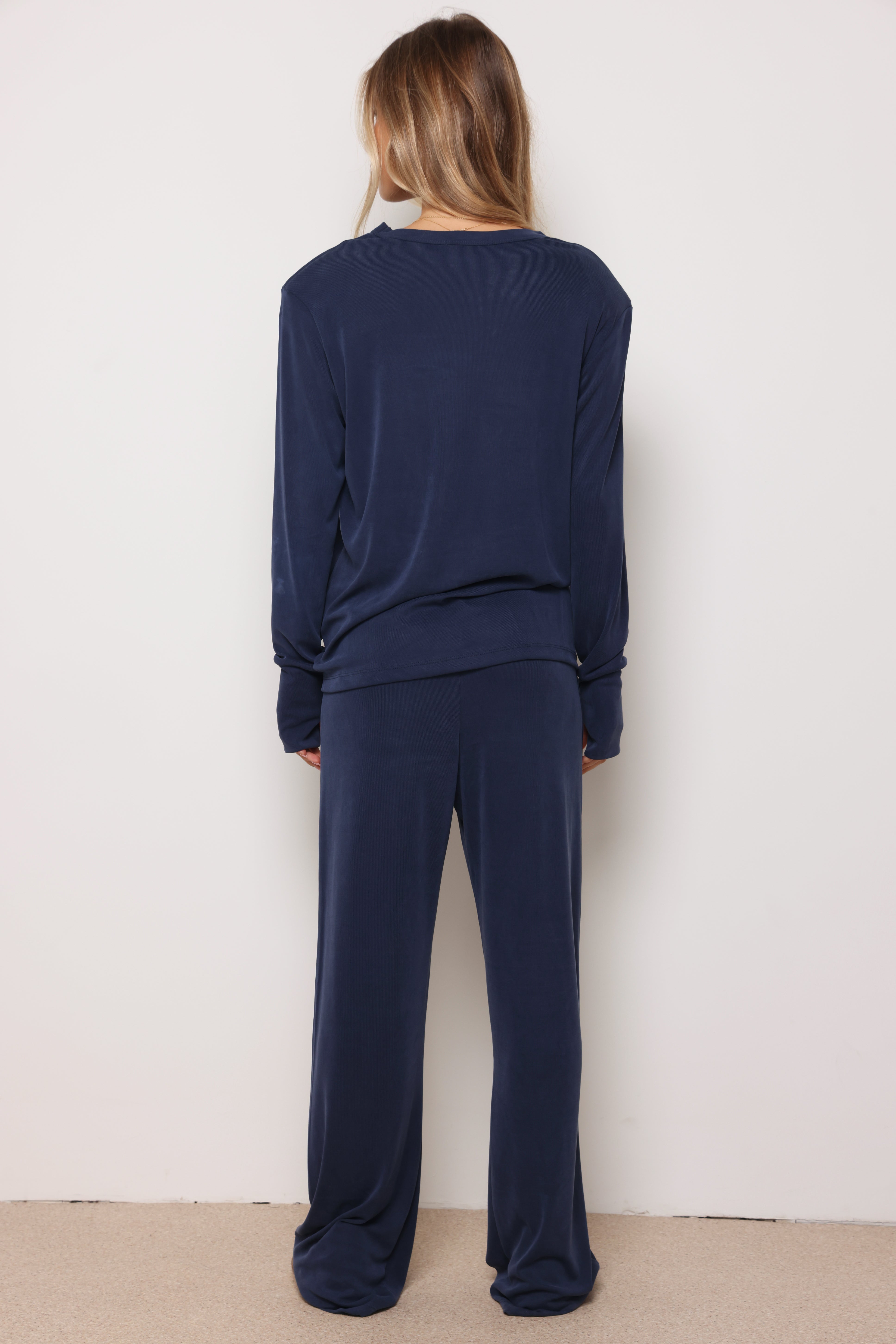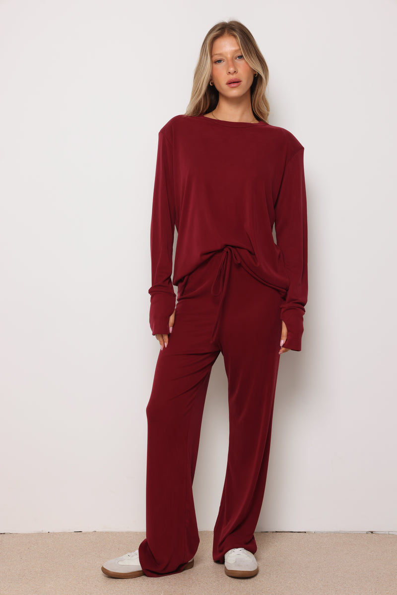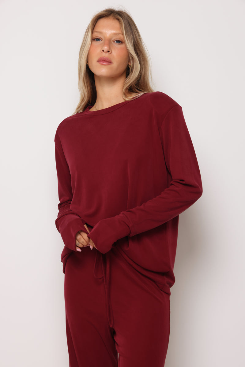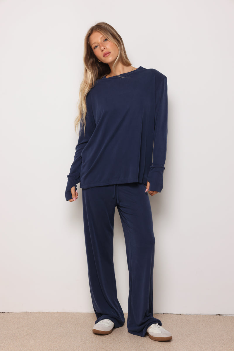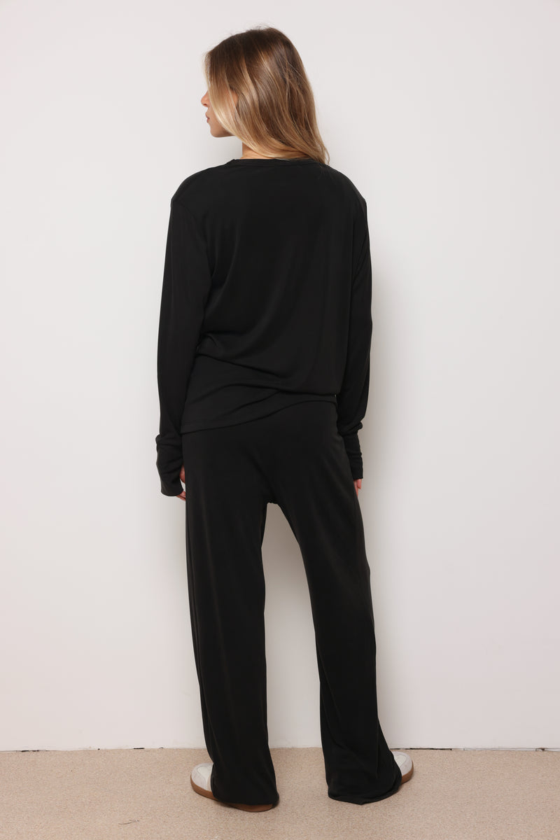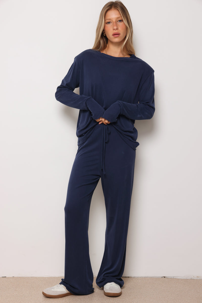 סט מבד ריב מודאל, נמתח ורך, סופר נעים ויפה עם כריות בכתפיים, כפפה באגודל ומכנסיים מתרחבים.