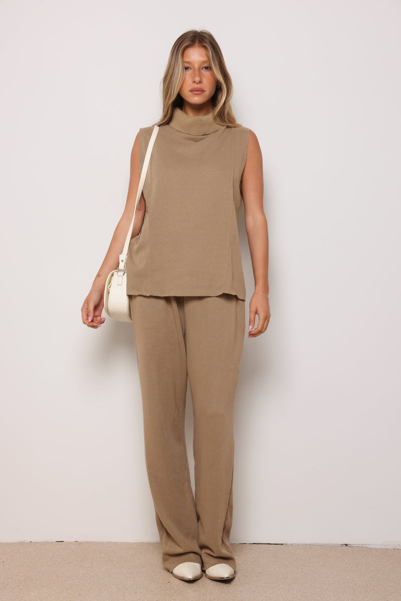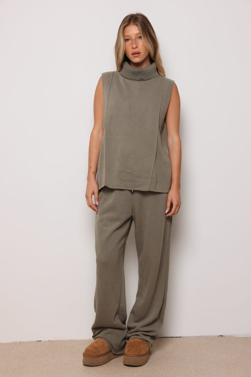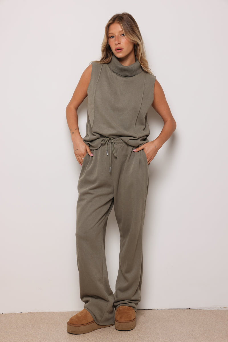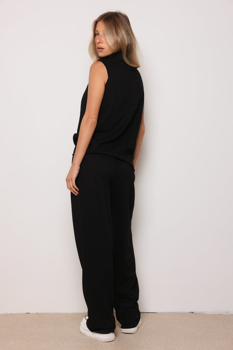 חליפה מבד סריג במגע רך המורכבת מגופית סריג עם גולף ומכנסיים בסיומת מתרחבת.