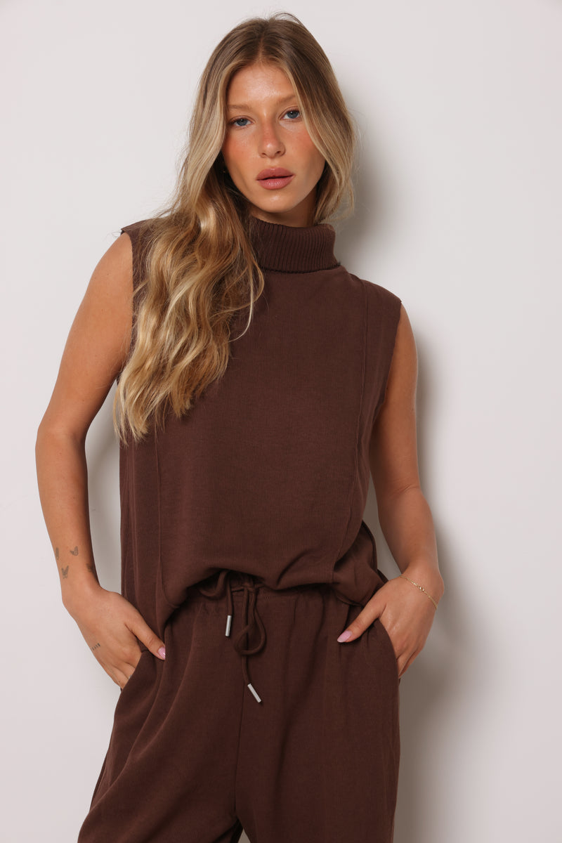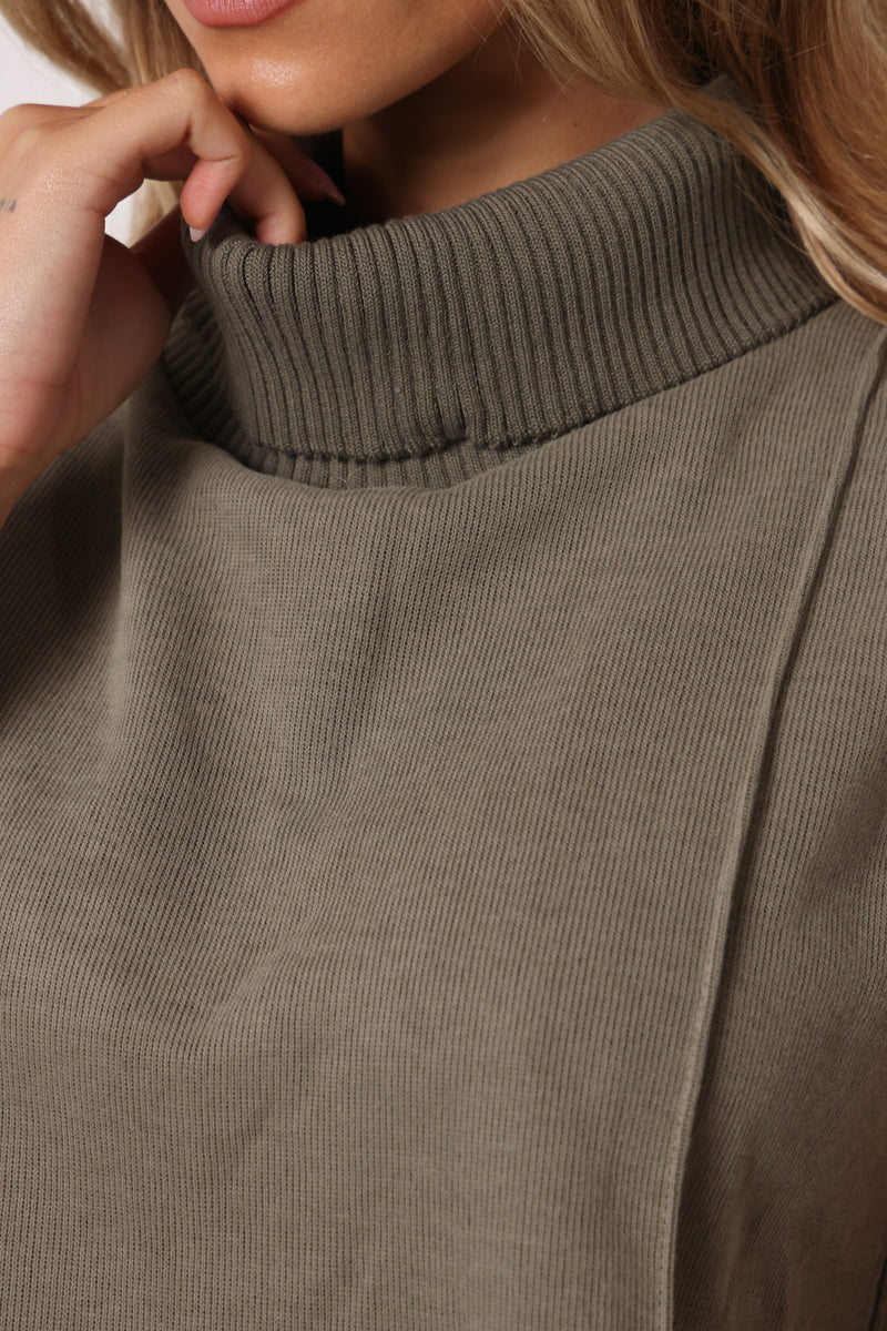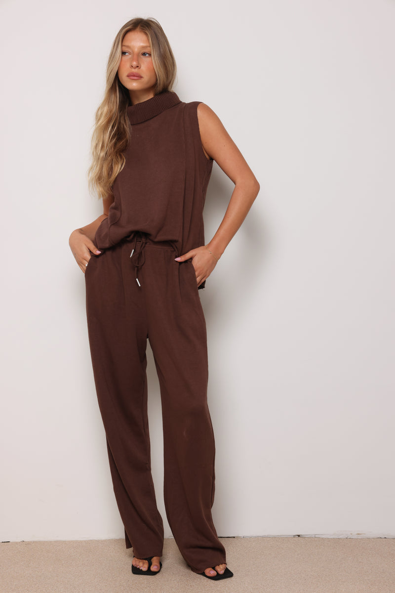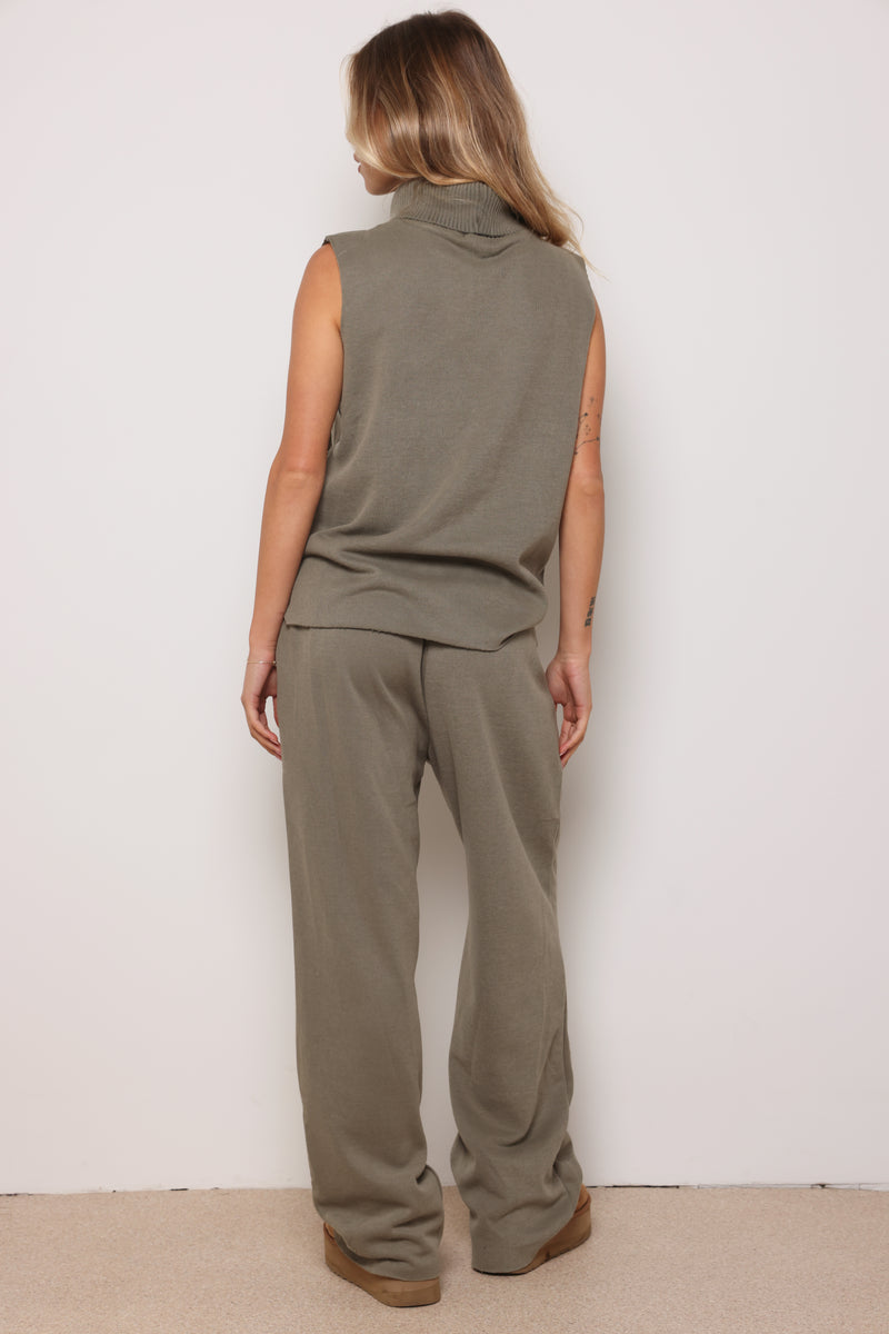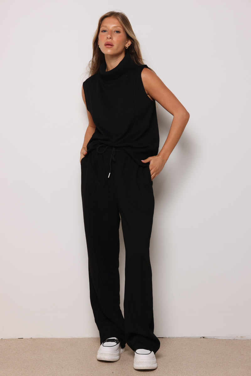 חליפה מבד סריג במגע רך המורכבת מגופית סריג עם גולף ומכנסיים בסיומת מתרחבת.