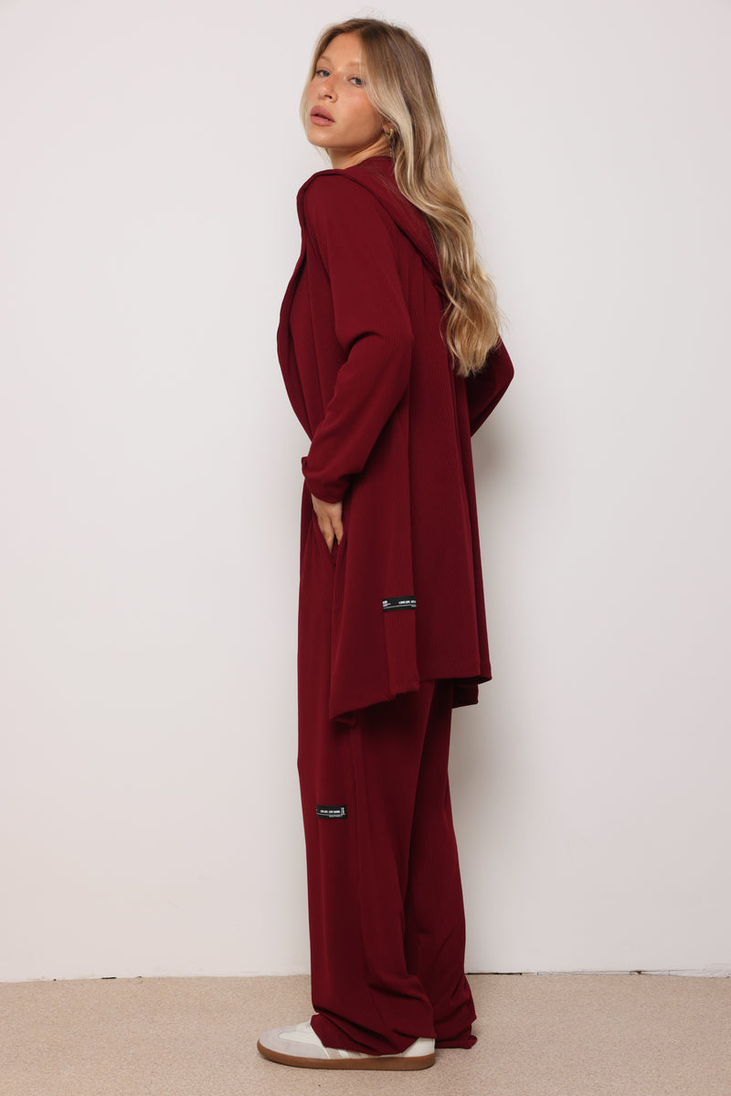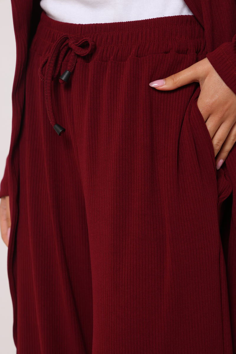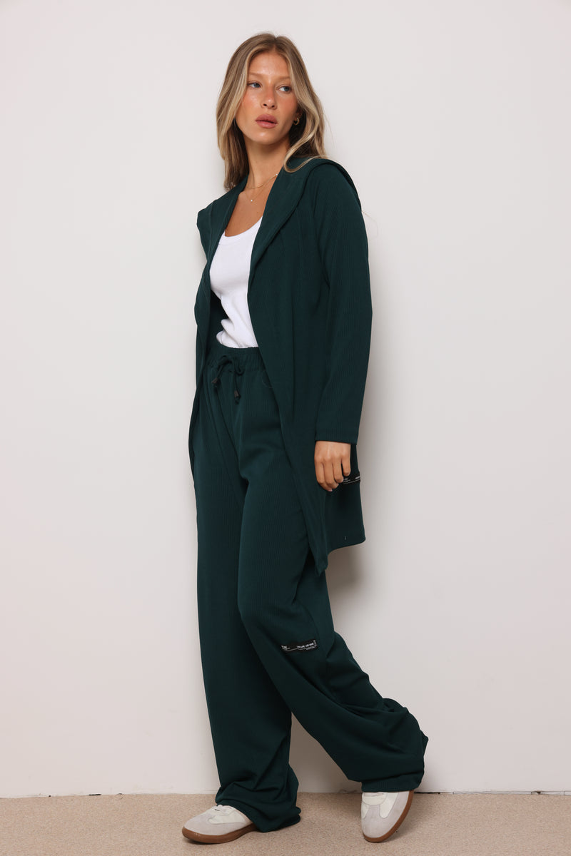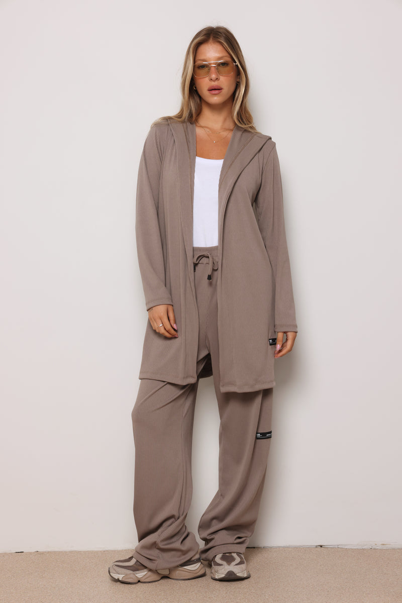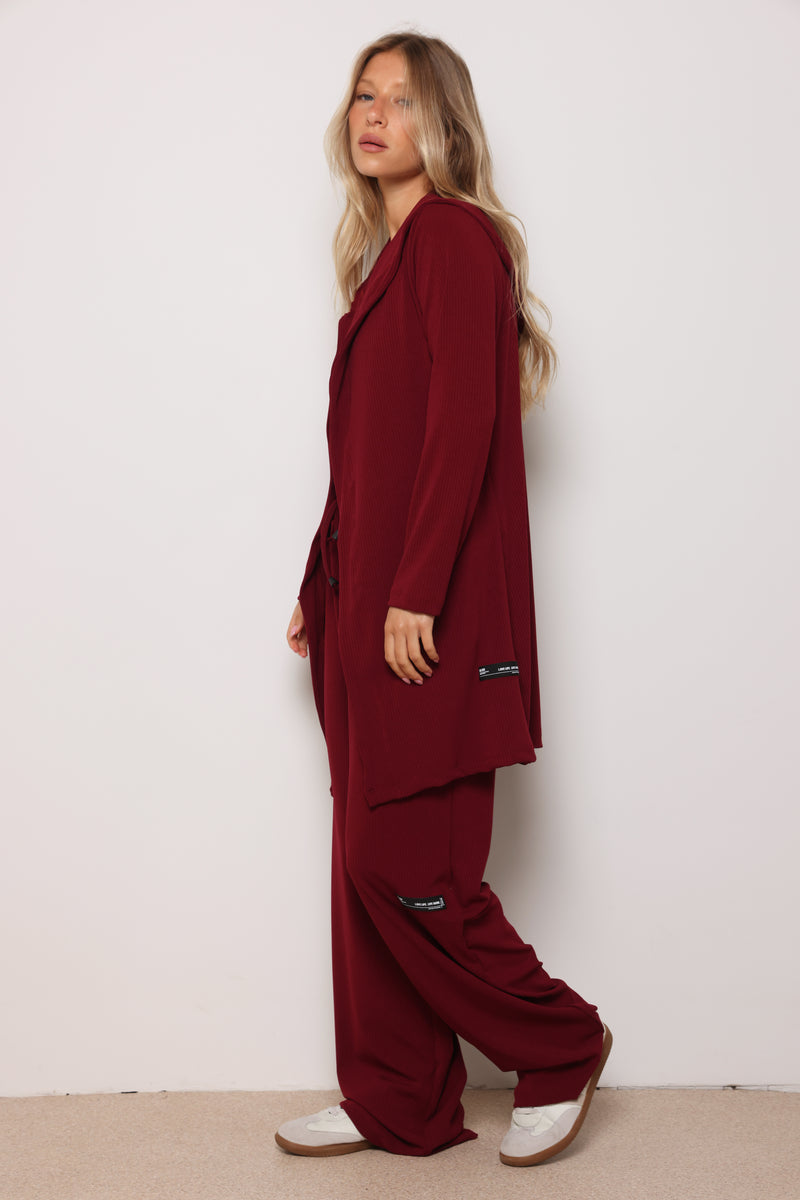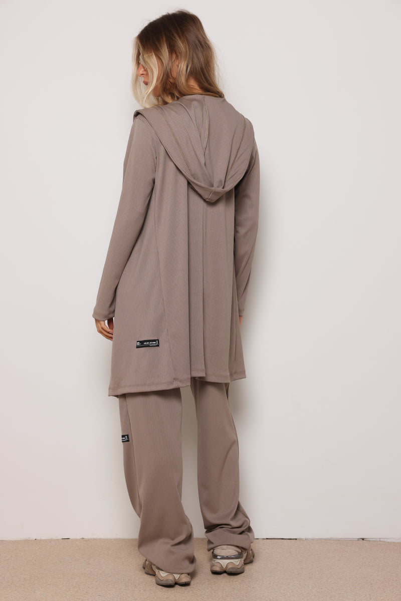 חליפת קזואל מבד ריב במגע רך עם עליונית מקסי ומכנסיים בסיומת מתרחבת.