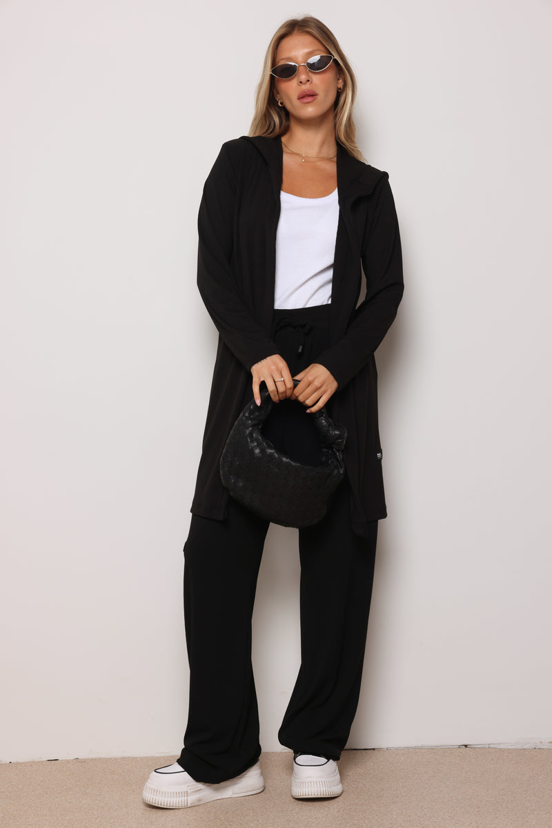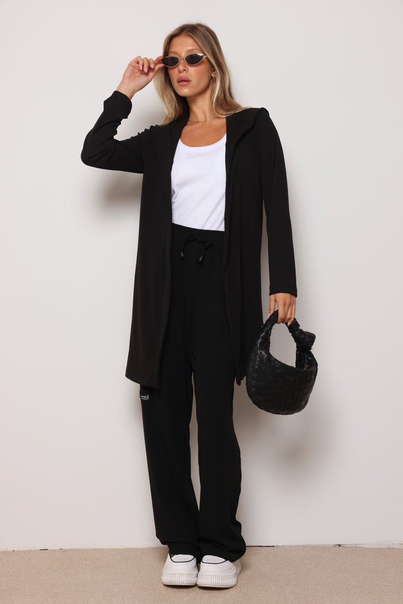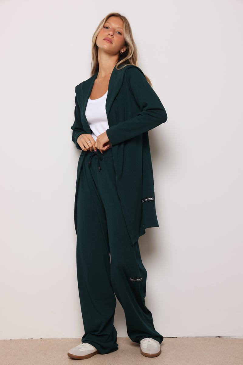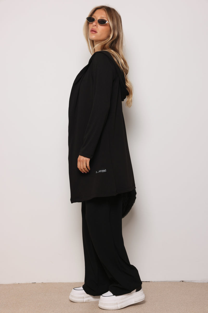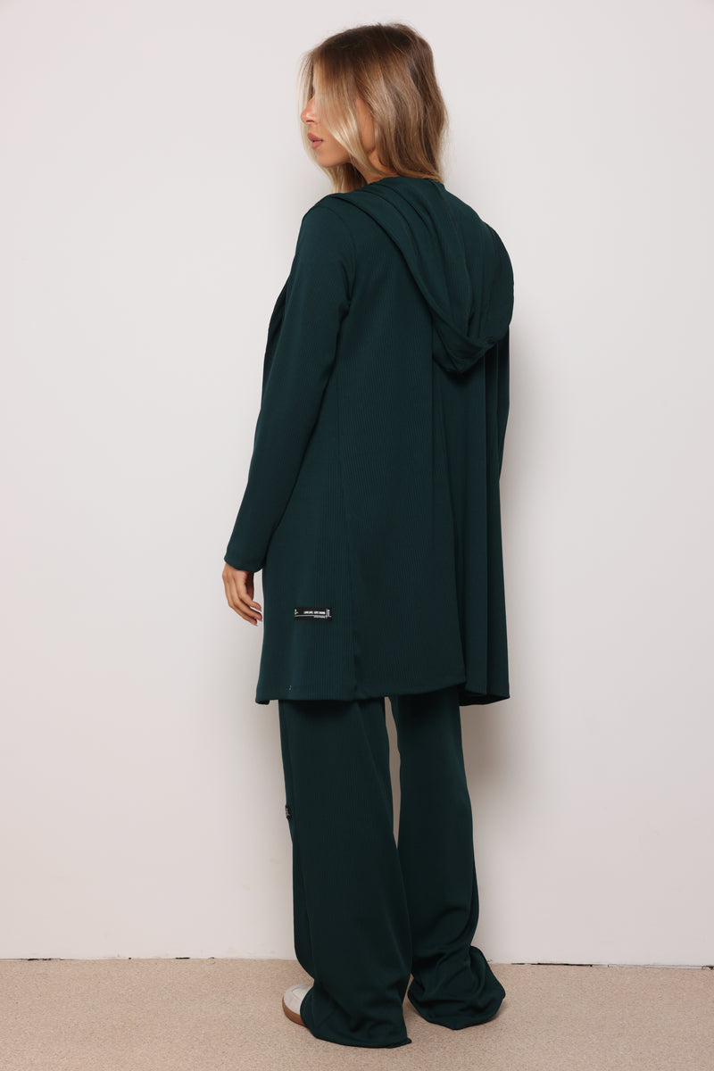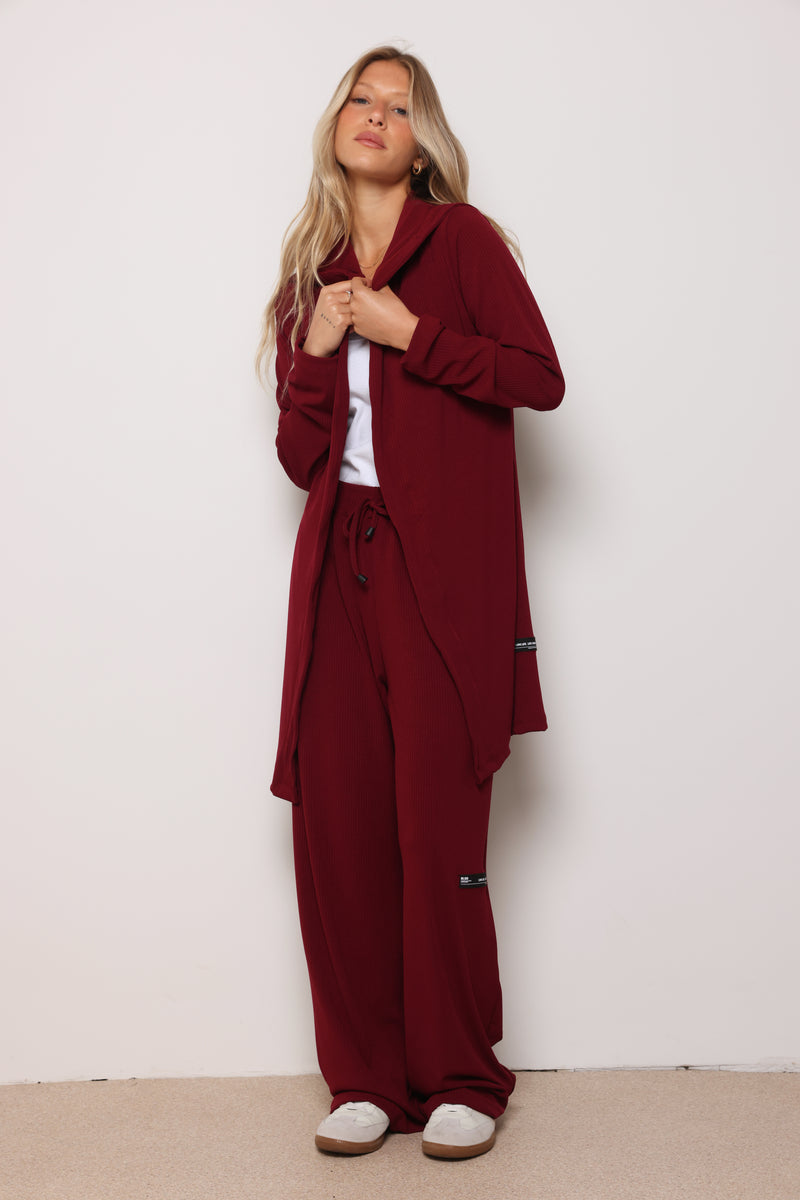 חליפת קזואל מבד ריב במגע רך עם עליונית מקסי ומכנסיים בסיומת מתרחבת.
