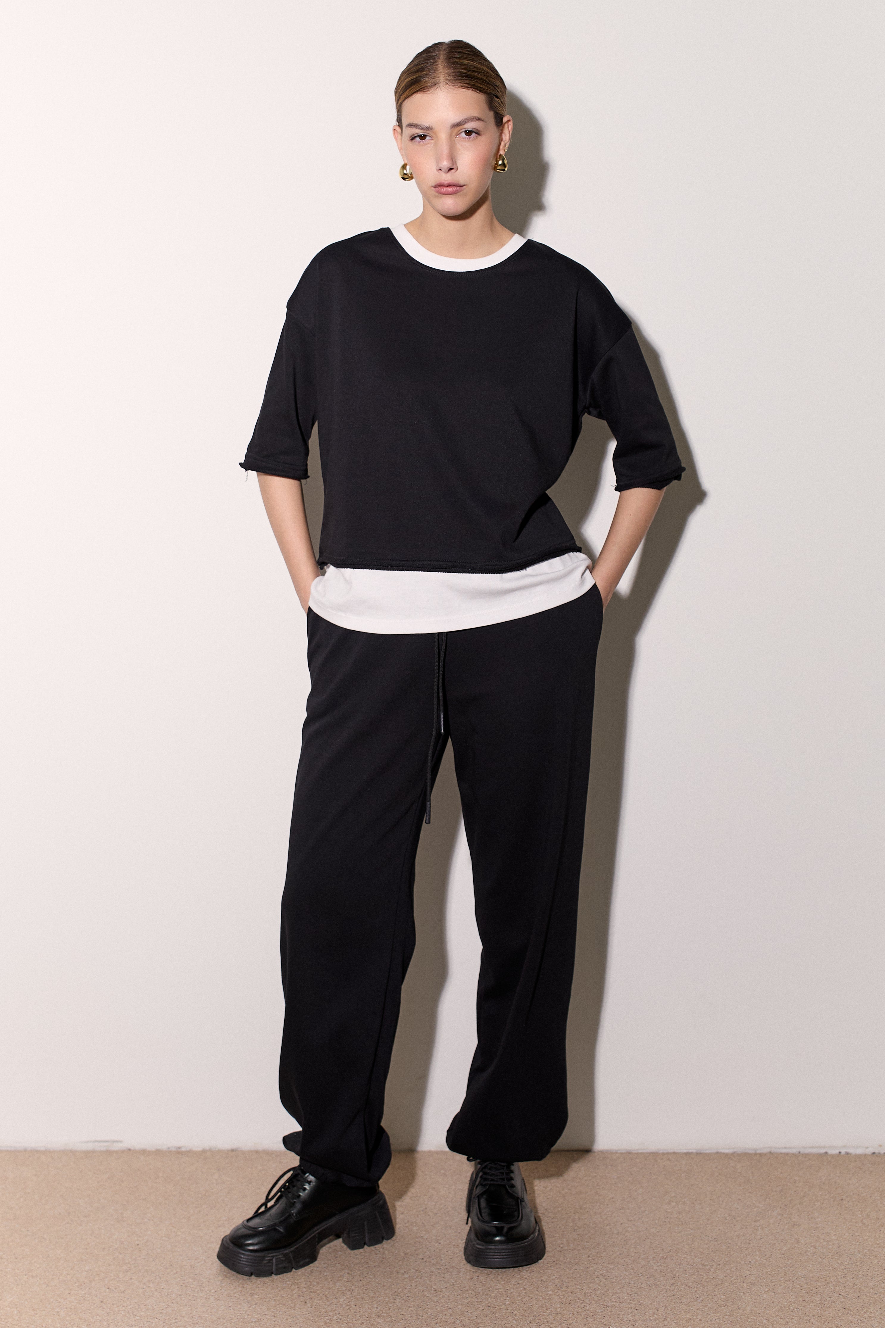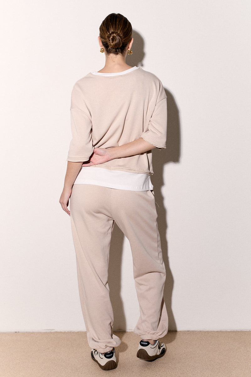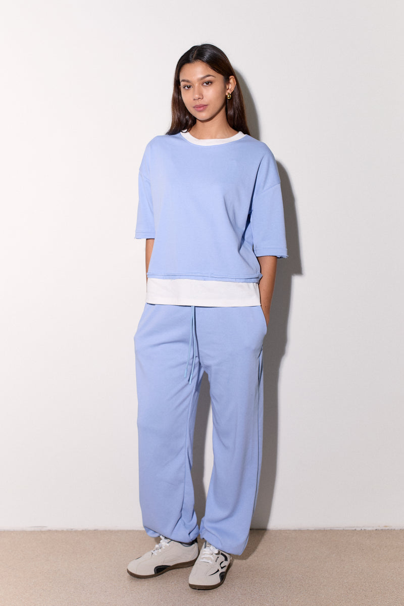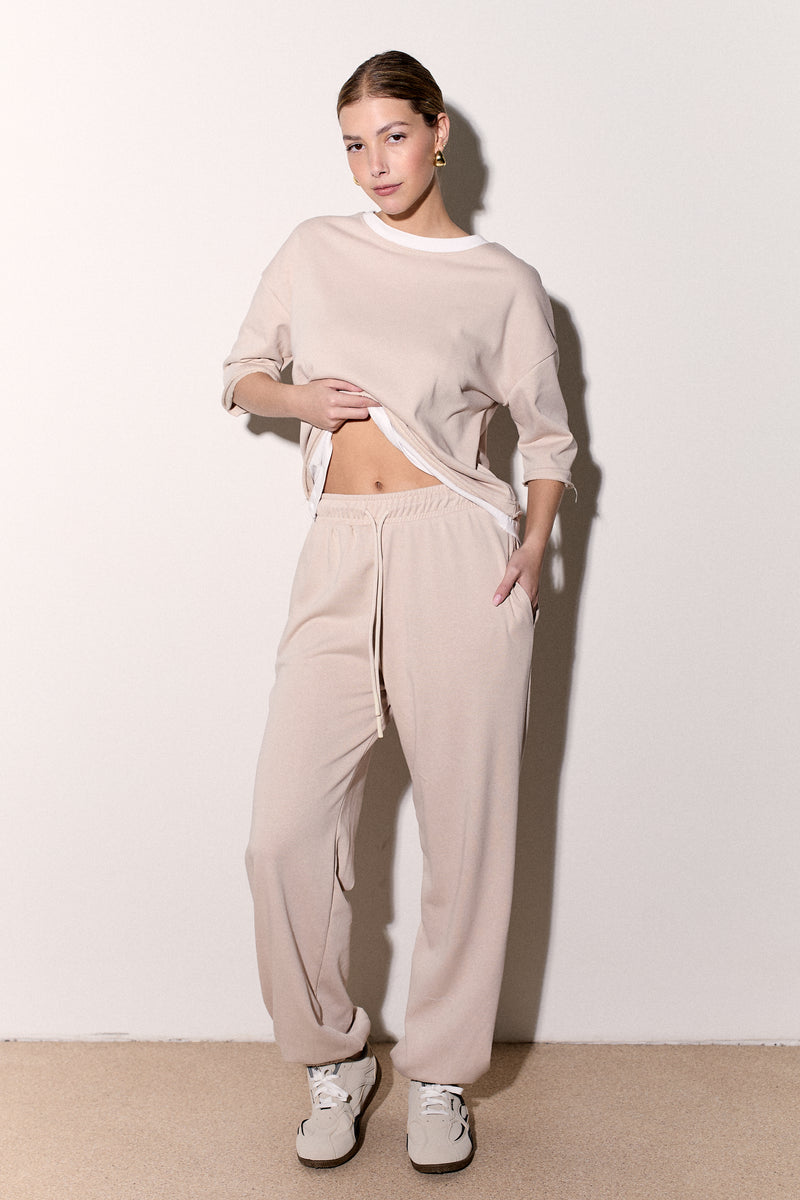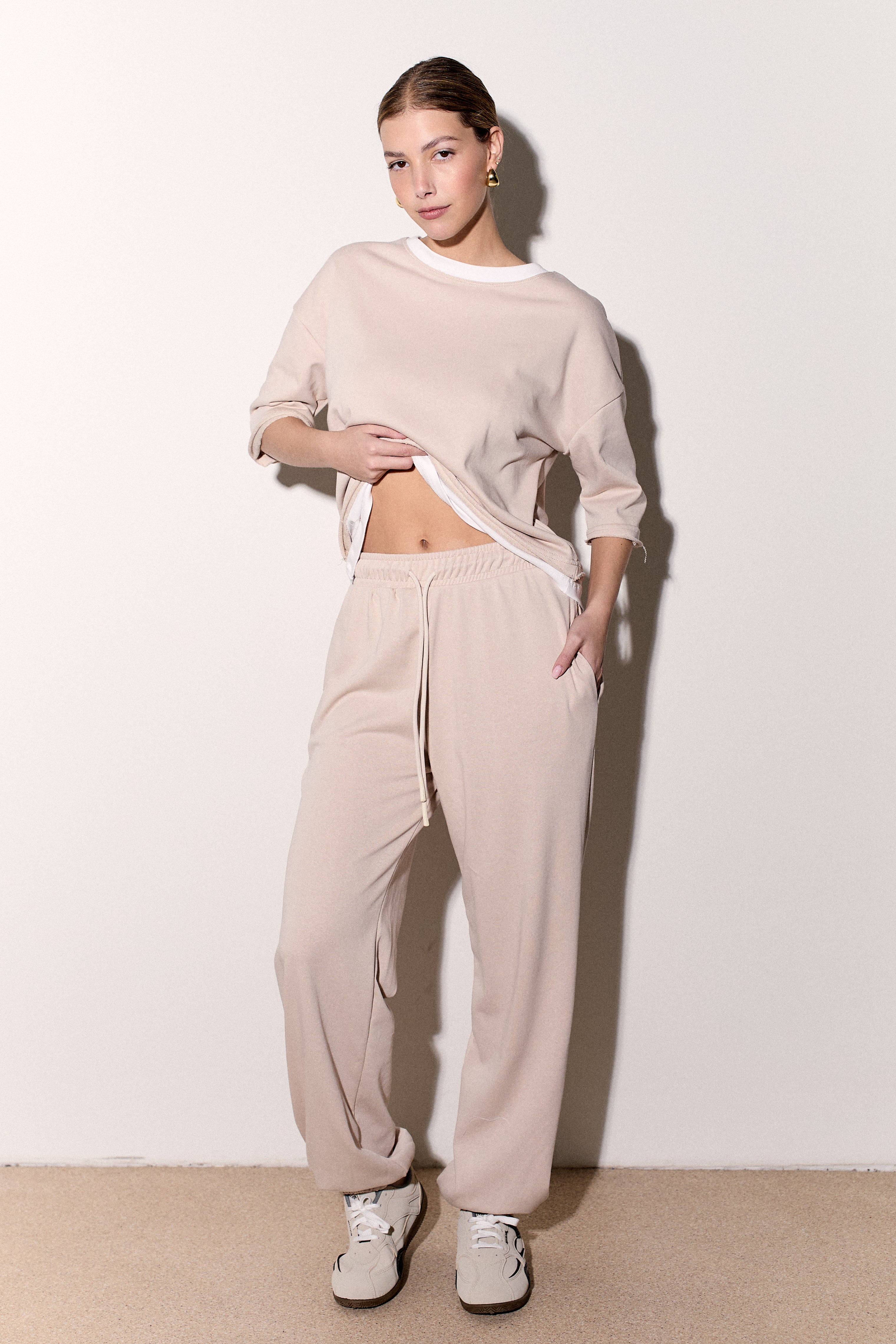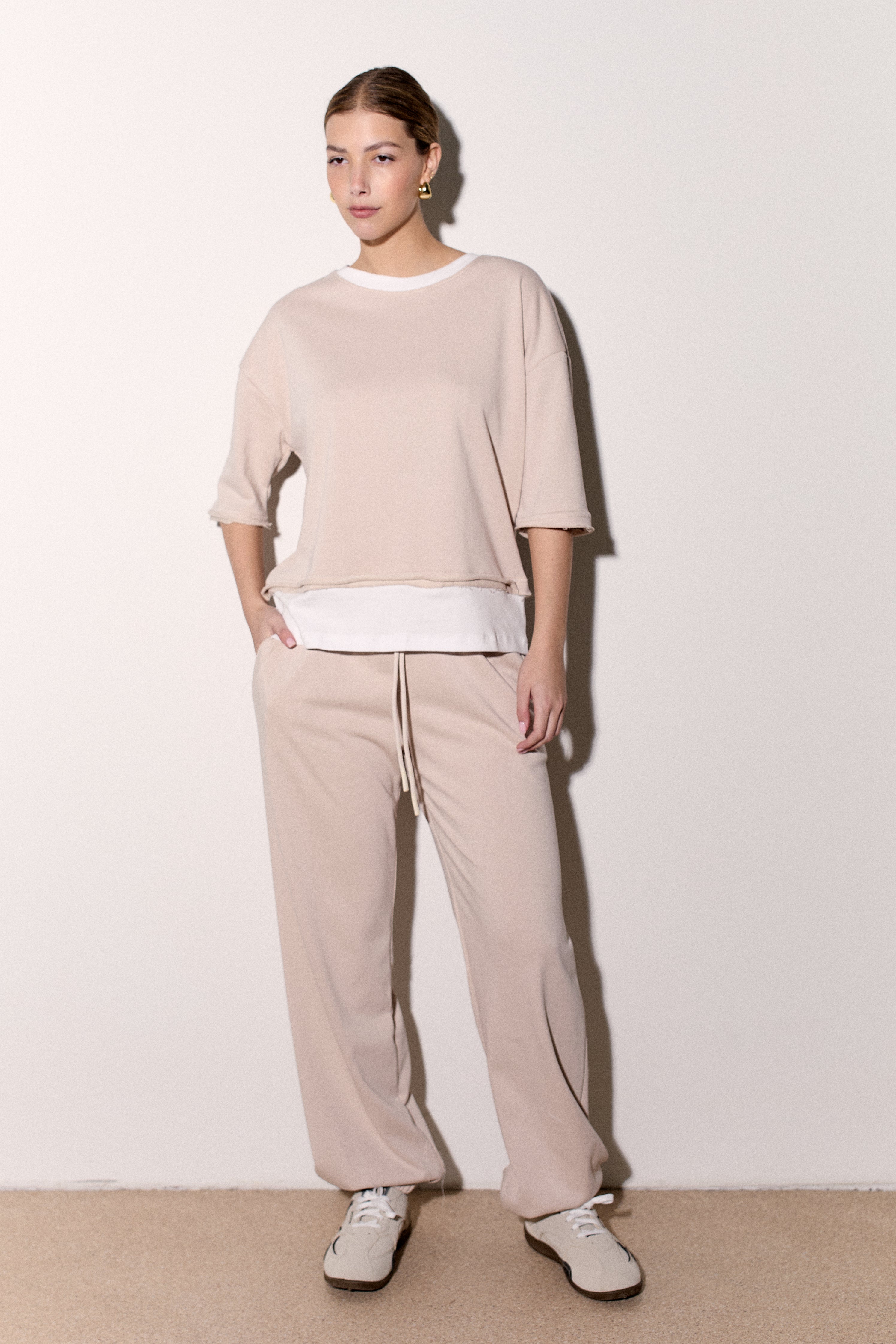 חליפת אוברסייז מבד פרנצ'טרי כותנה בשילובי בדים עם שרוולים קצרים ומכנסיים בגזרה משוחררת בסיומת גומי.