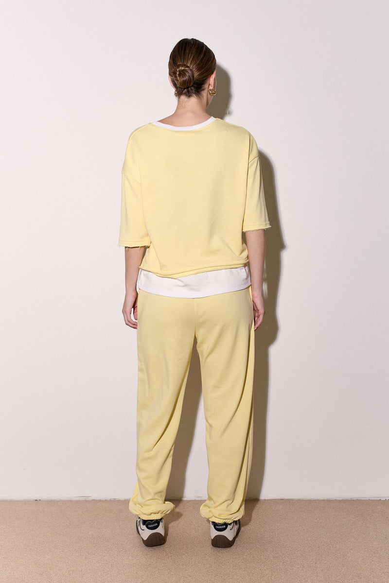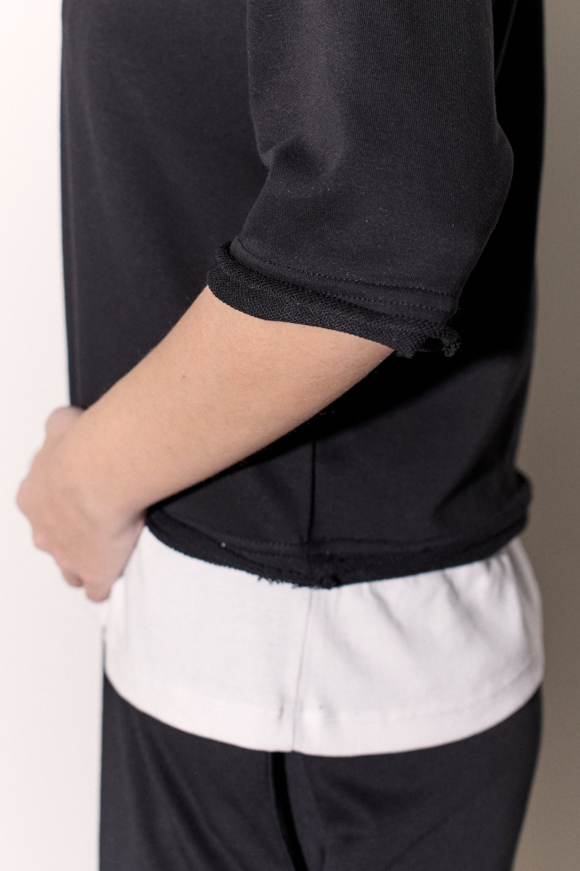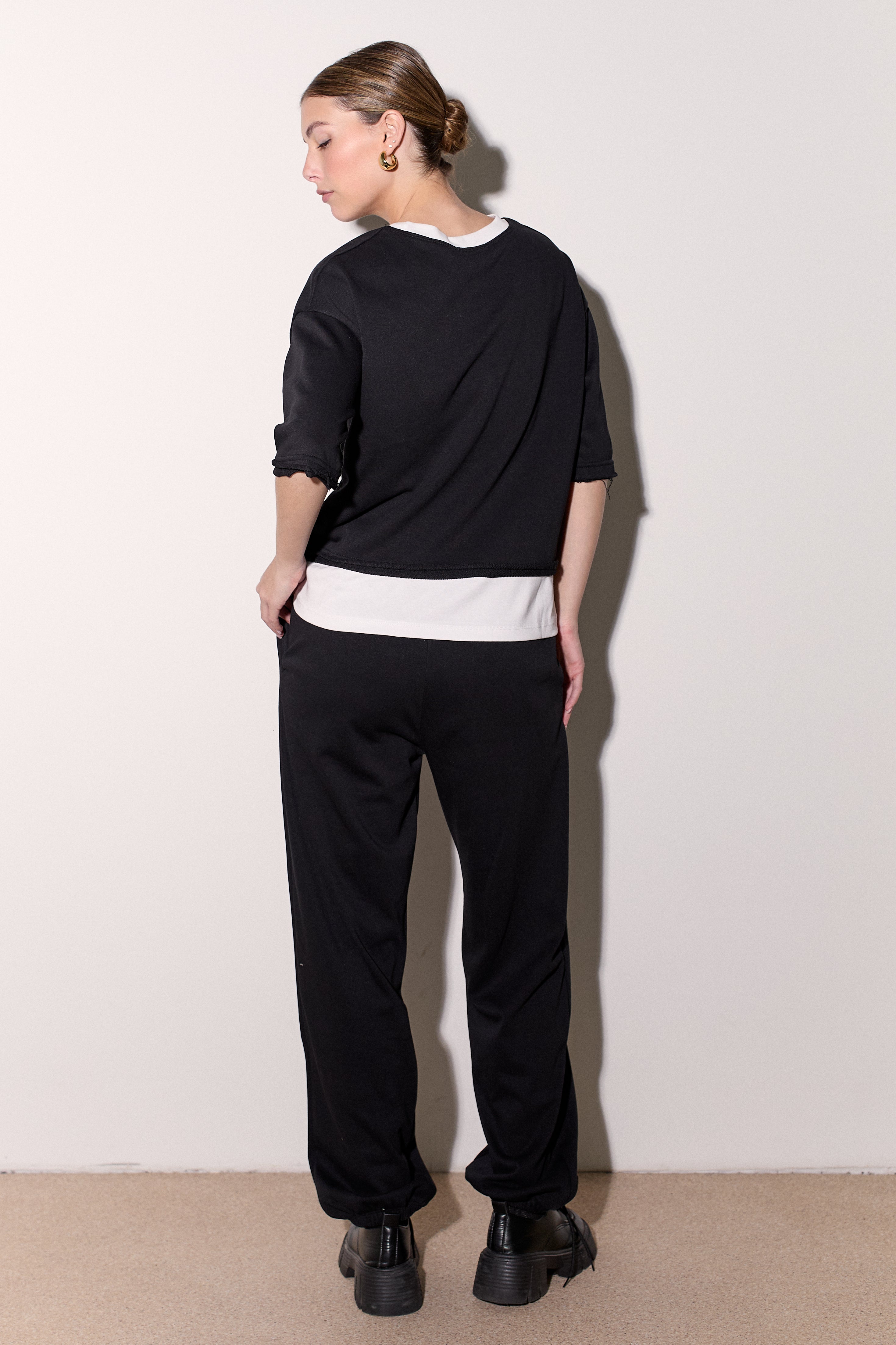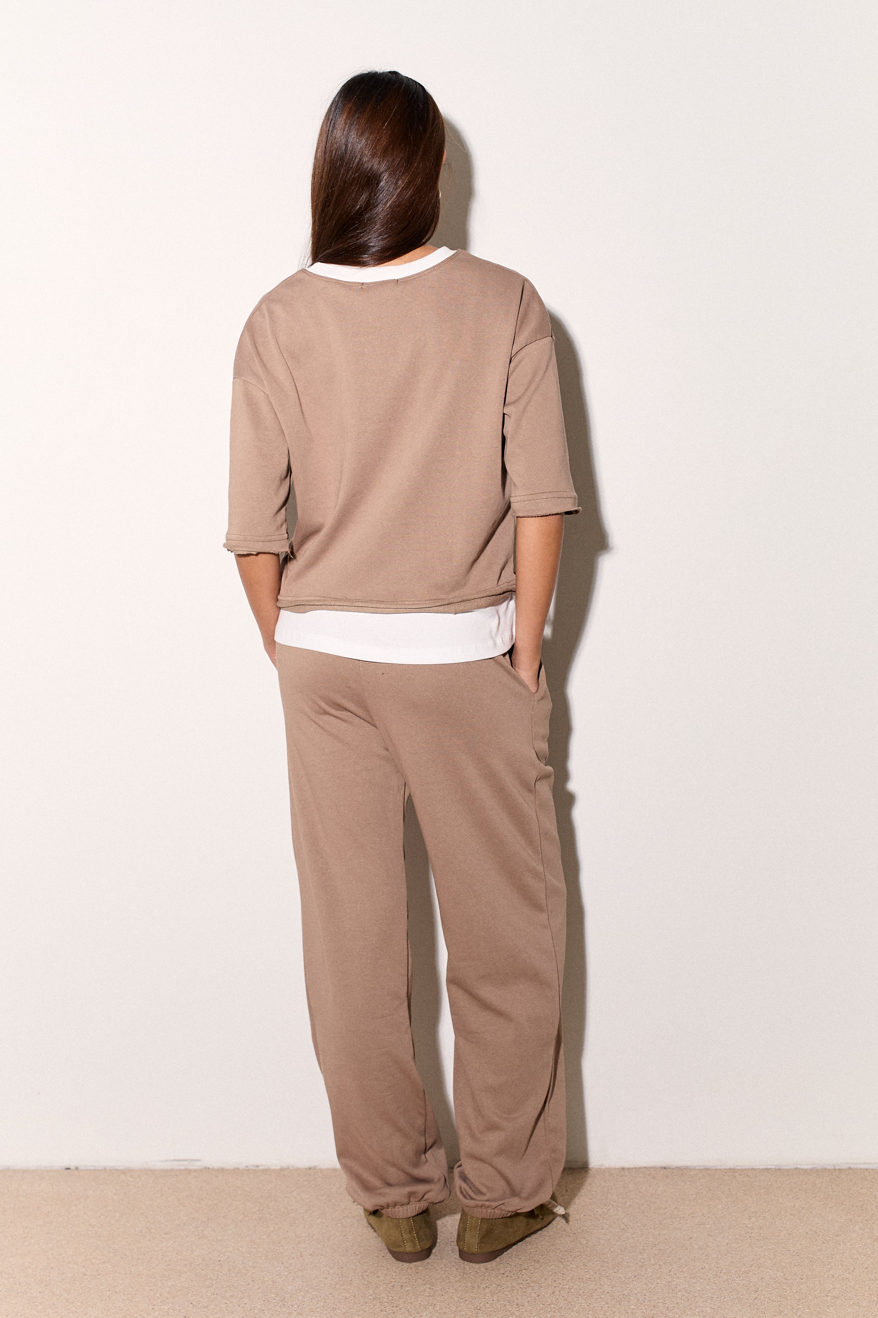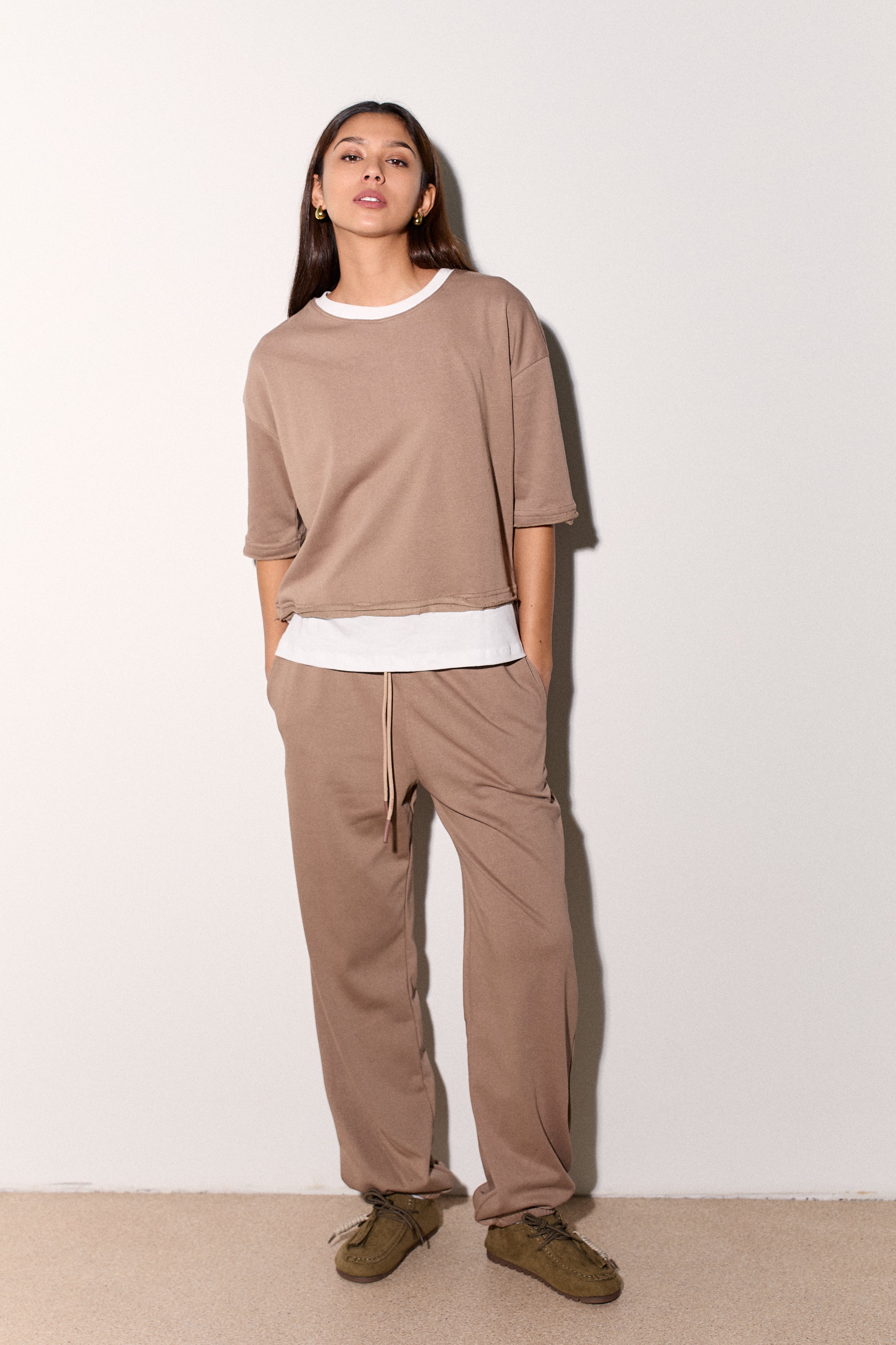 חליפת אוברסייז מבד פרנצ'טרי כותנה בשילובי בדים עם שרוולים קצרים ומכנסיים בגזרה משוחררת בסיומת גומי.