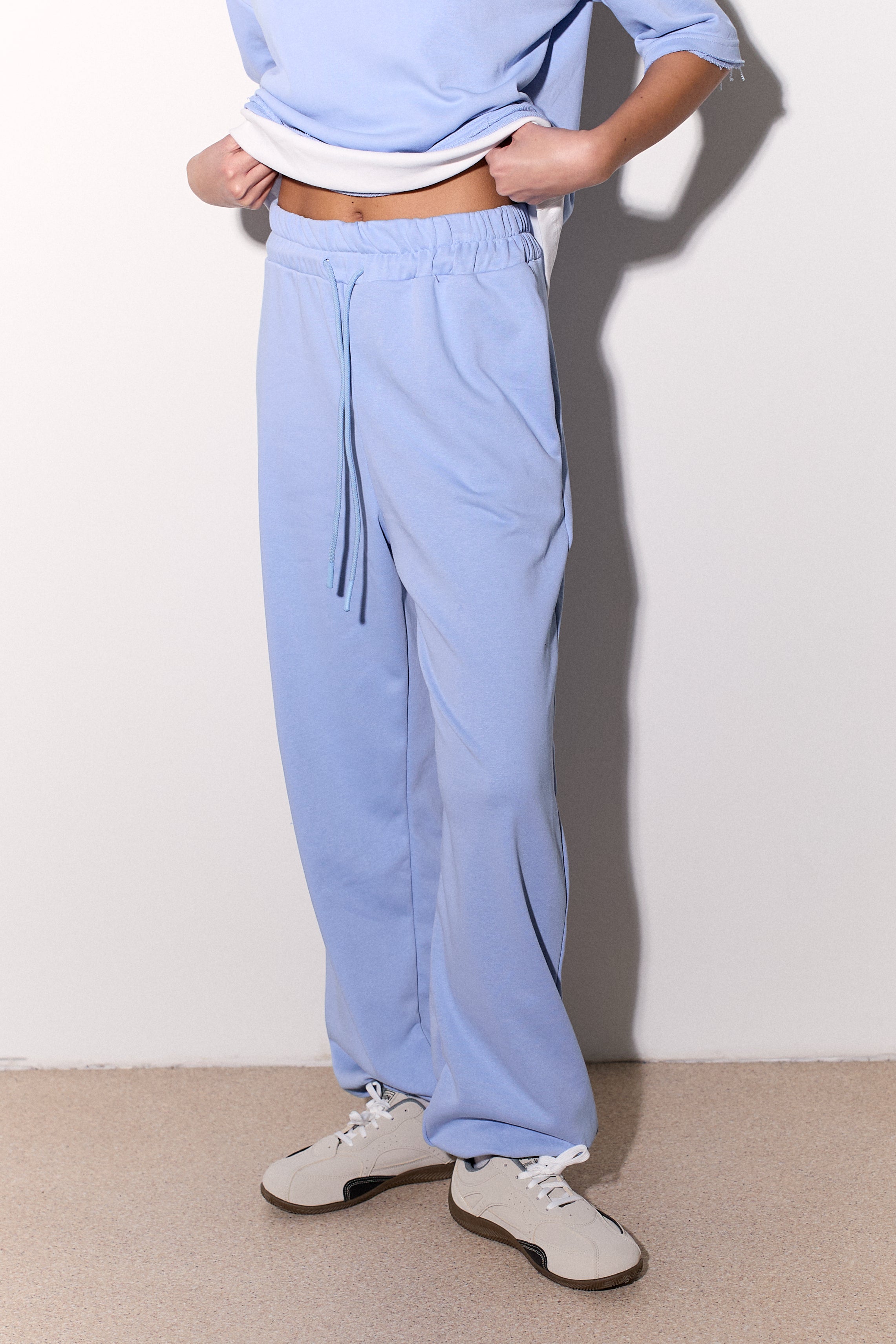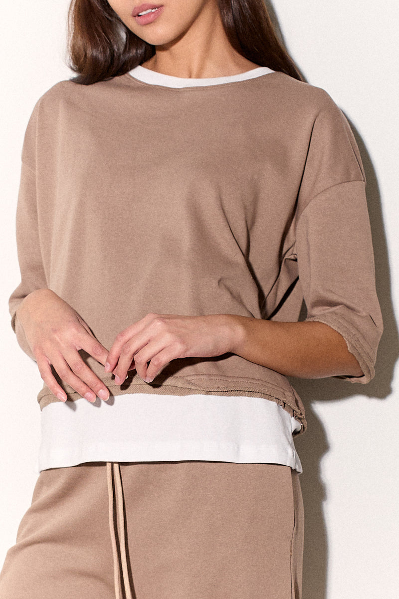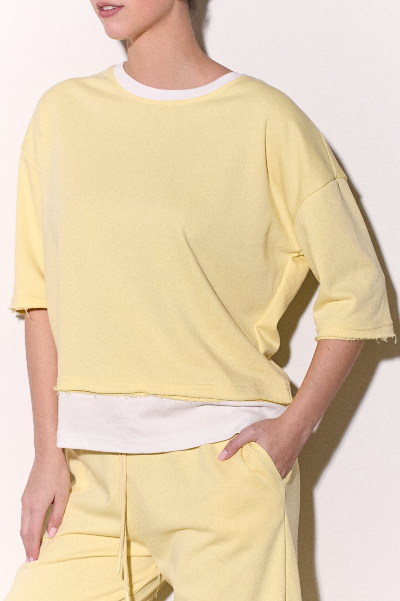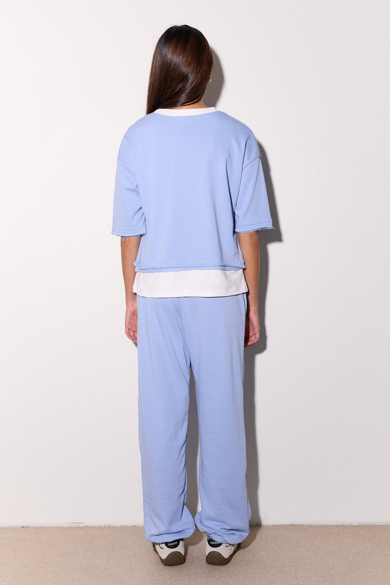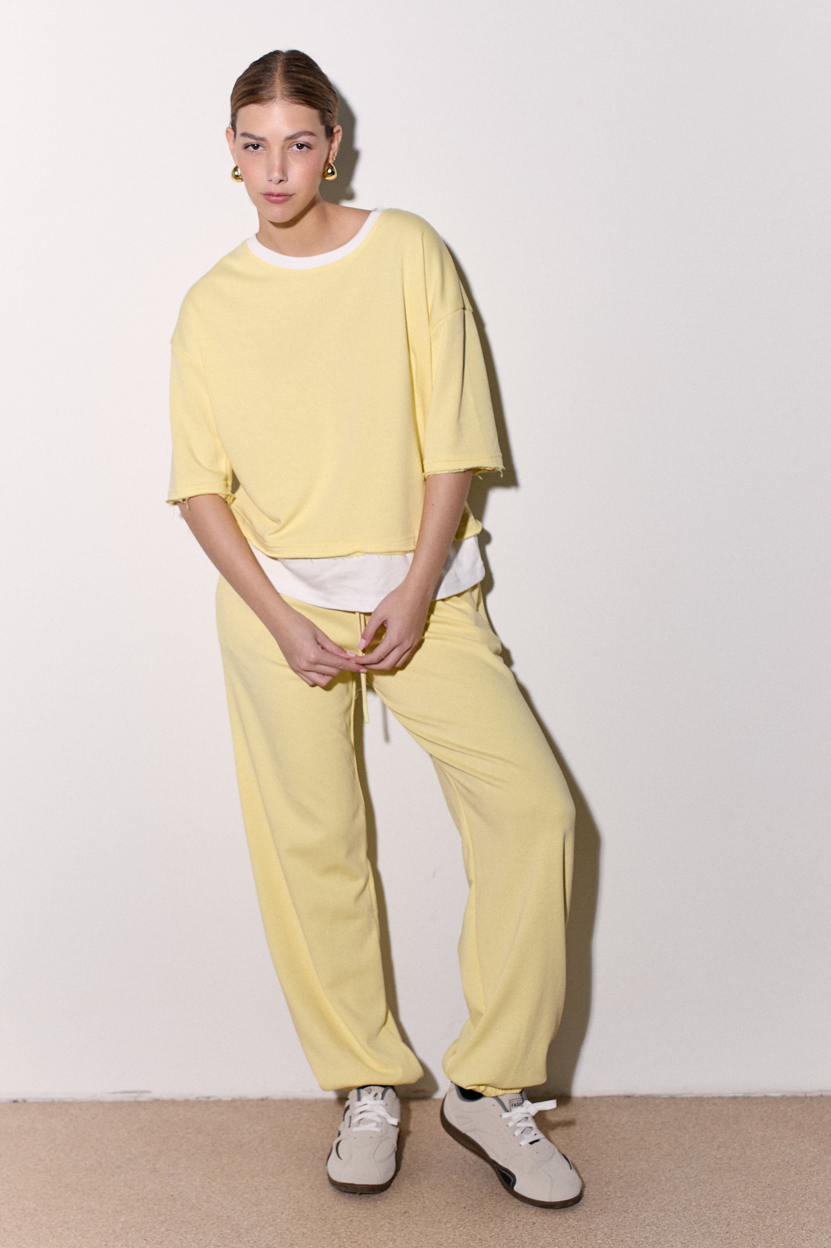 חליפת אוברסייז מבד פרנצ'טרי כותנה בשילובי בדים עם שרוולים קצרים ומכנסיים בגזרה משוחררת בסיומת גומי.