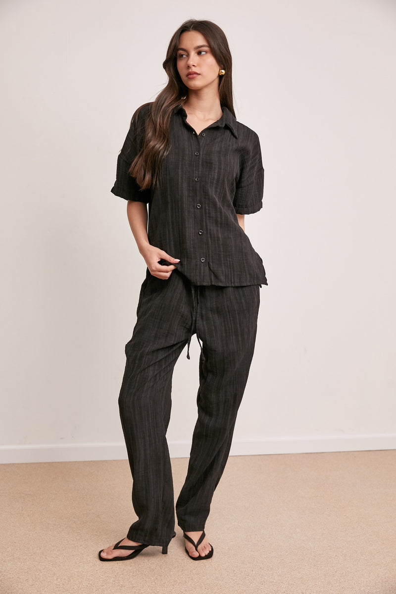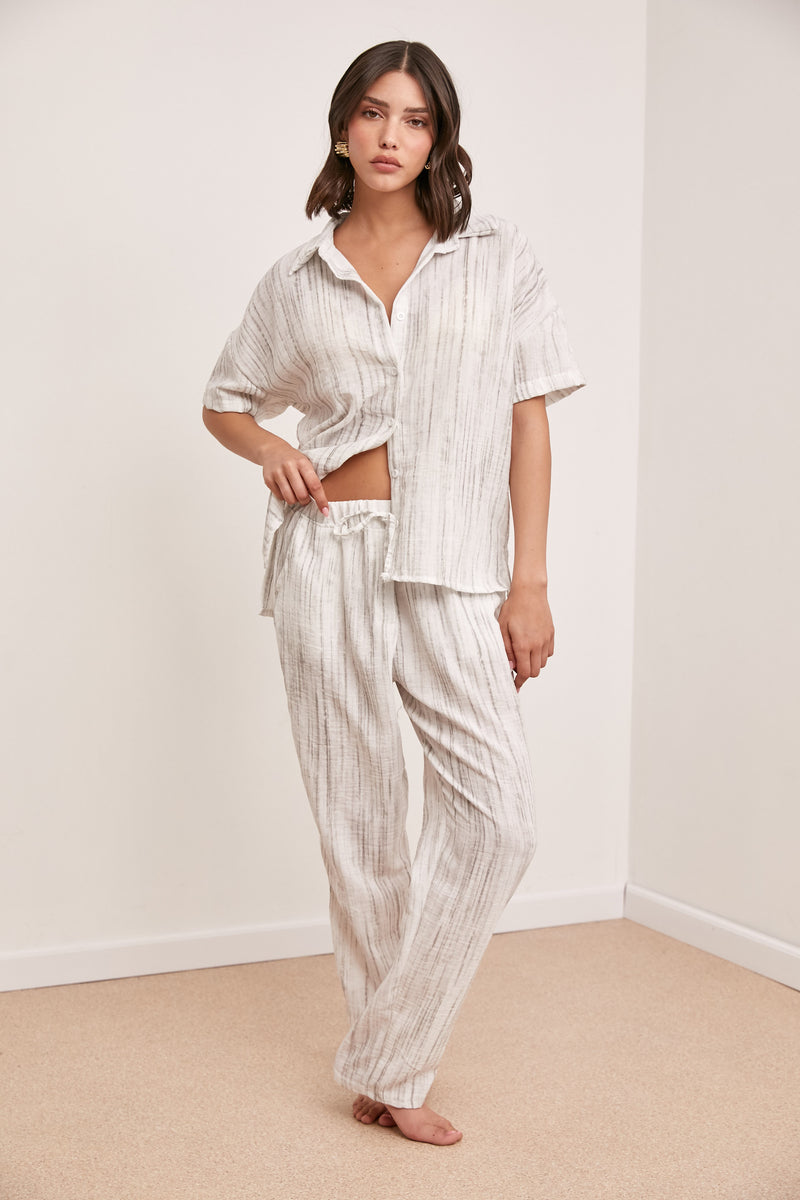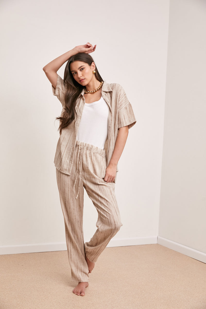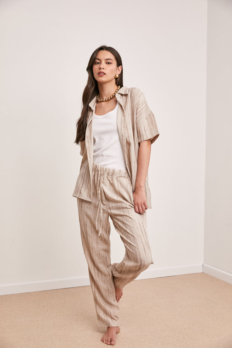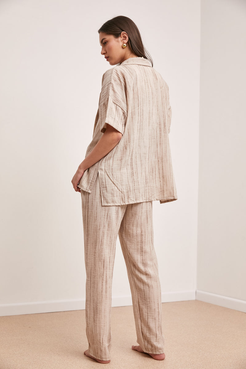 בד פשתן סופר נעים ,מכופתרת עם צווארון קלאסי ושרוולים קצרים ומכנסיים מתרחבים עם גומי במותן ושרוך קשירה .