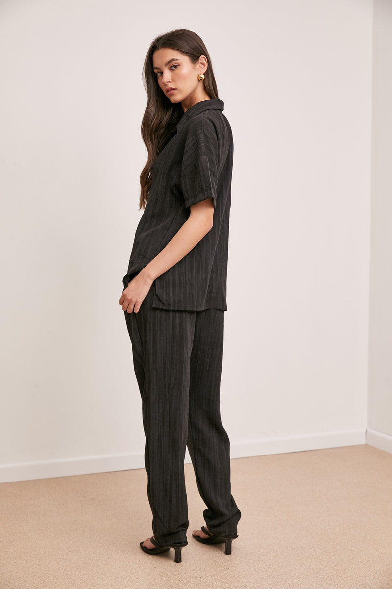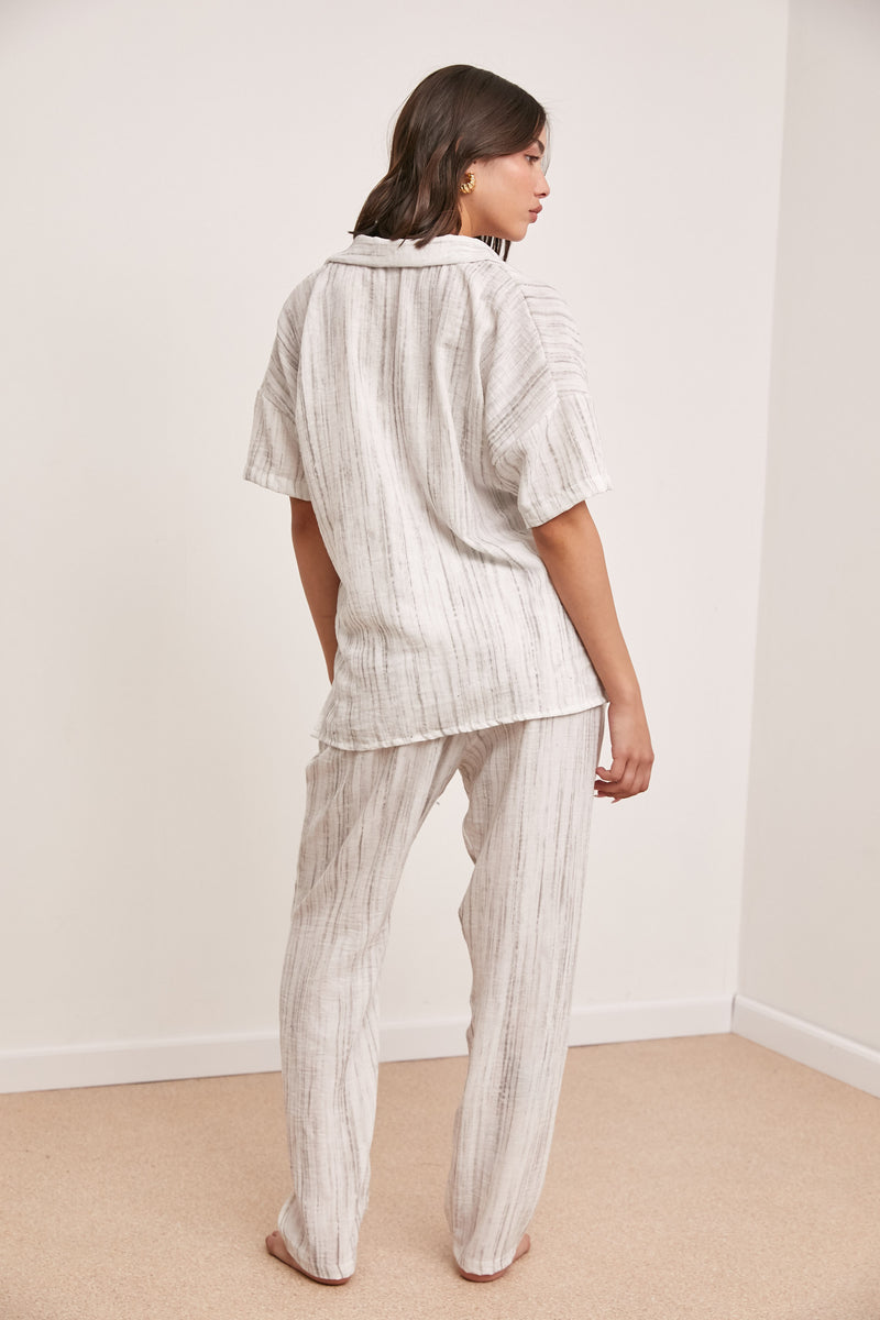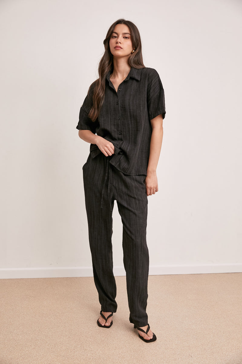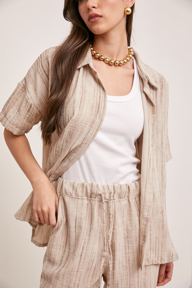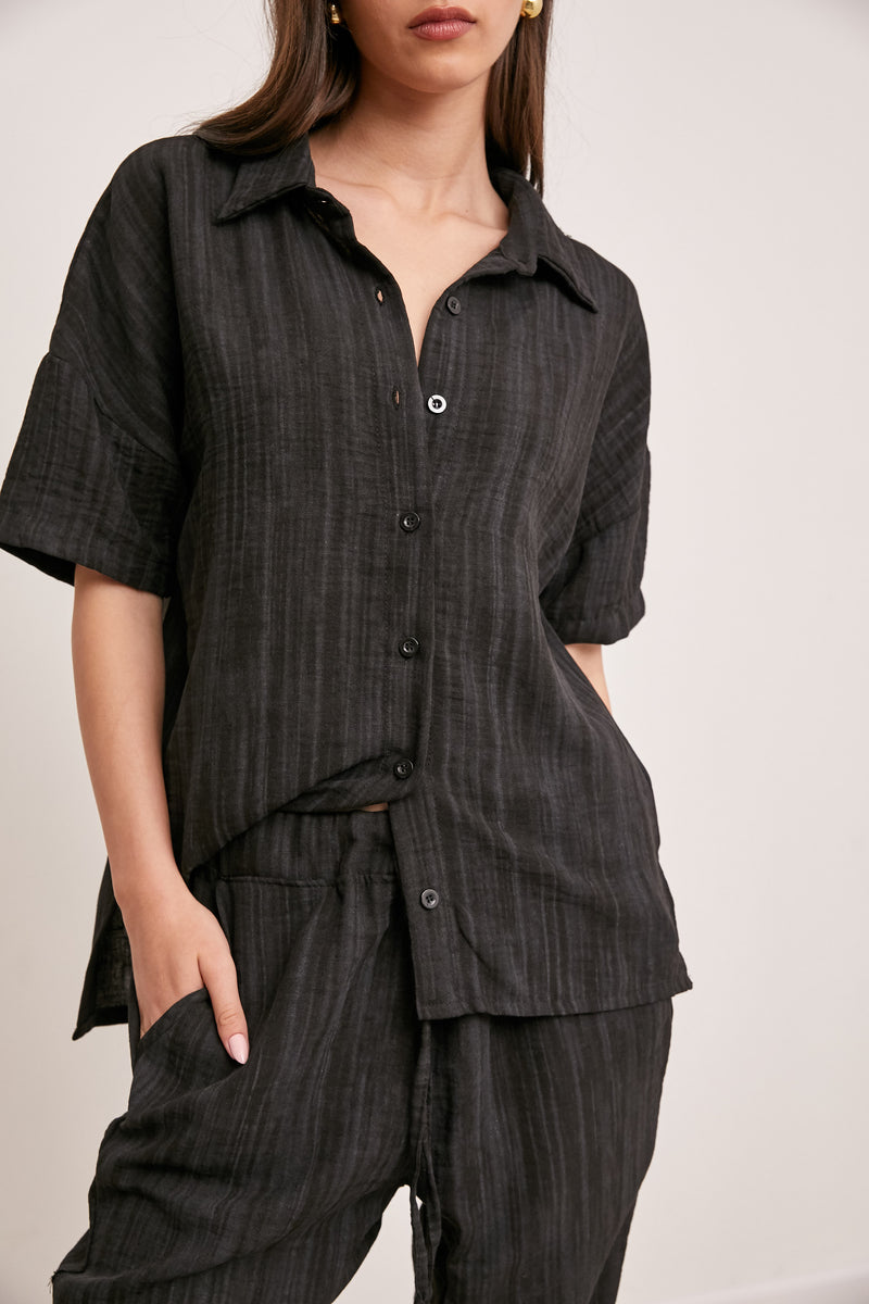 בד פשתן סופר נעים ,מכופתרת עם צווארון קלאסי ושרוולים קצרים ומכנסיים מתרחבים עם גומי במותן ושרוך קשירה .