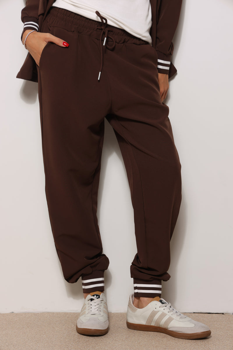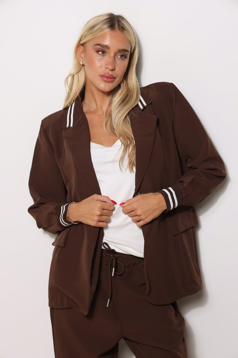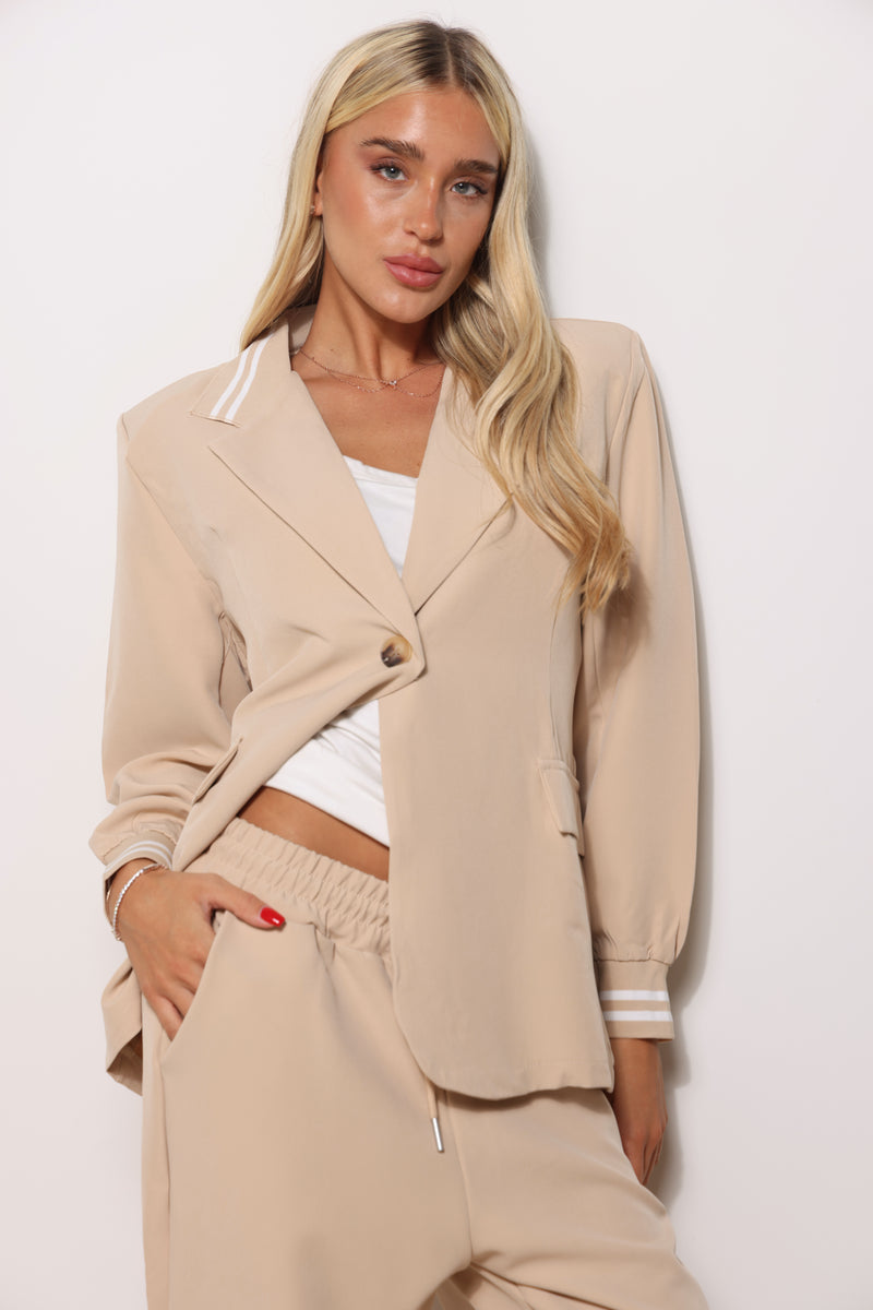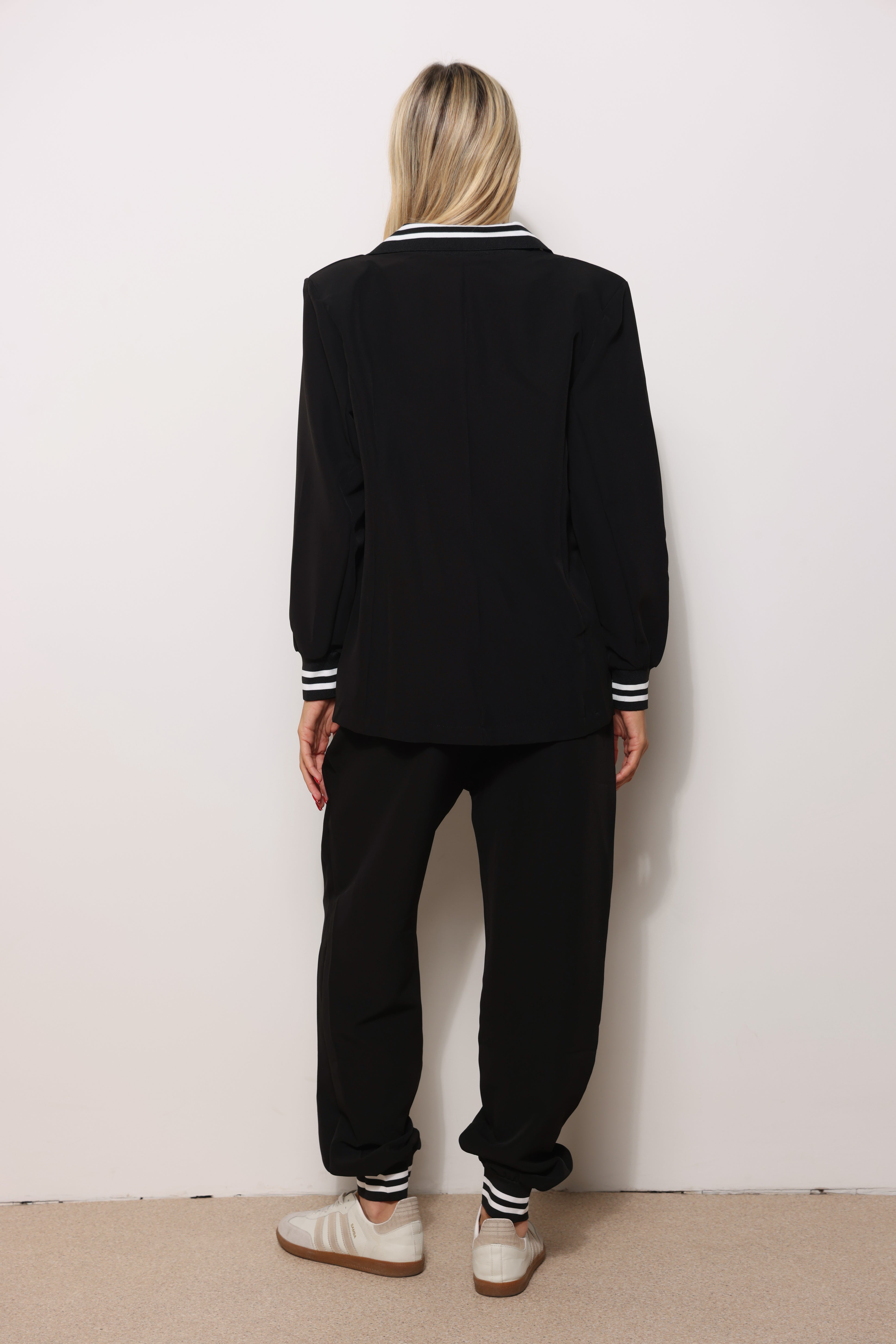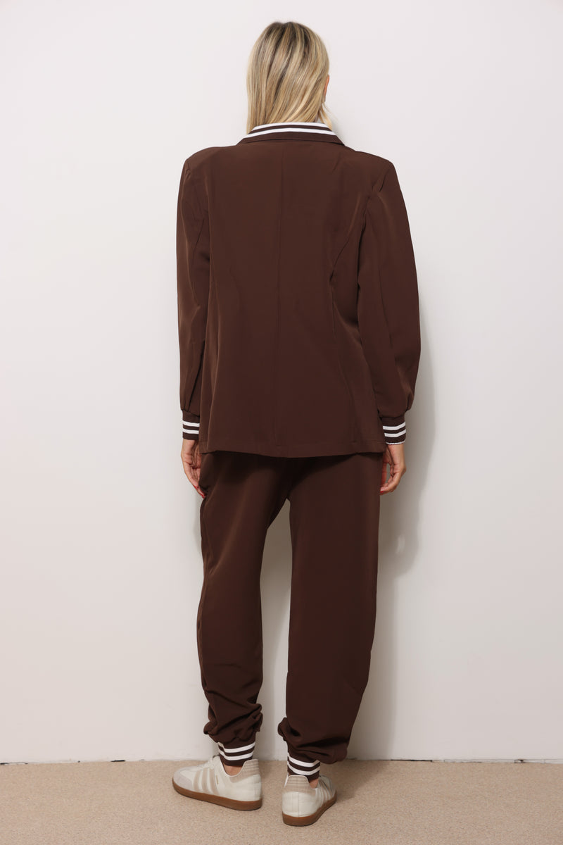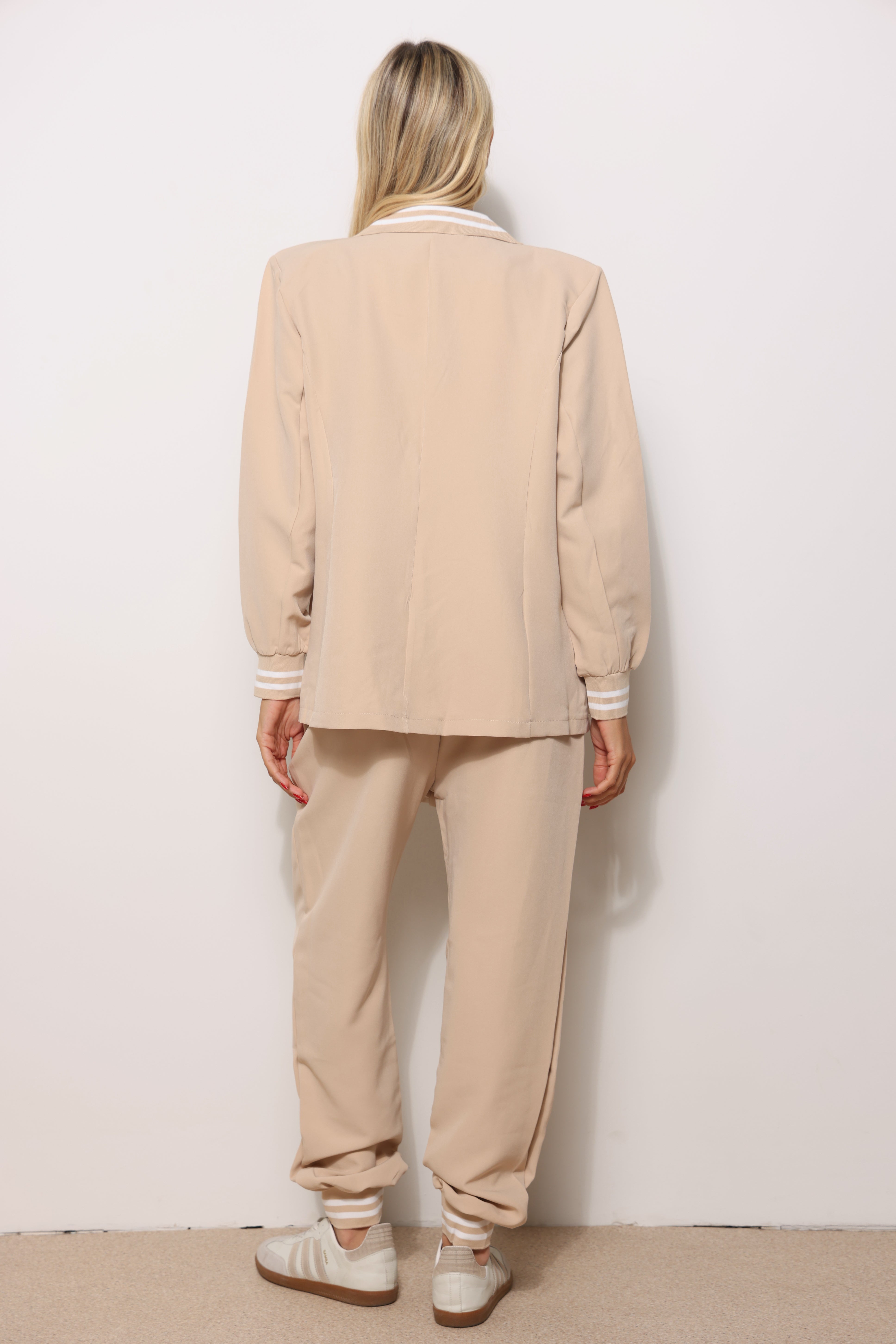 חליפה אלגנטית מבד קומו המורכבת מטופ בלייזר עם מנג'ט בשרוול ומכנסיים עם שרוך קשירה כיסים צידיים וגומי במותן.