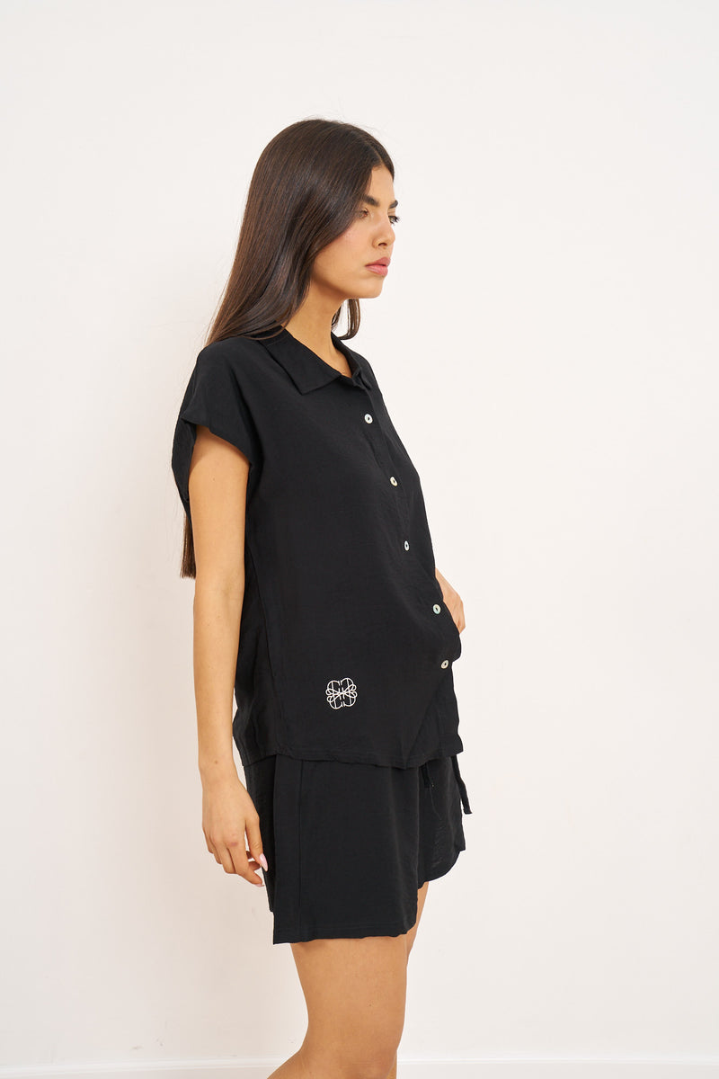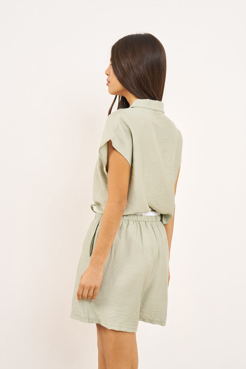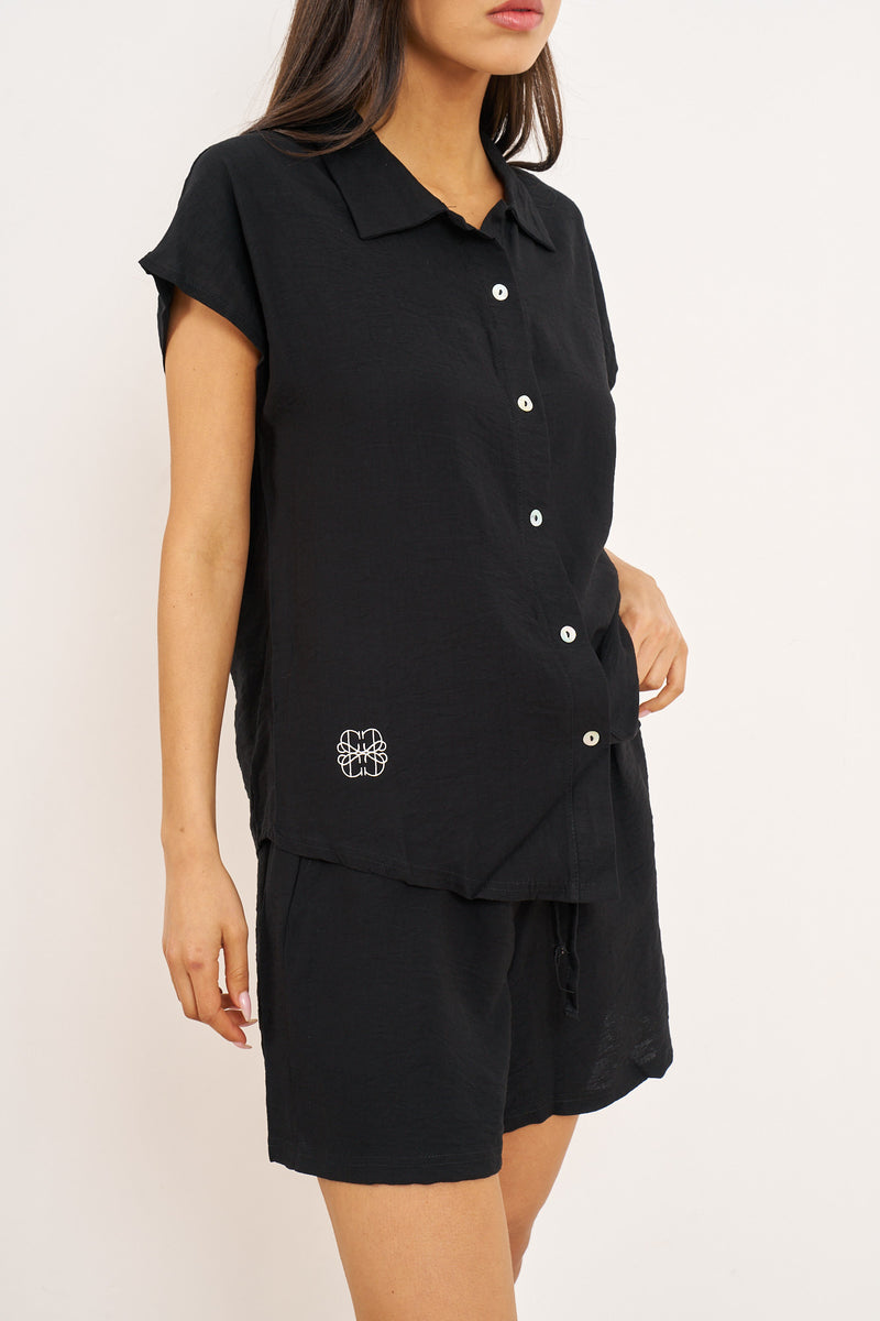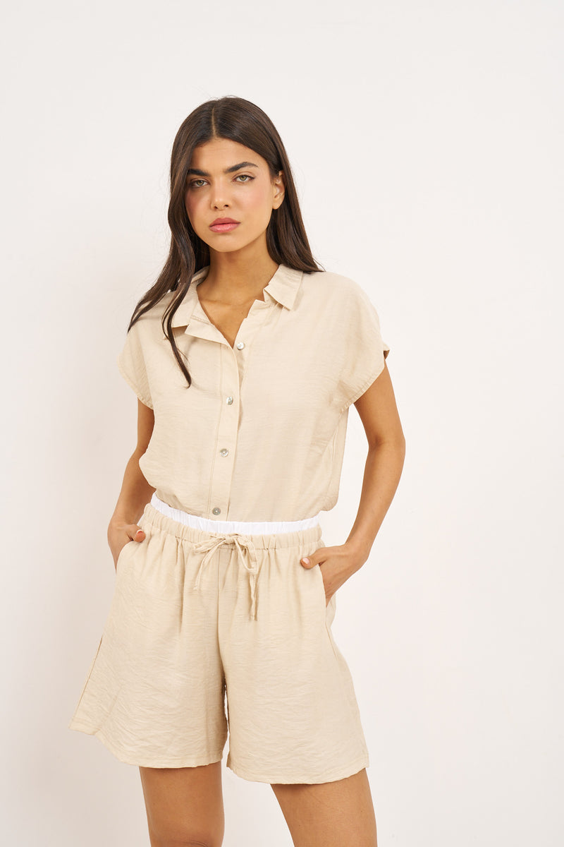 חליפה מבד קרפ - שורט משוחרר עם כיסים צידיים גומי במותן ,שרוך קשירה וכיסים צידיים וחולצה מכופתרת עם צווארון קלאסי ושרוולים קצרים.