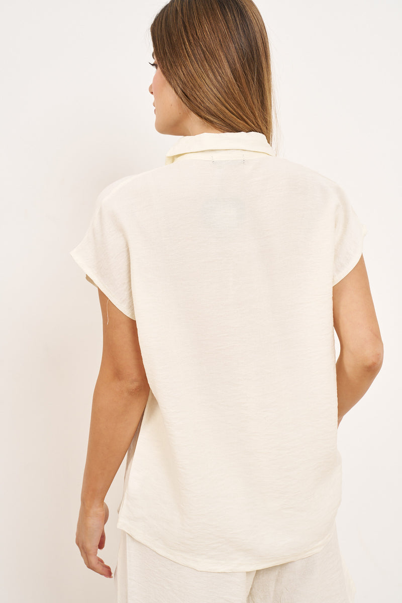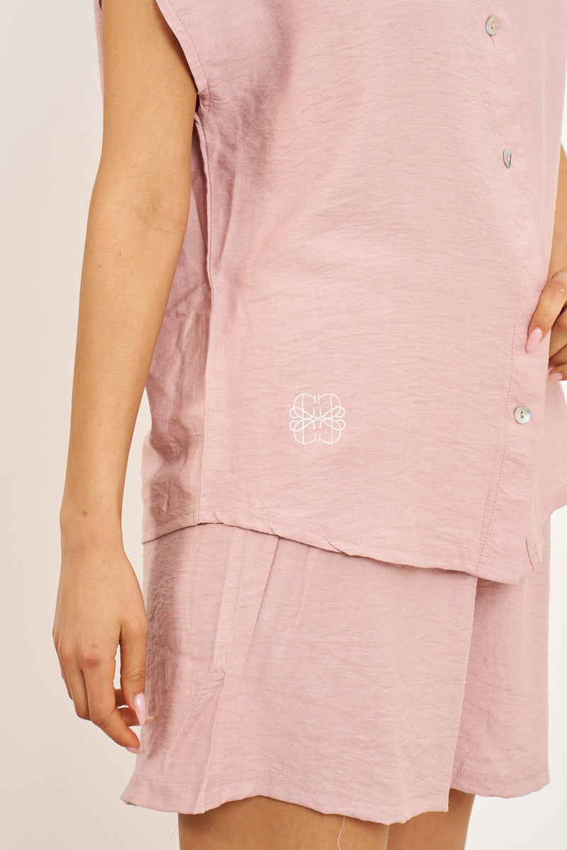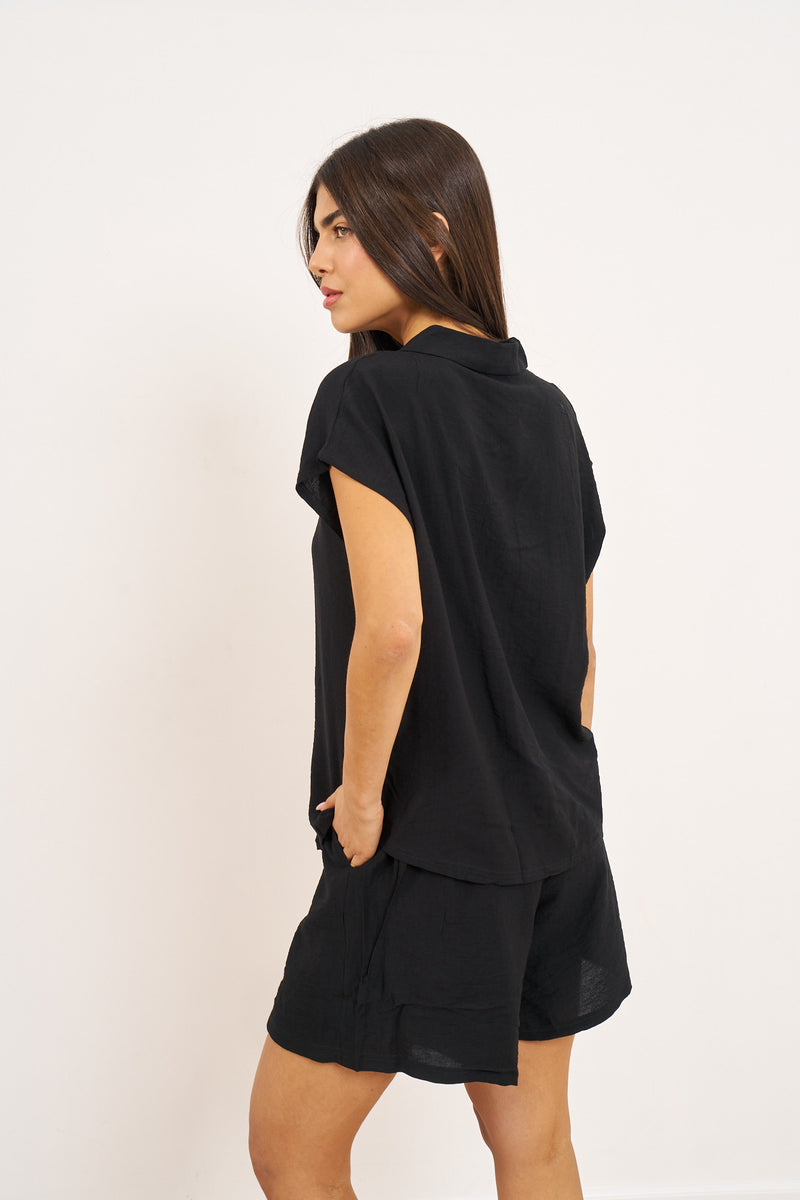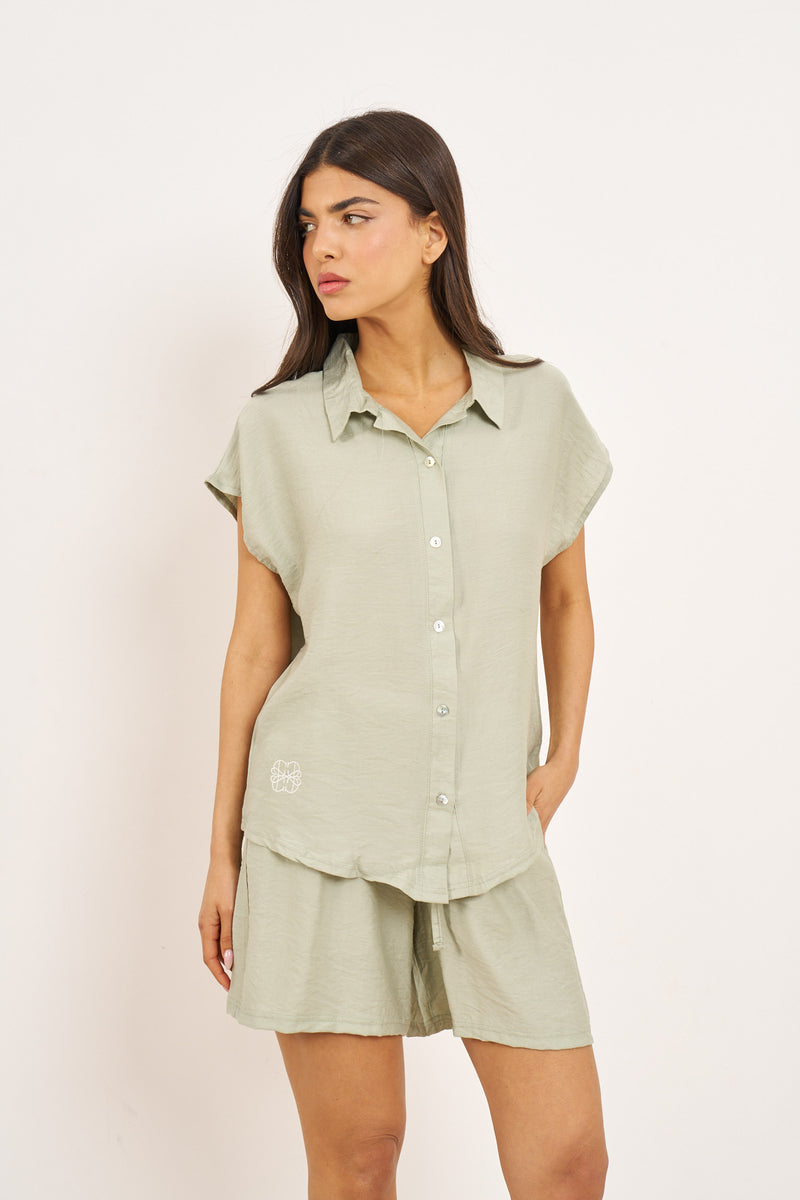 חליפה מבד קרפ - שורט משוחרר עם כיסים צידיים גומי במותן ,שרוך קשירה וכיסים צידיים וחולצה מכופתרת עם צווארון קלאסי ושרוולים קצרים.