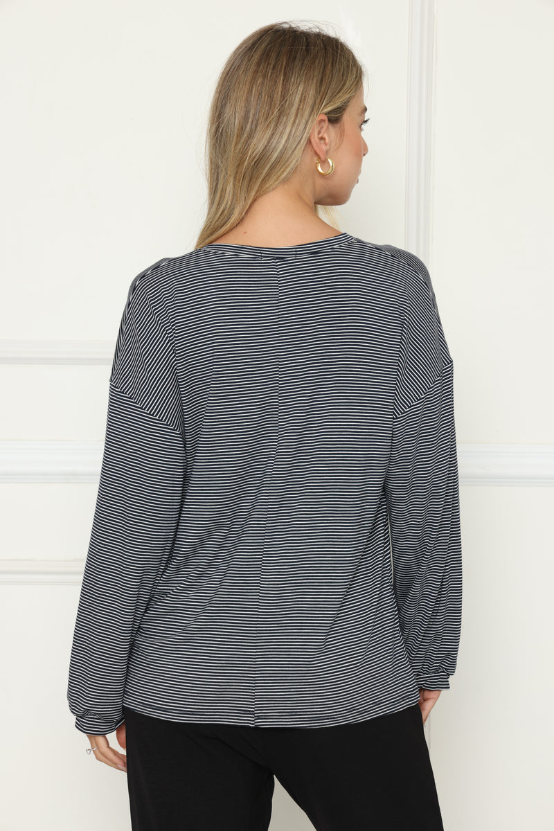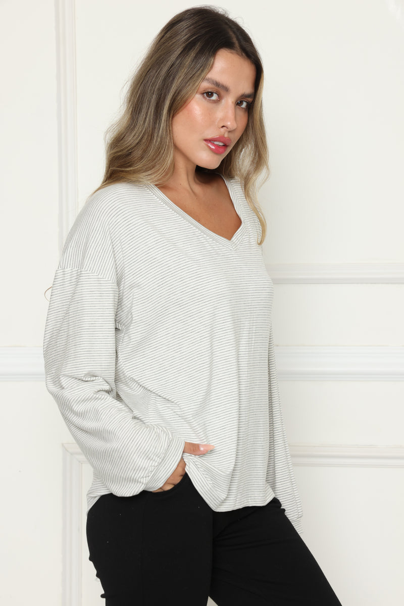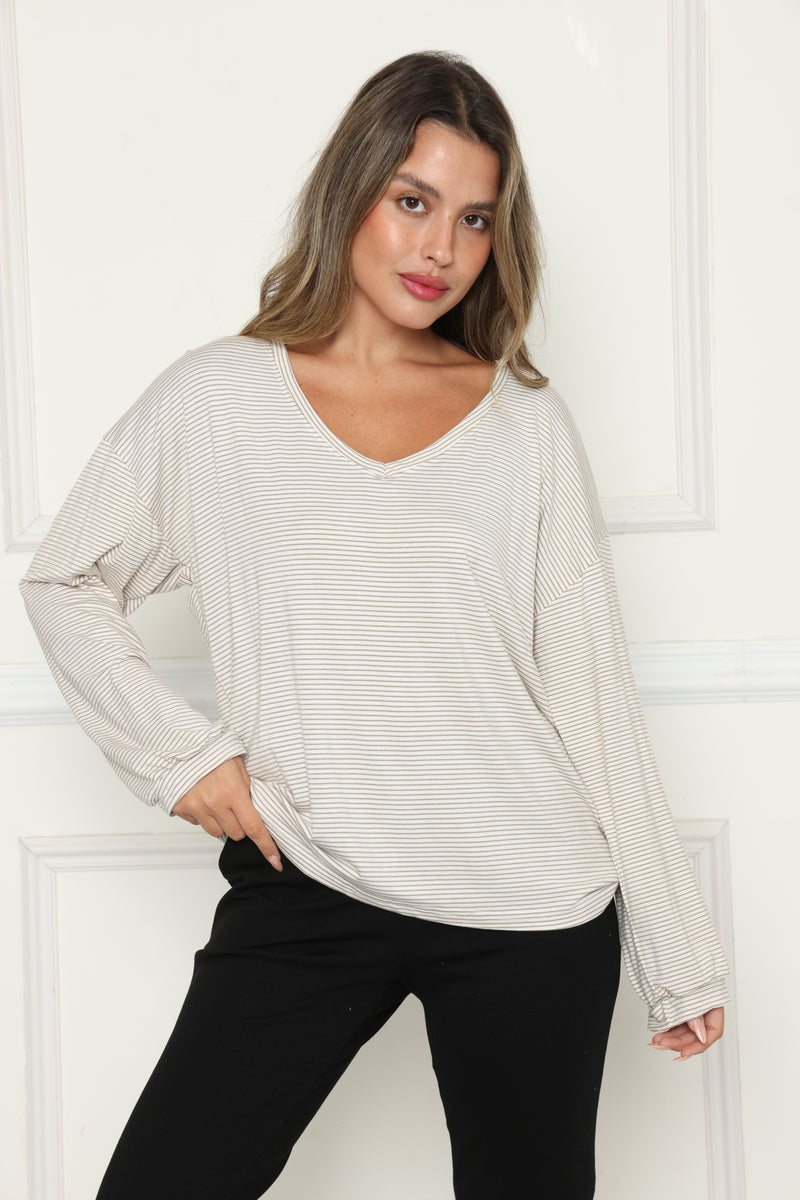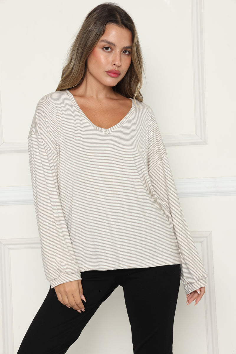 חולצת בייסיק רחבה מבד כותנה במגע רך עם דפוס פסים, צווארון וי עמוק.