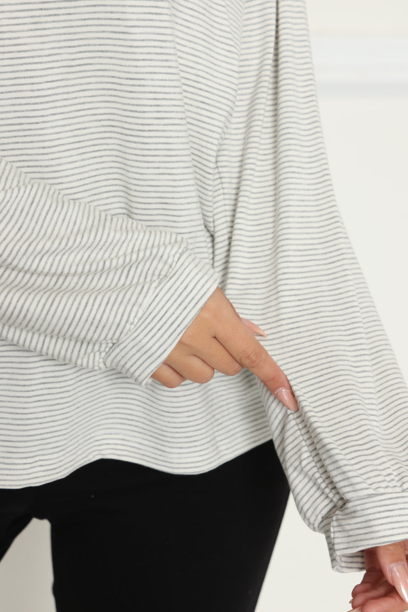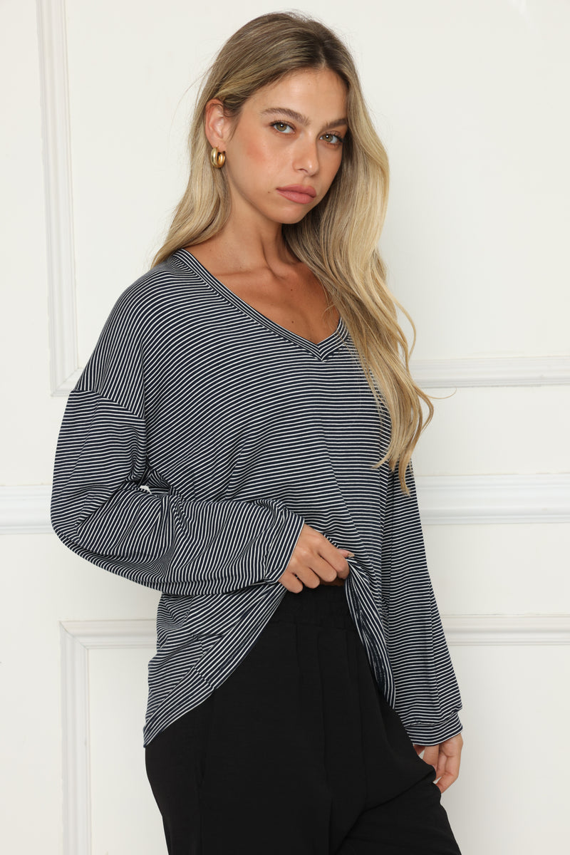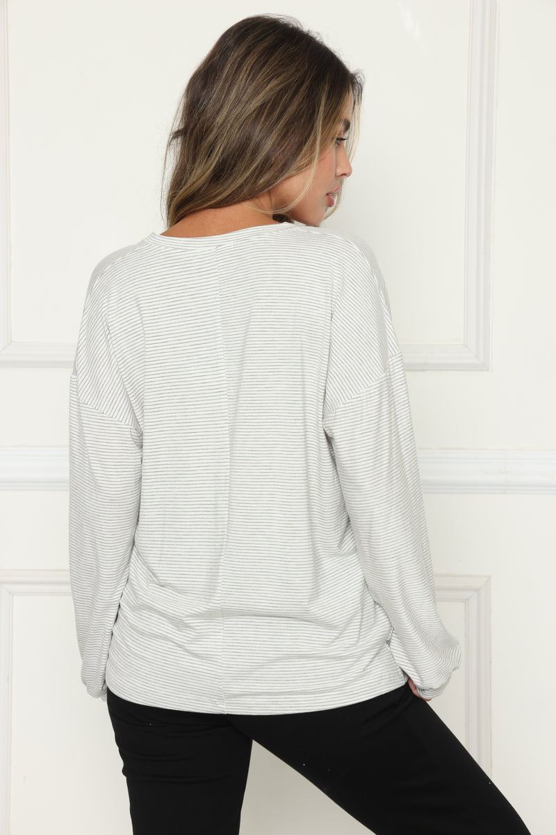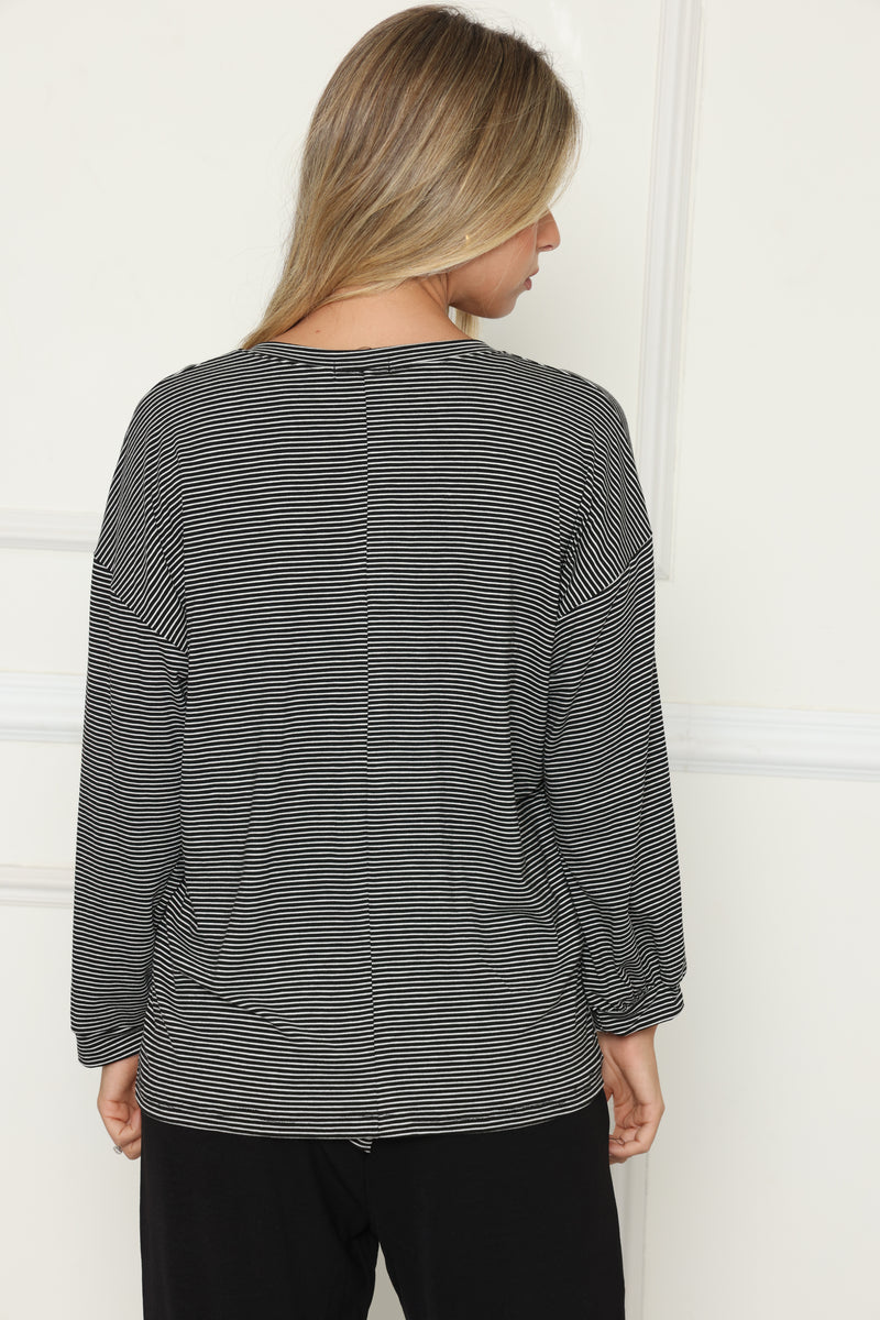 חולצת בייסיק רחבה מבד כותנה במגע רך עם דפוס פסים, צווארון וי עמוק.
