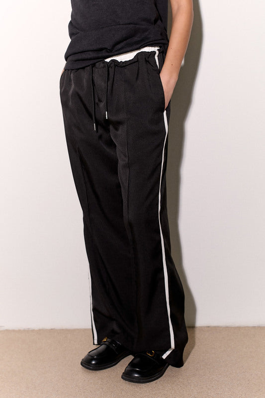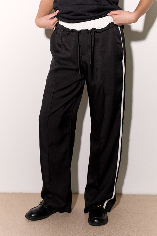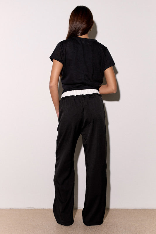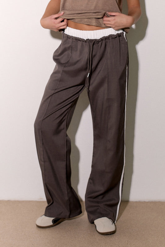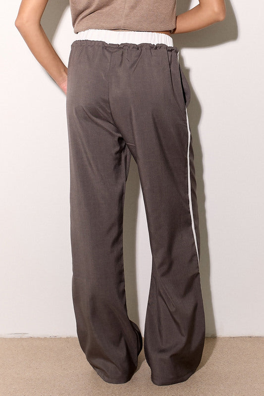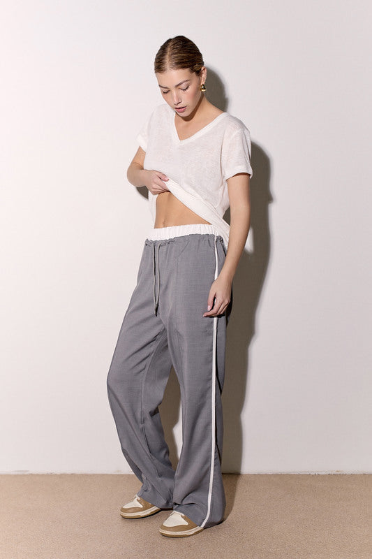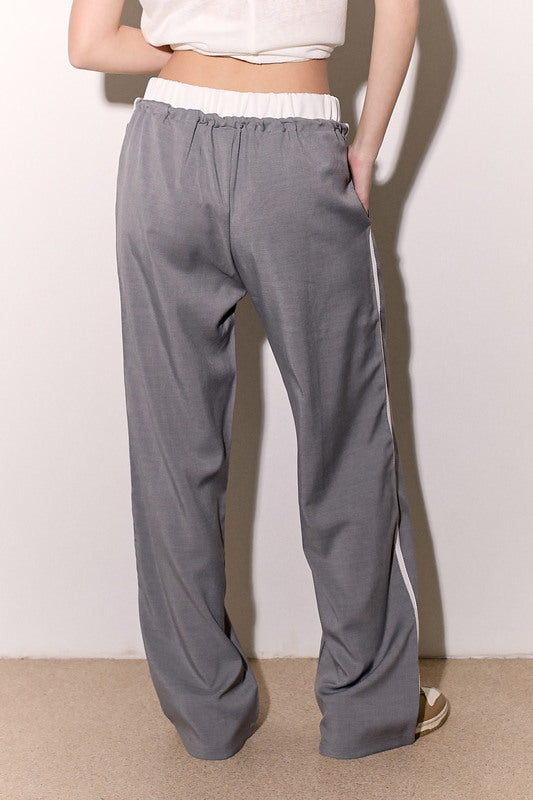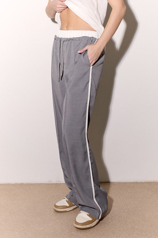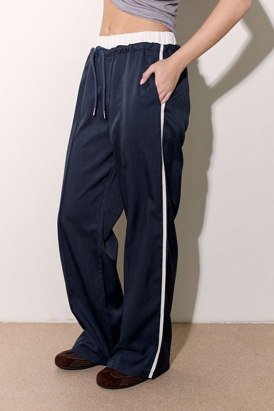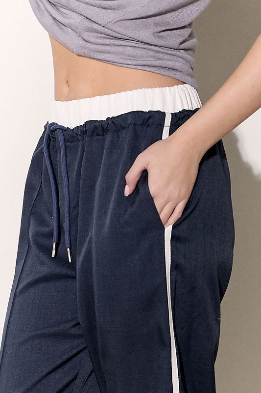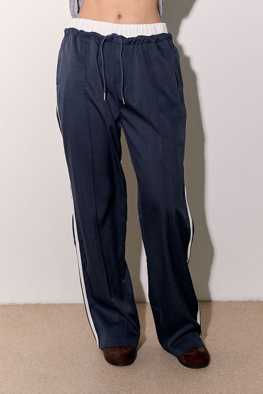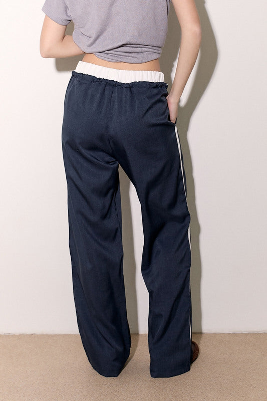 מכנסיים אלגנטיים מבד ג'ינס לייקרה עם חגורה לבנה, שרוך קשירה וכיסים צידיים.