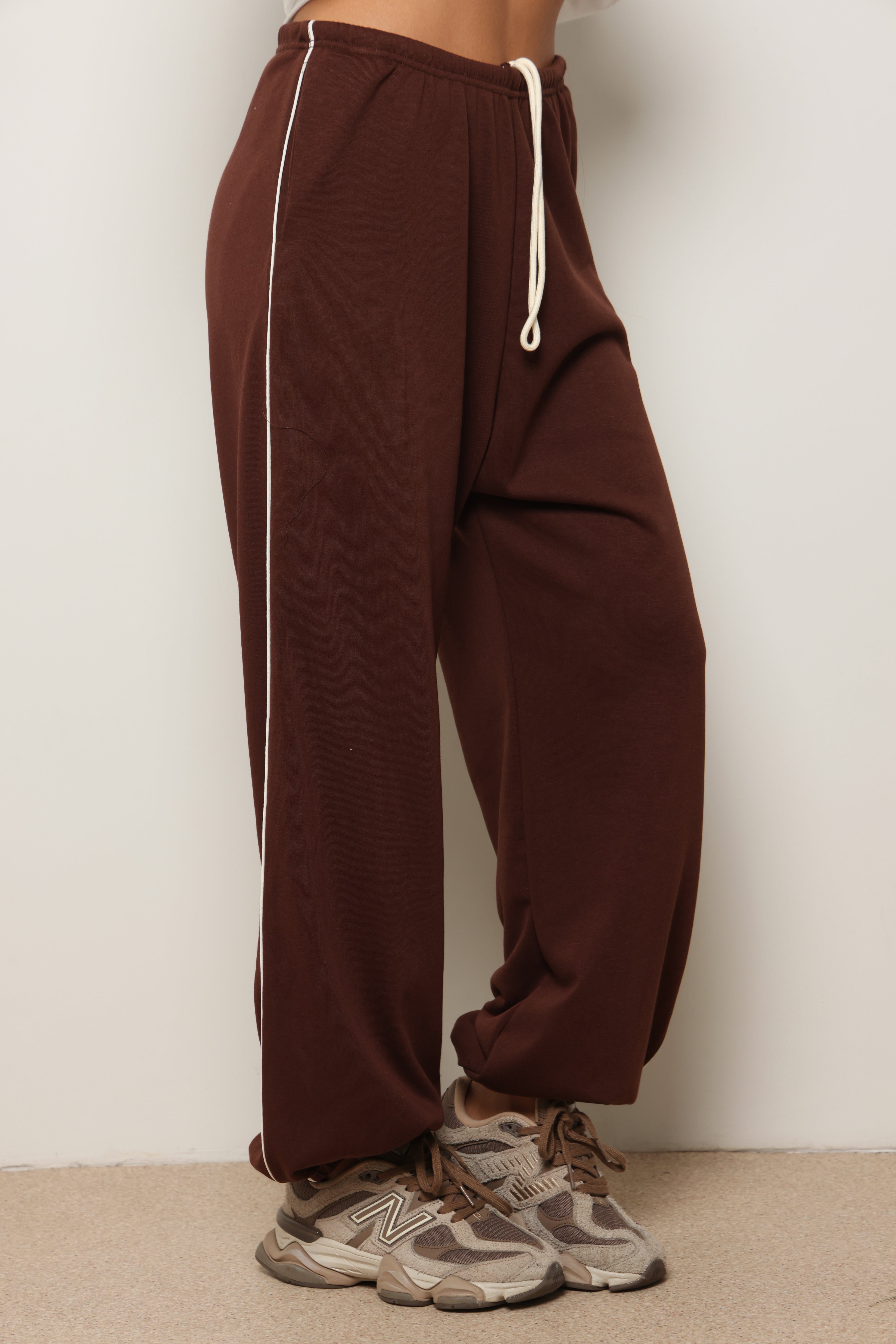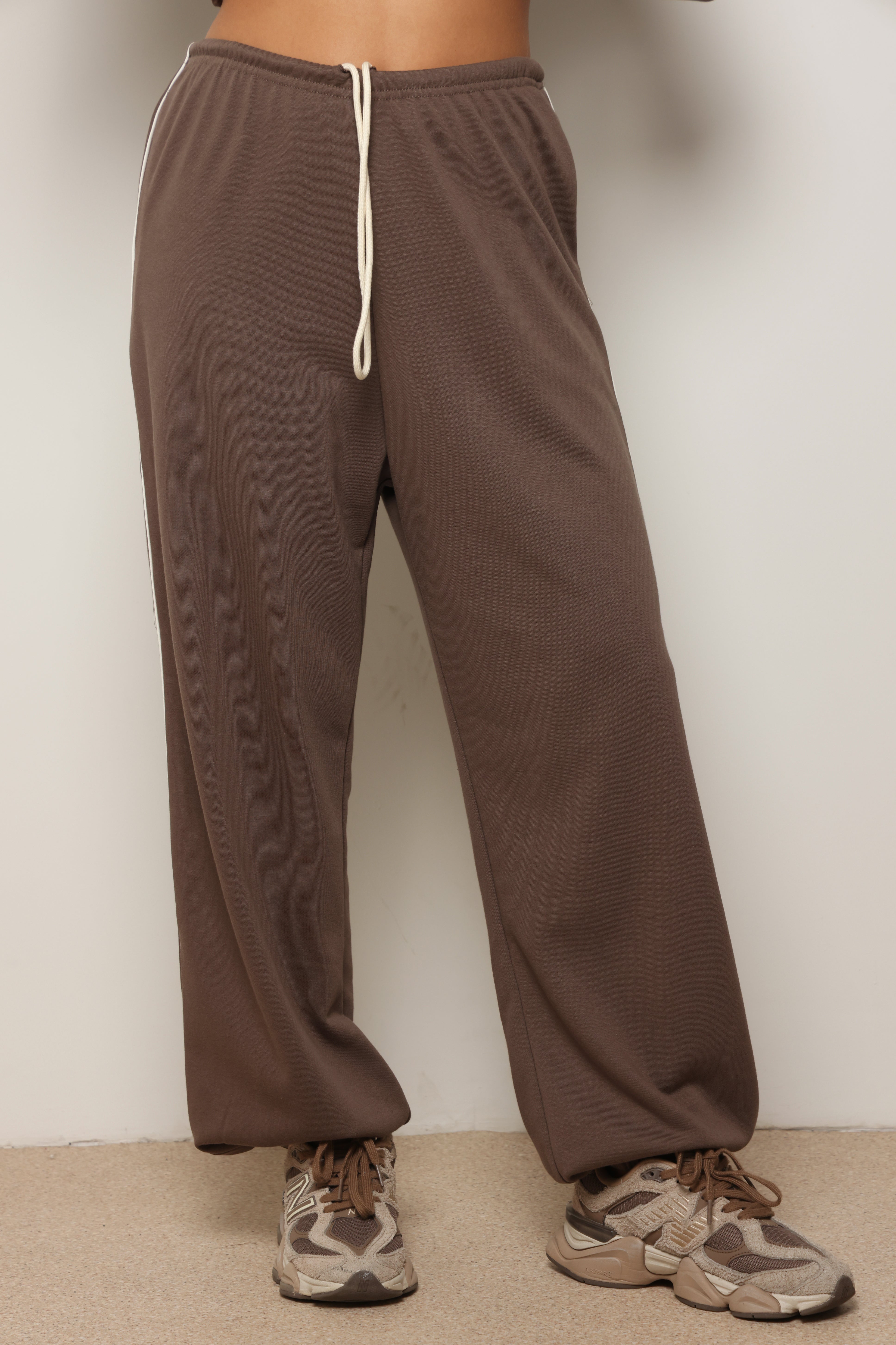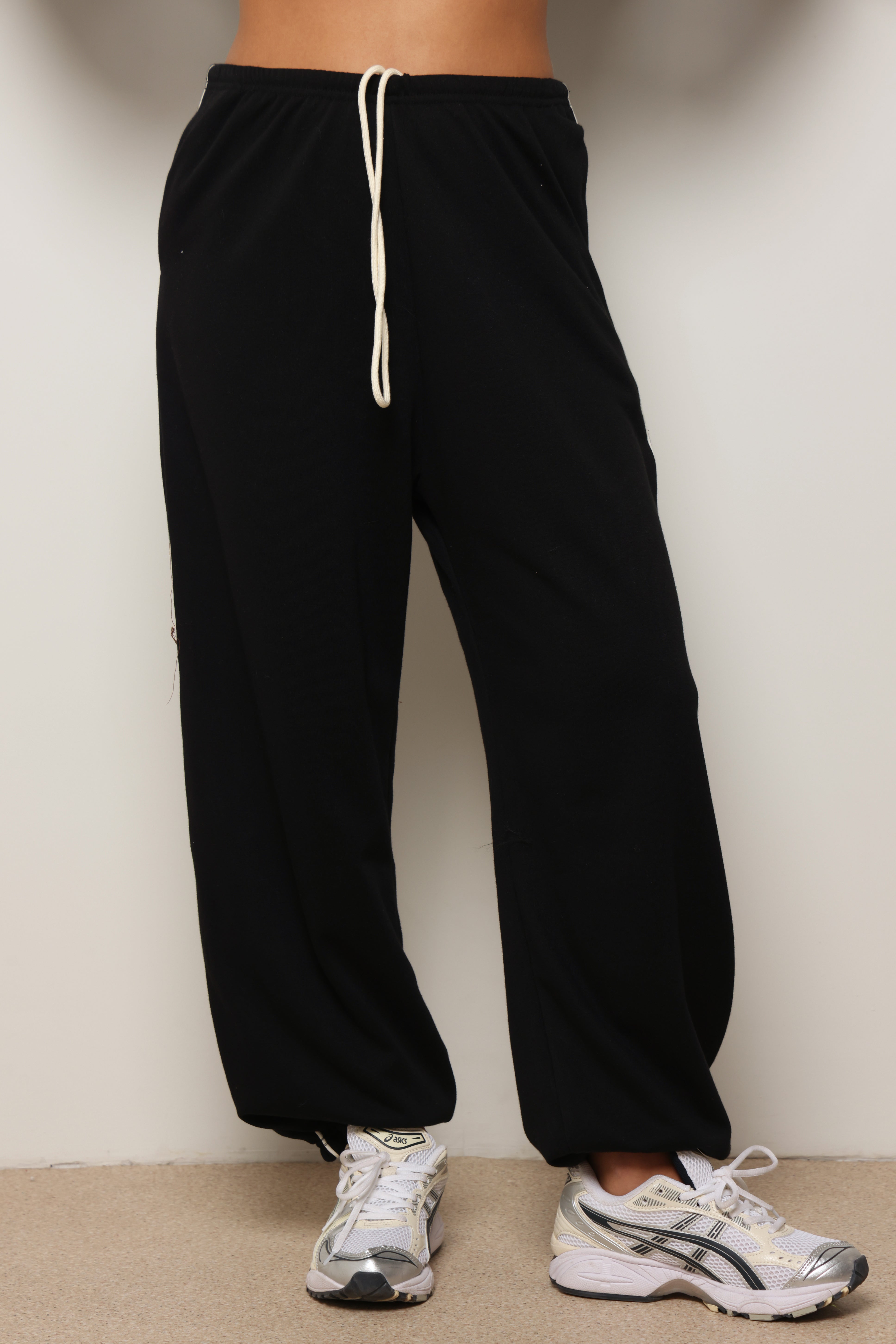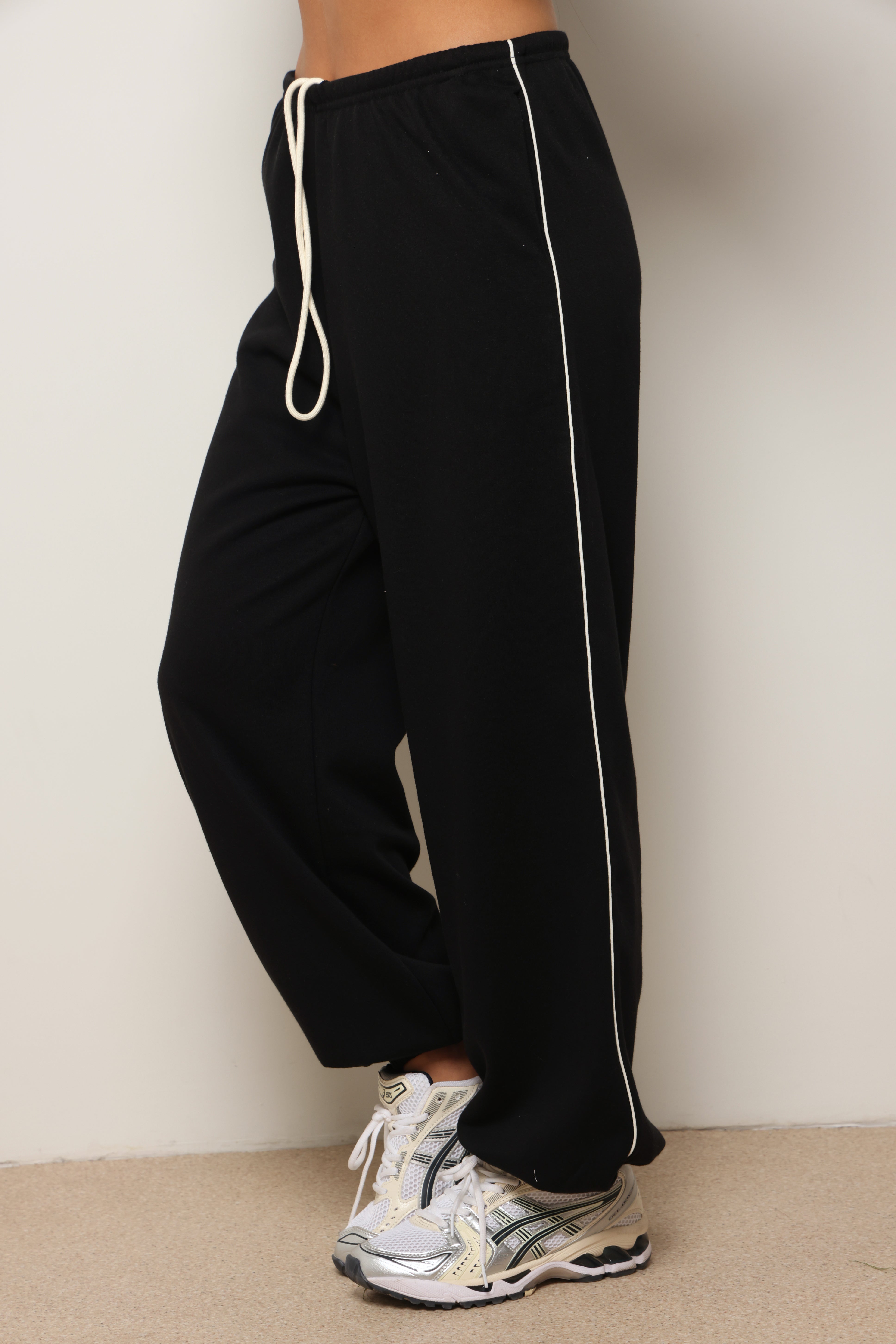 מכנסיים מבד פרנצ'טרי עם פס לאורך ושרוך קשירה.