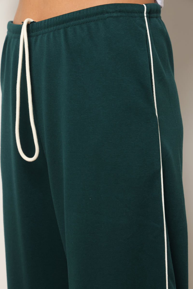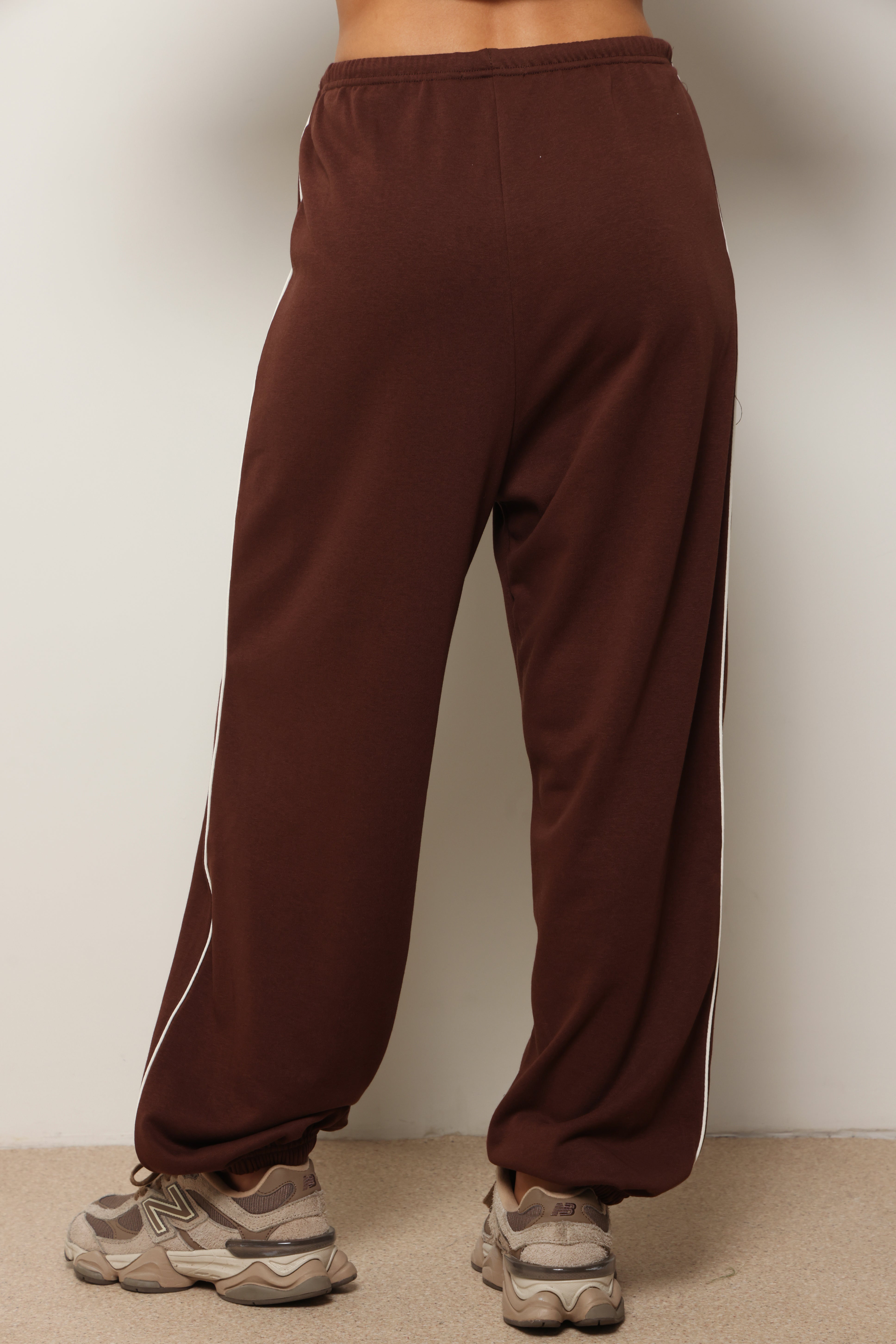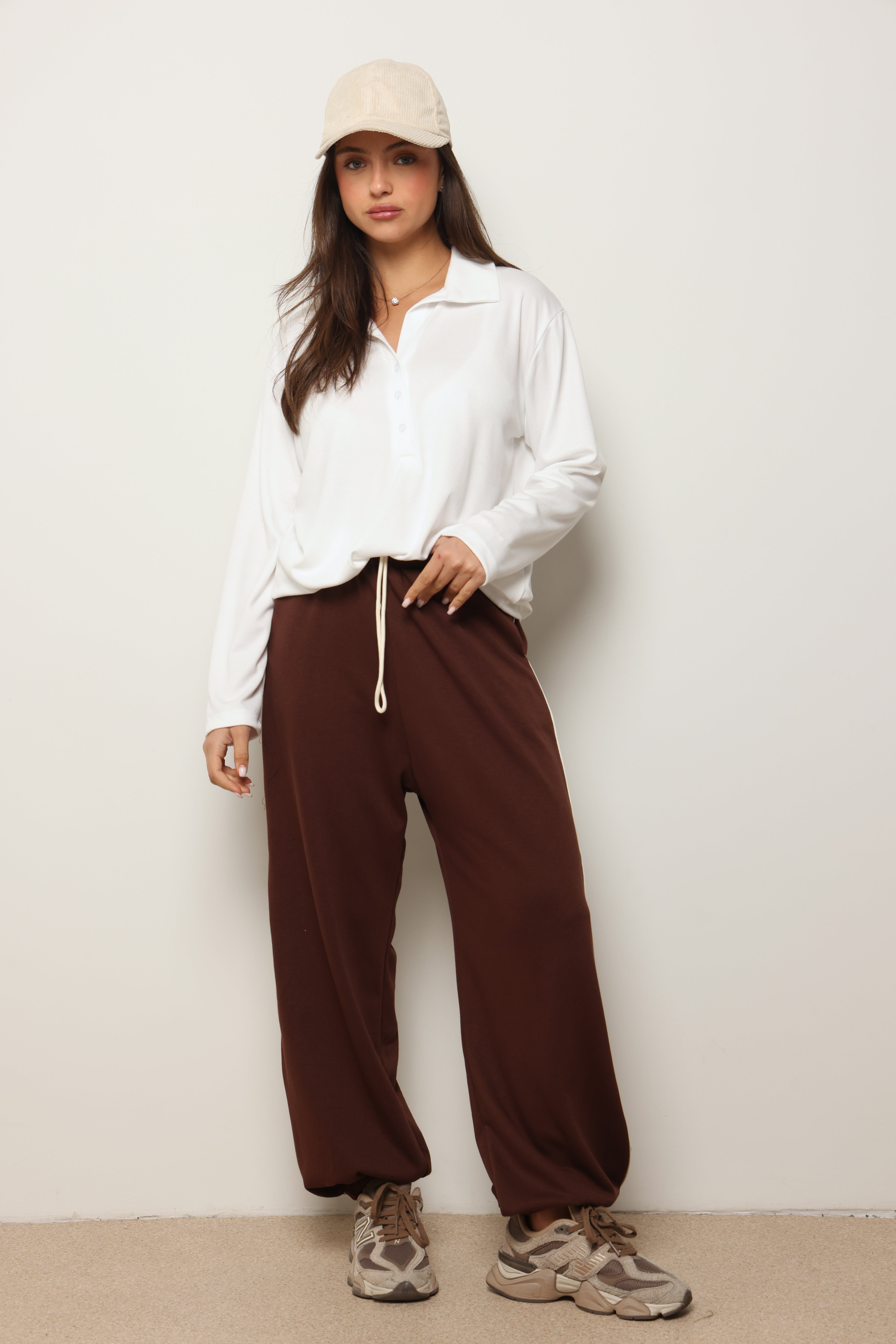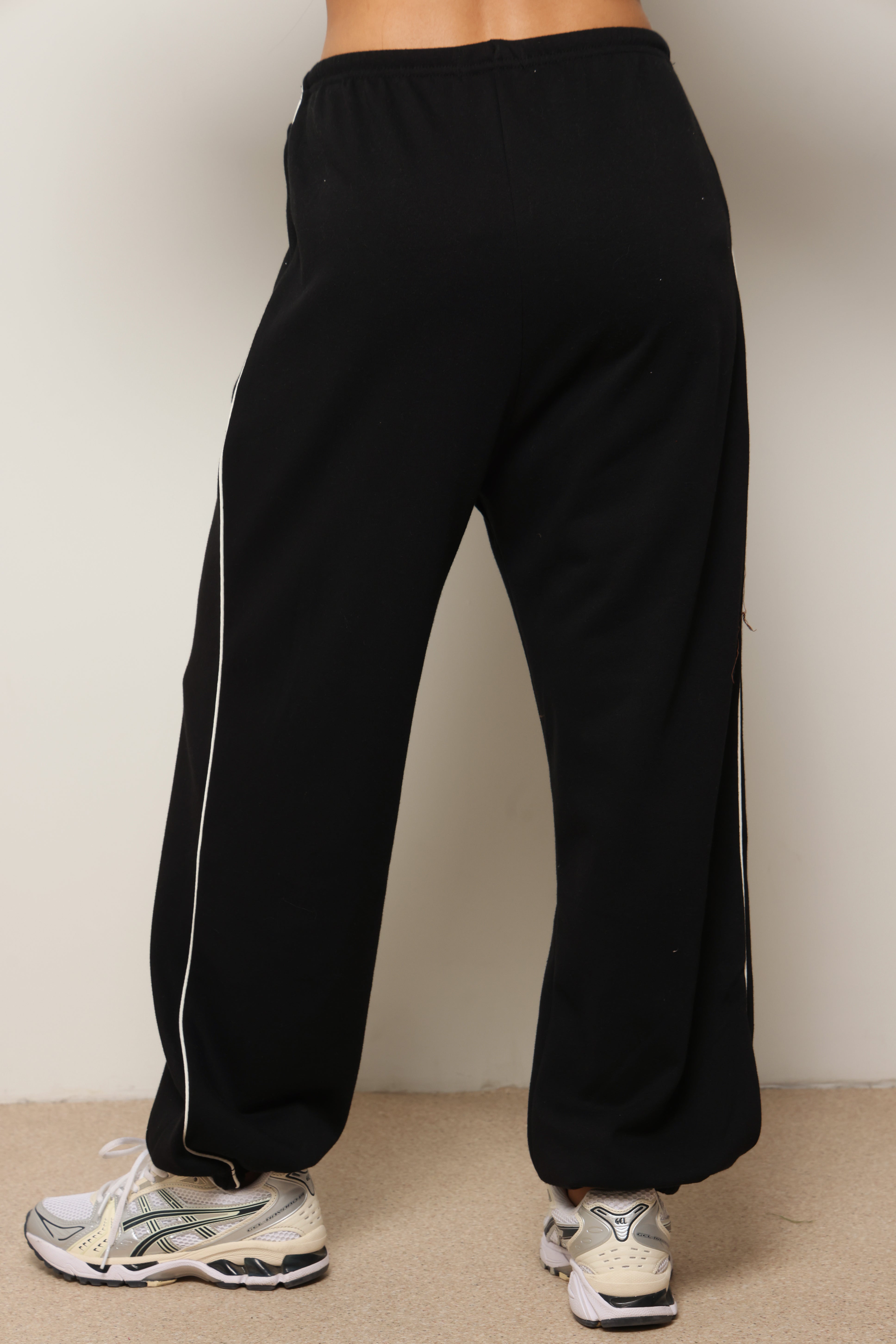 מכנסיים מבד פרנצ'טרי עם פס לאורך ושרוך קשירה.