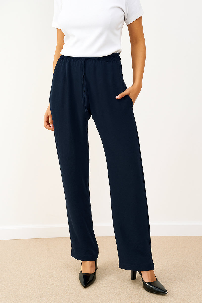 מכנסי ערב מבד קרפ בעלי שרוך קשירה וגומי במותן, כיסים צידיים וסיומת מתרחבת.