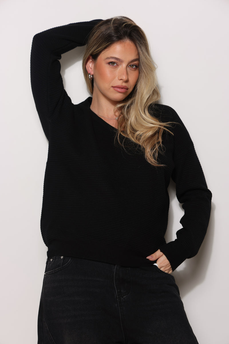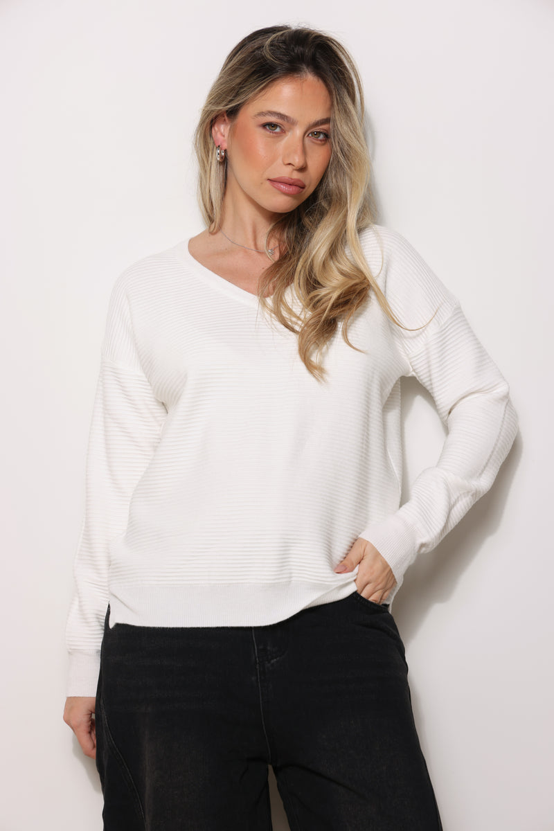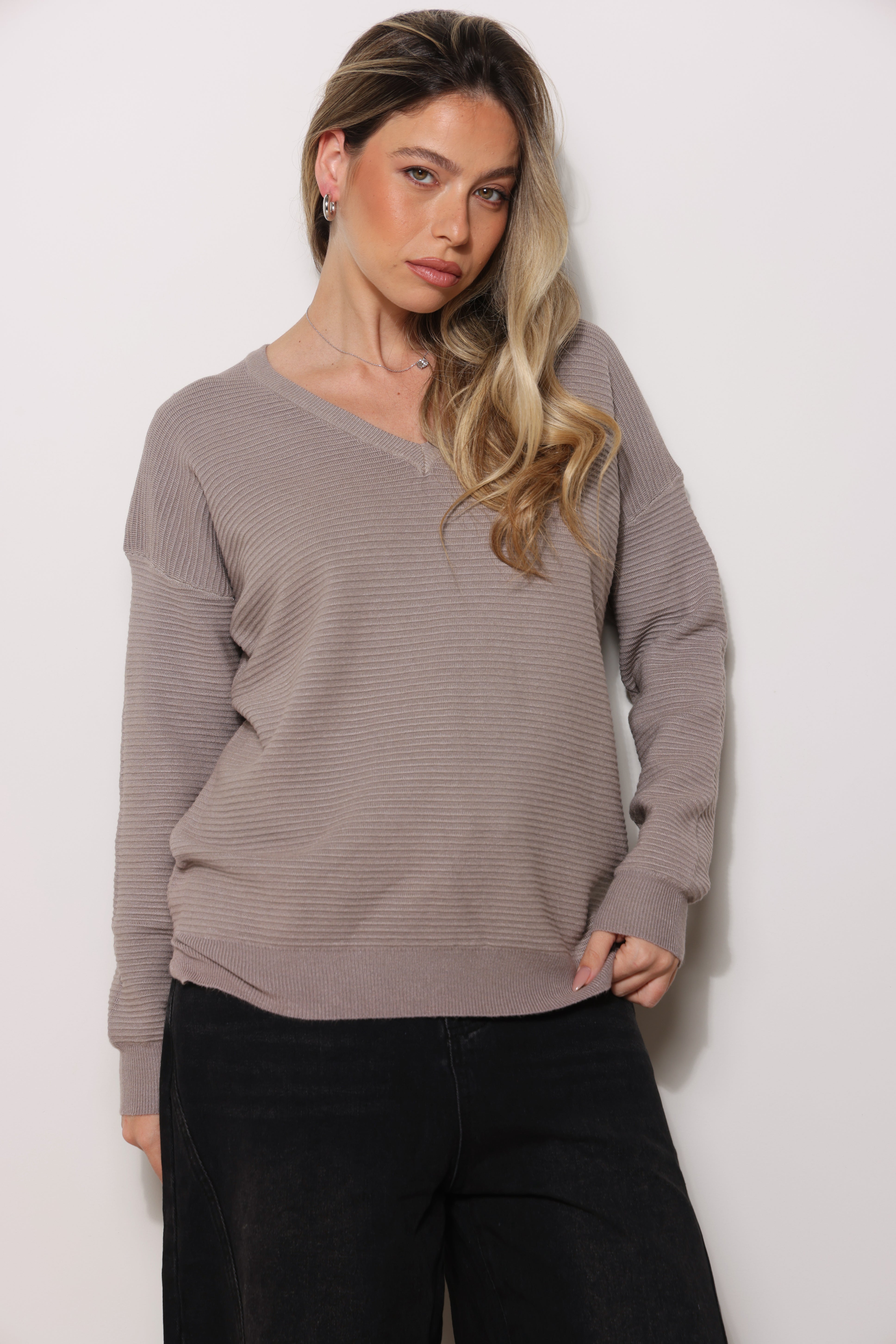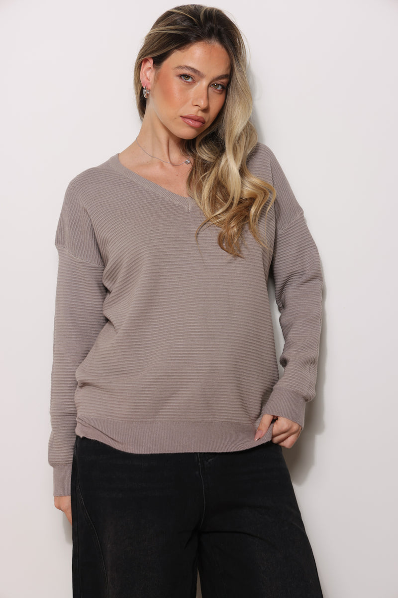 סריג במגע רך בייסיק צווארון וי בטקסטורה.