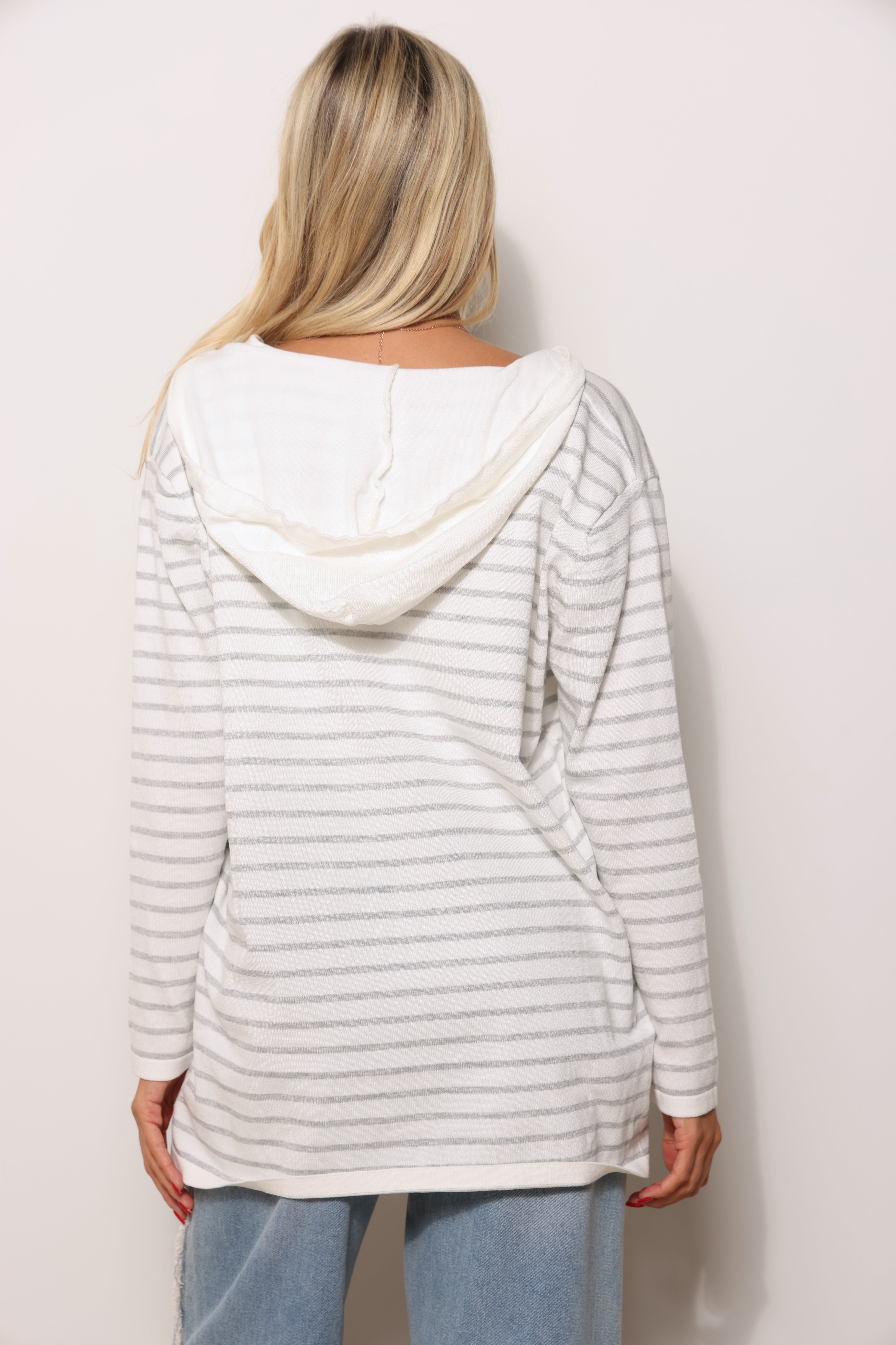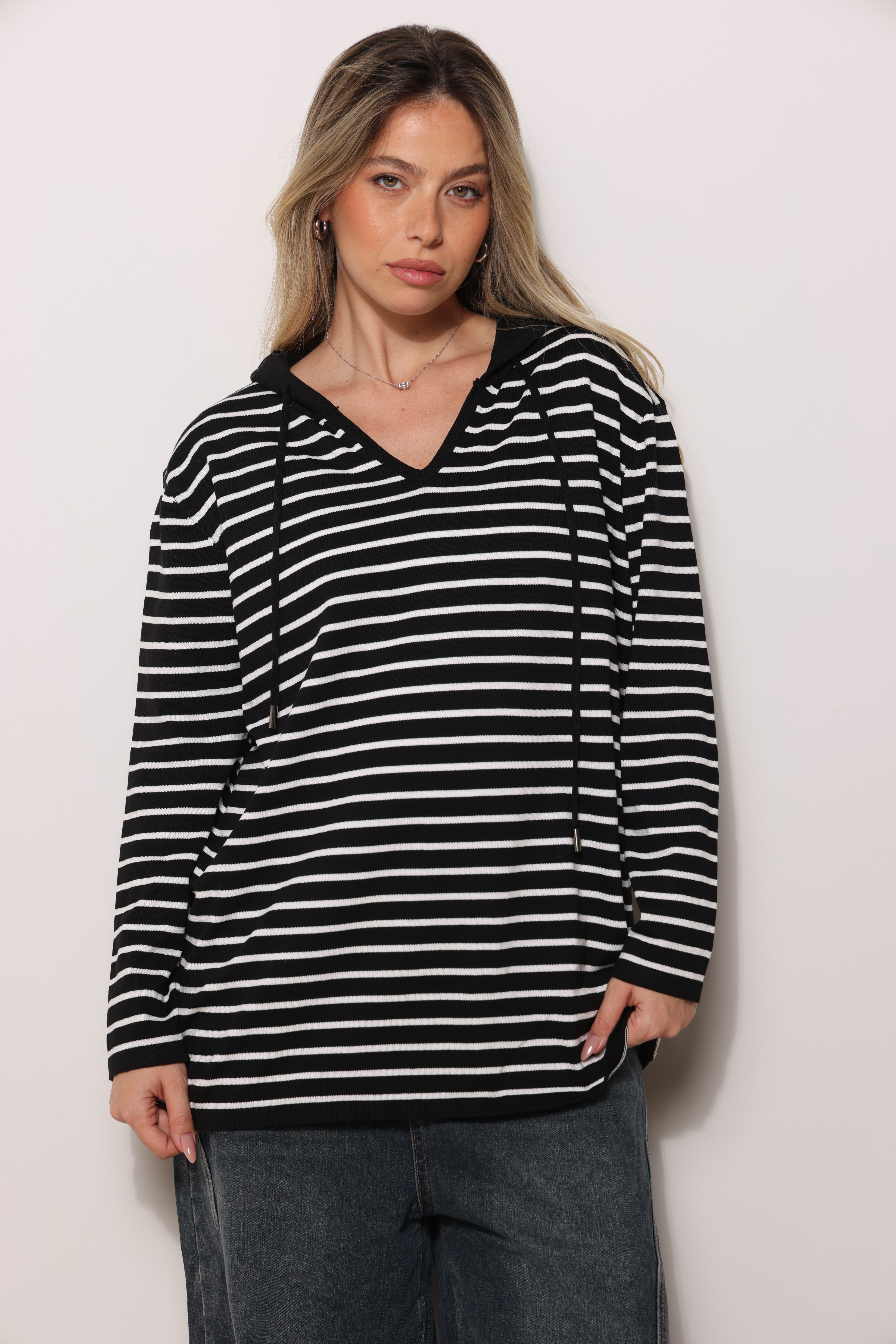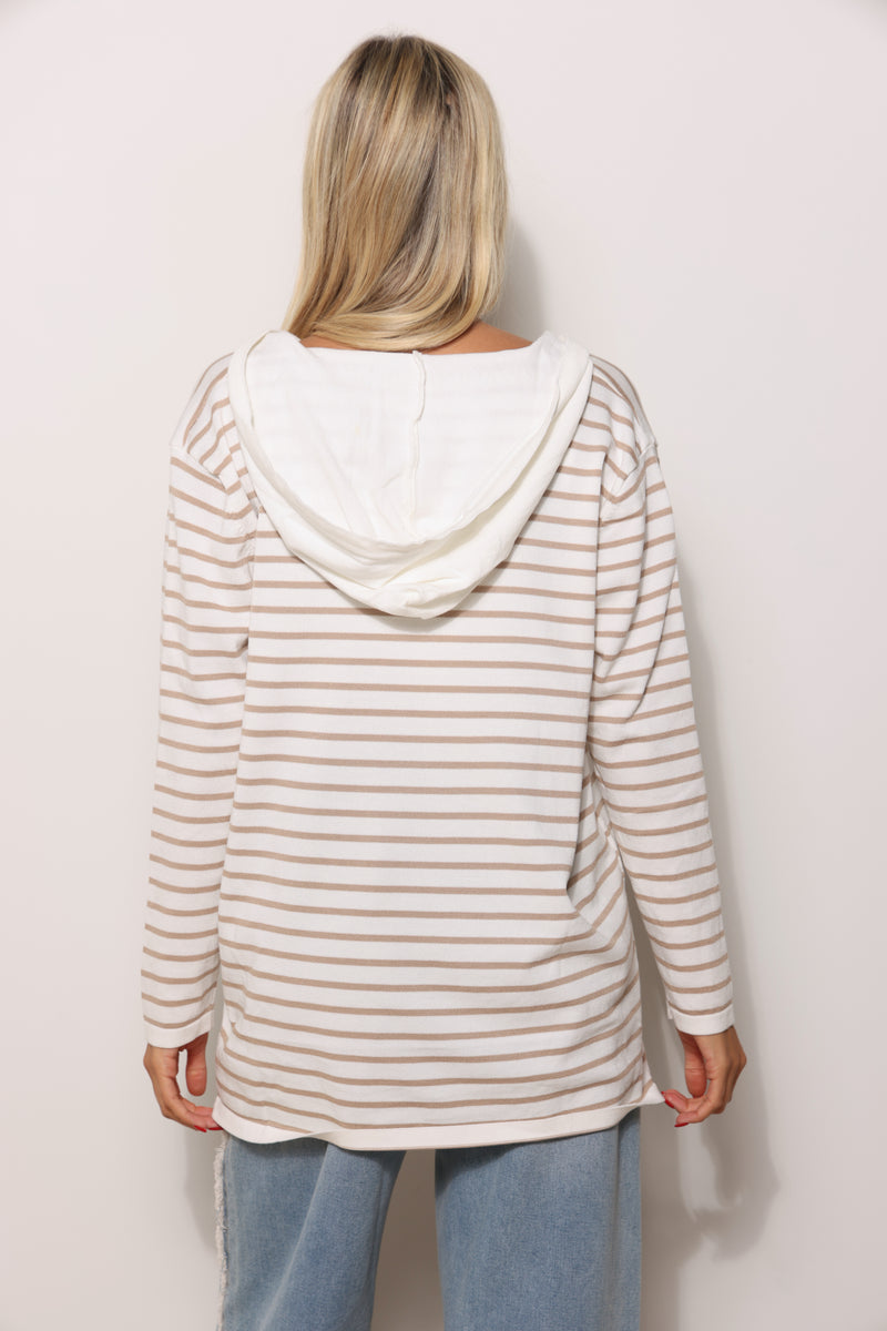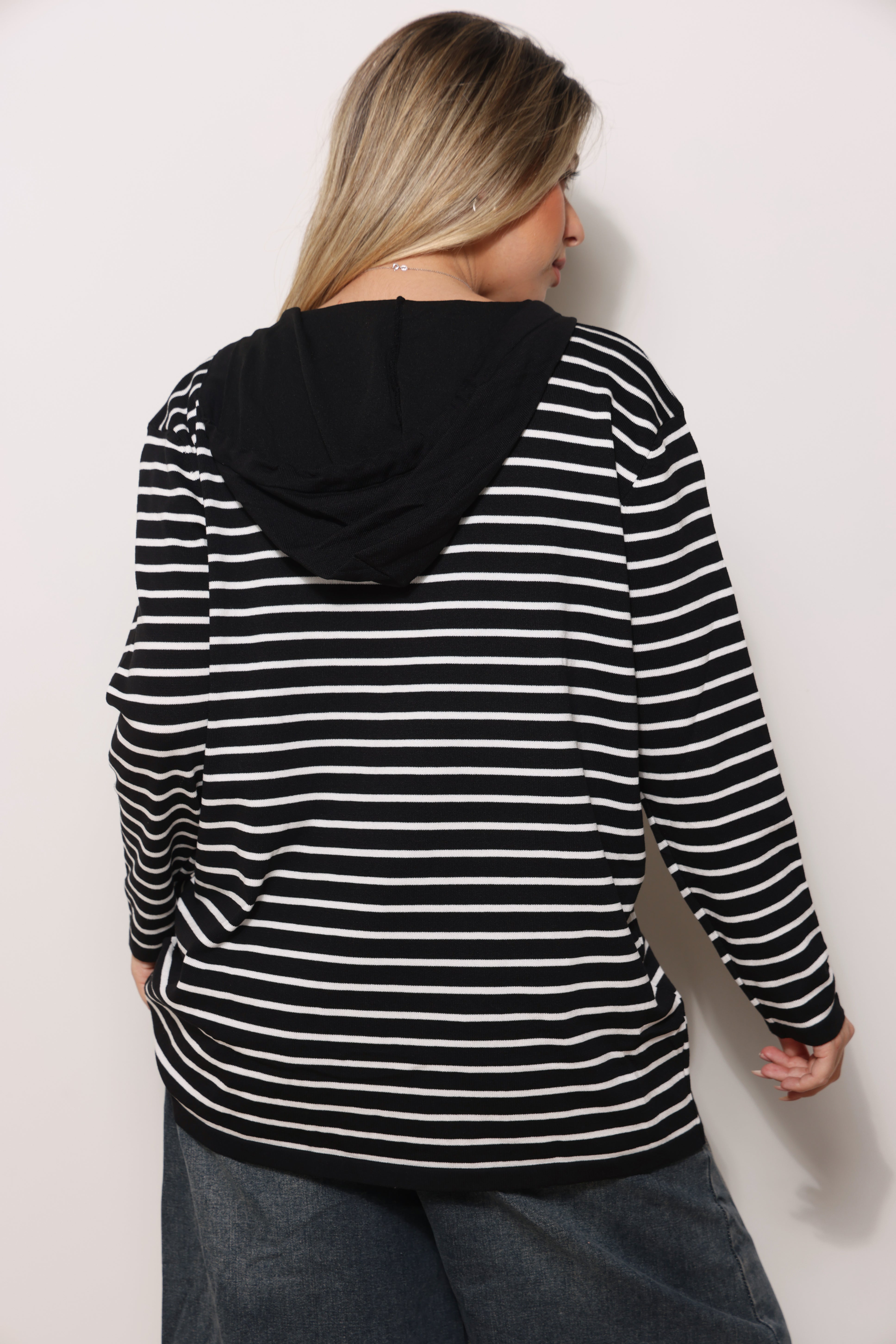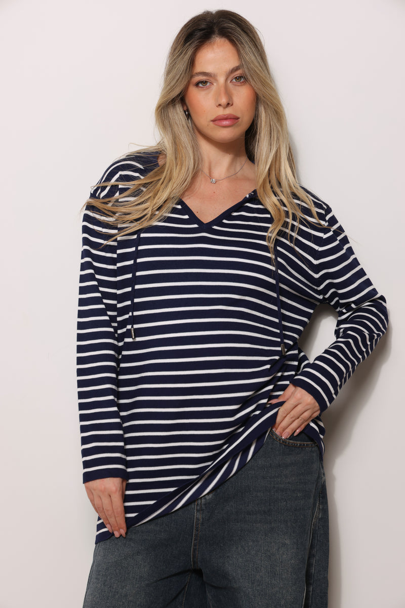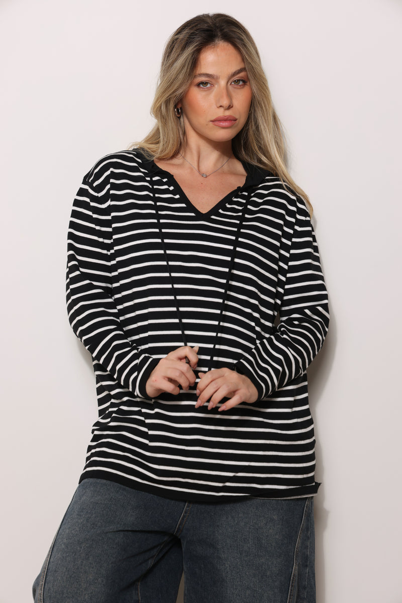 סריג במגע רך בגזרת סווטשירט עם כובע קפוצ'ון שרוכים ובפרינט פסים.