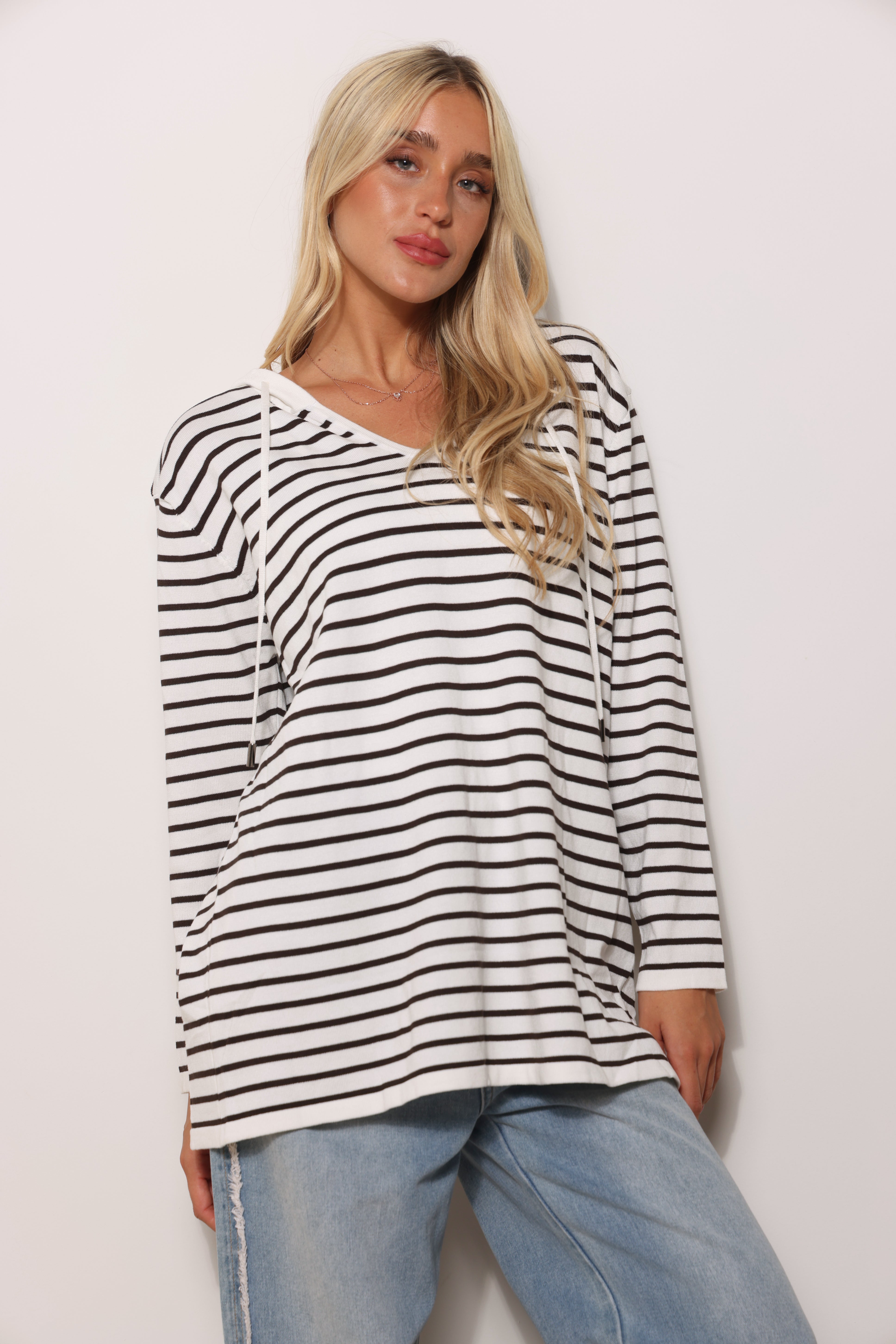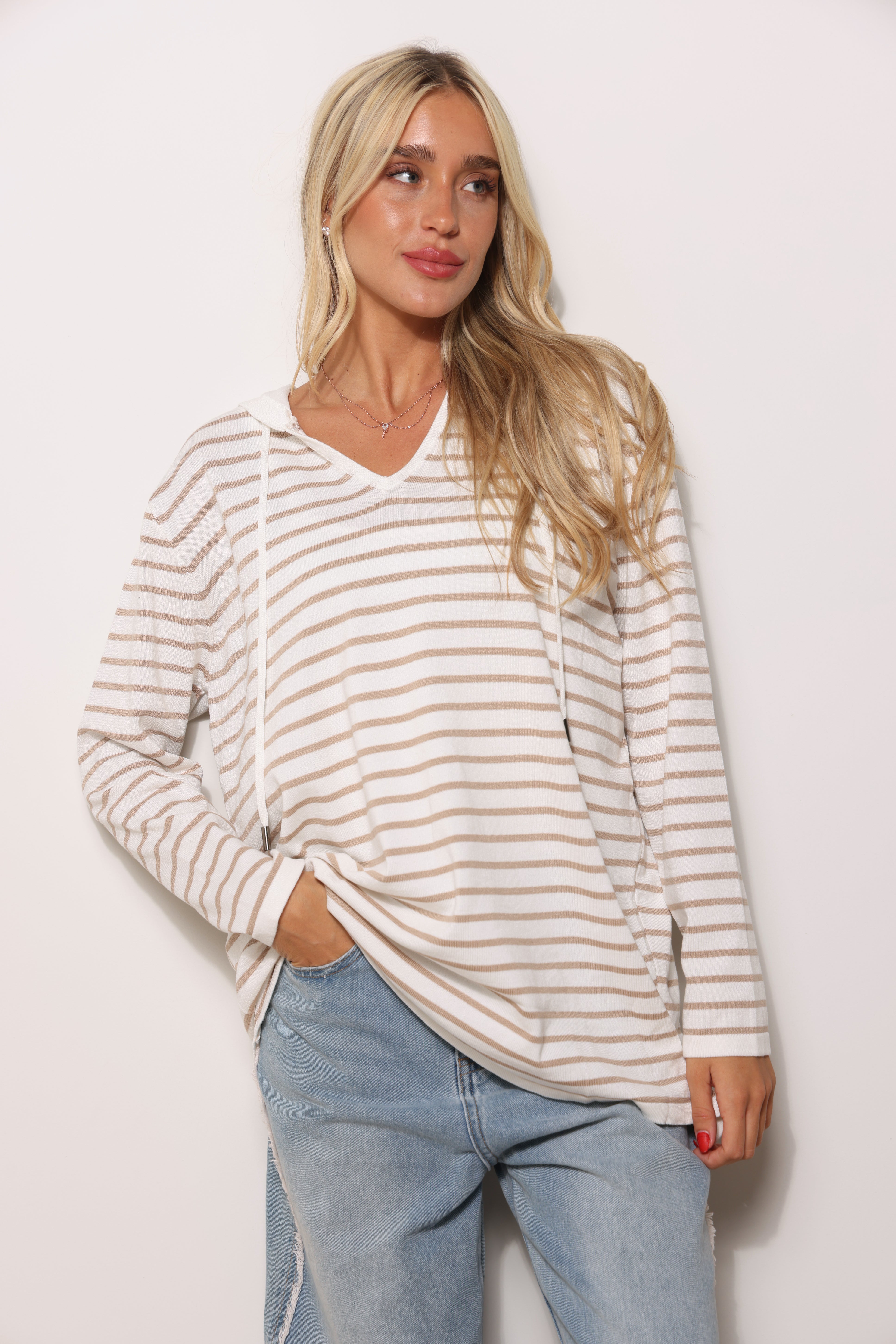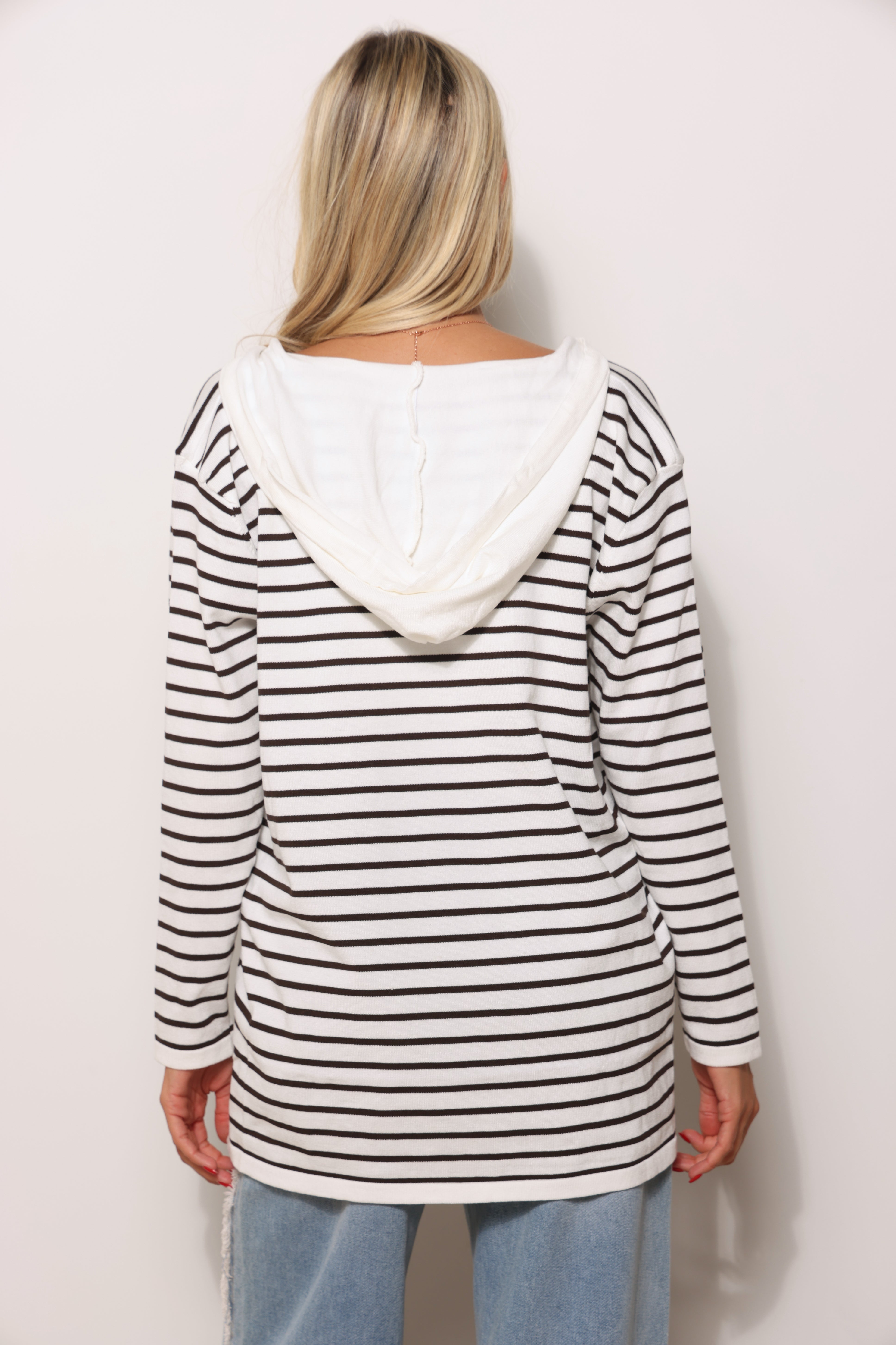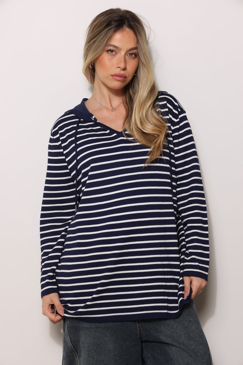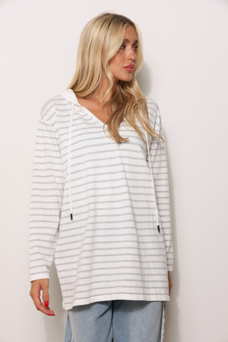 סריג במגע רך בגזרת סווטשירט עם כובע קפוצ'ון שרוכים ובפרינט פסים.