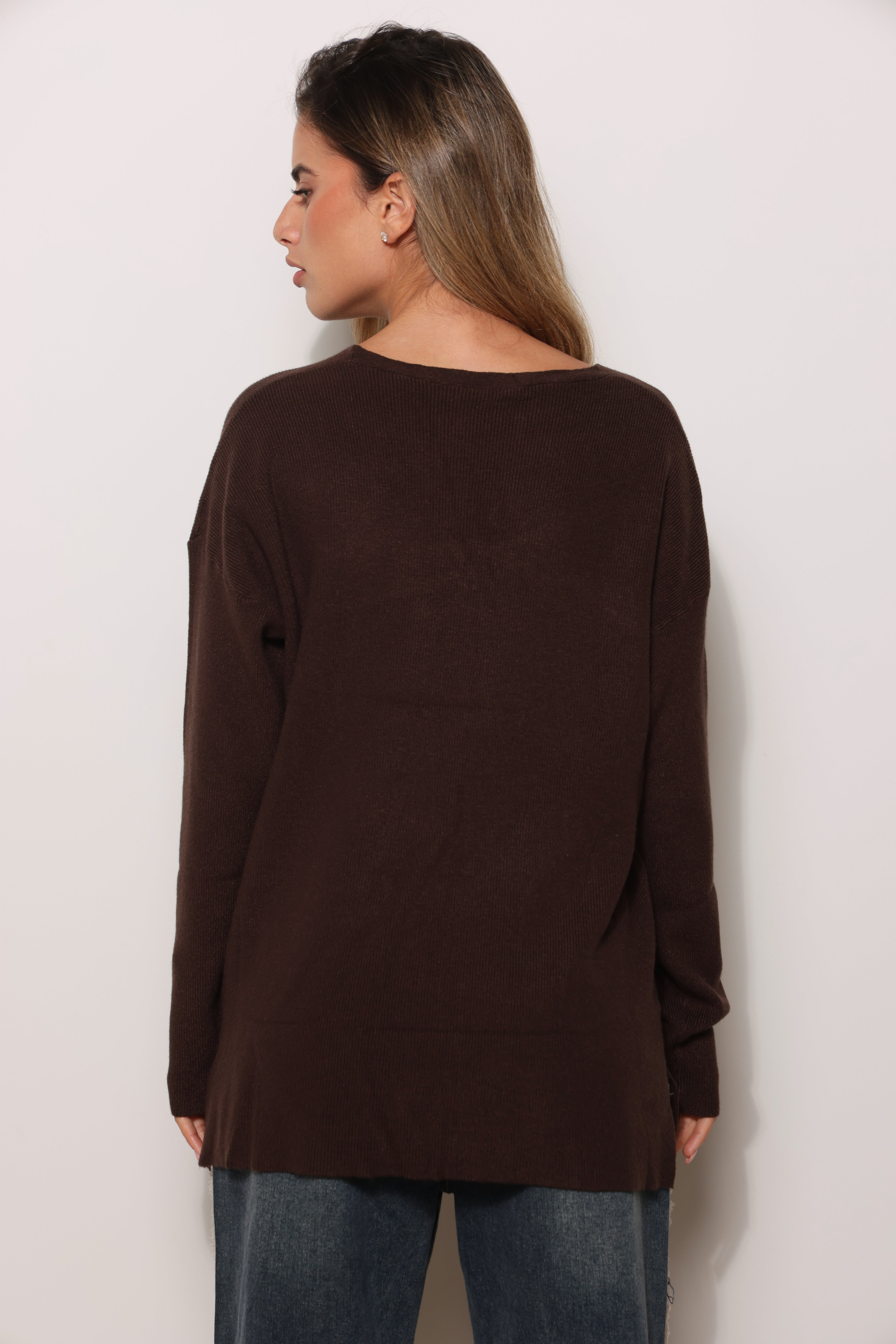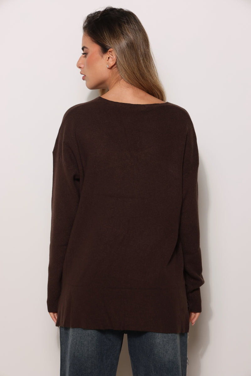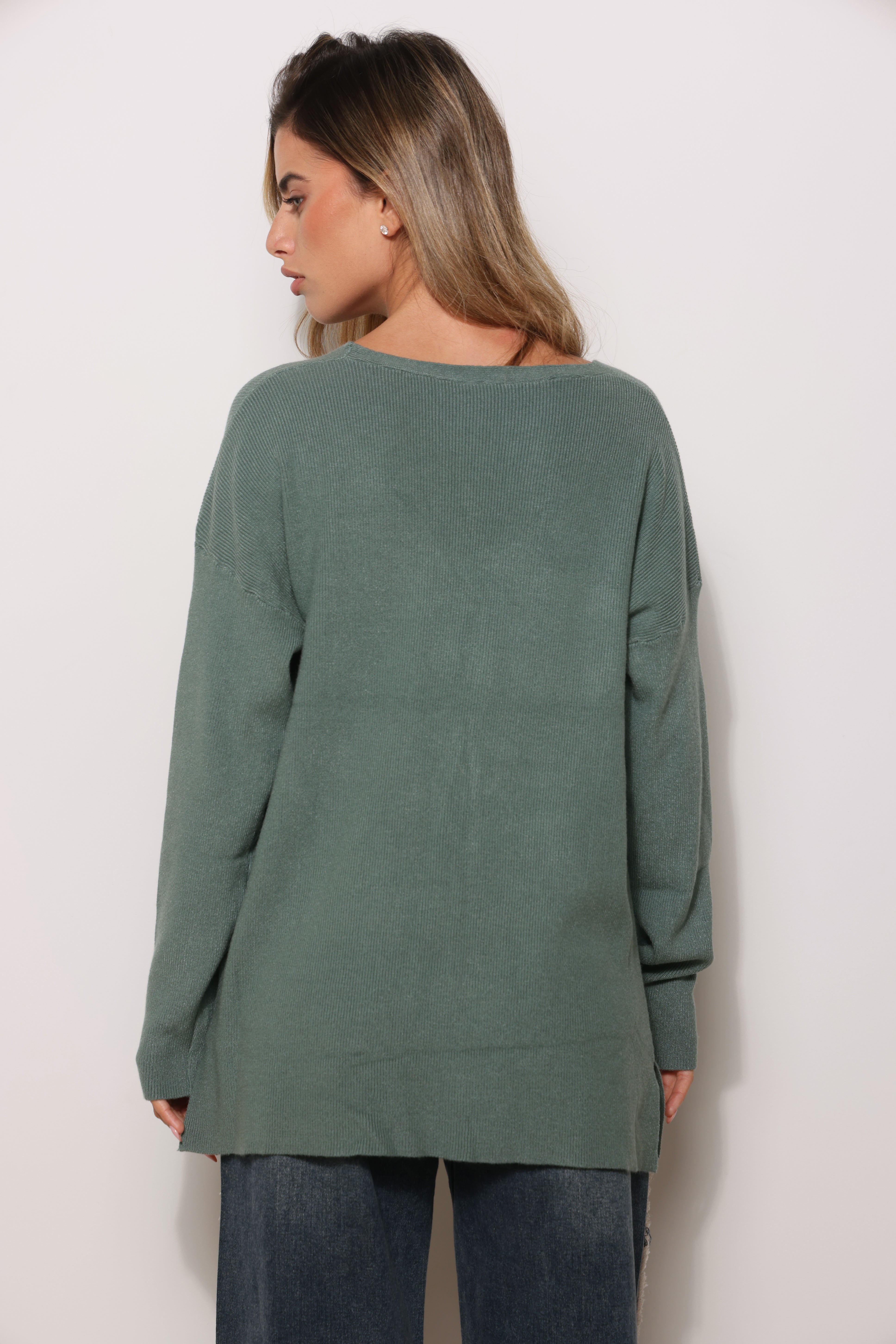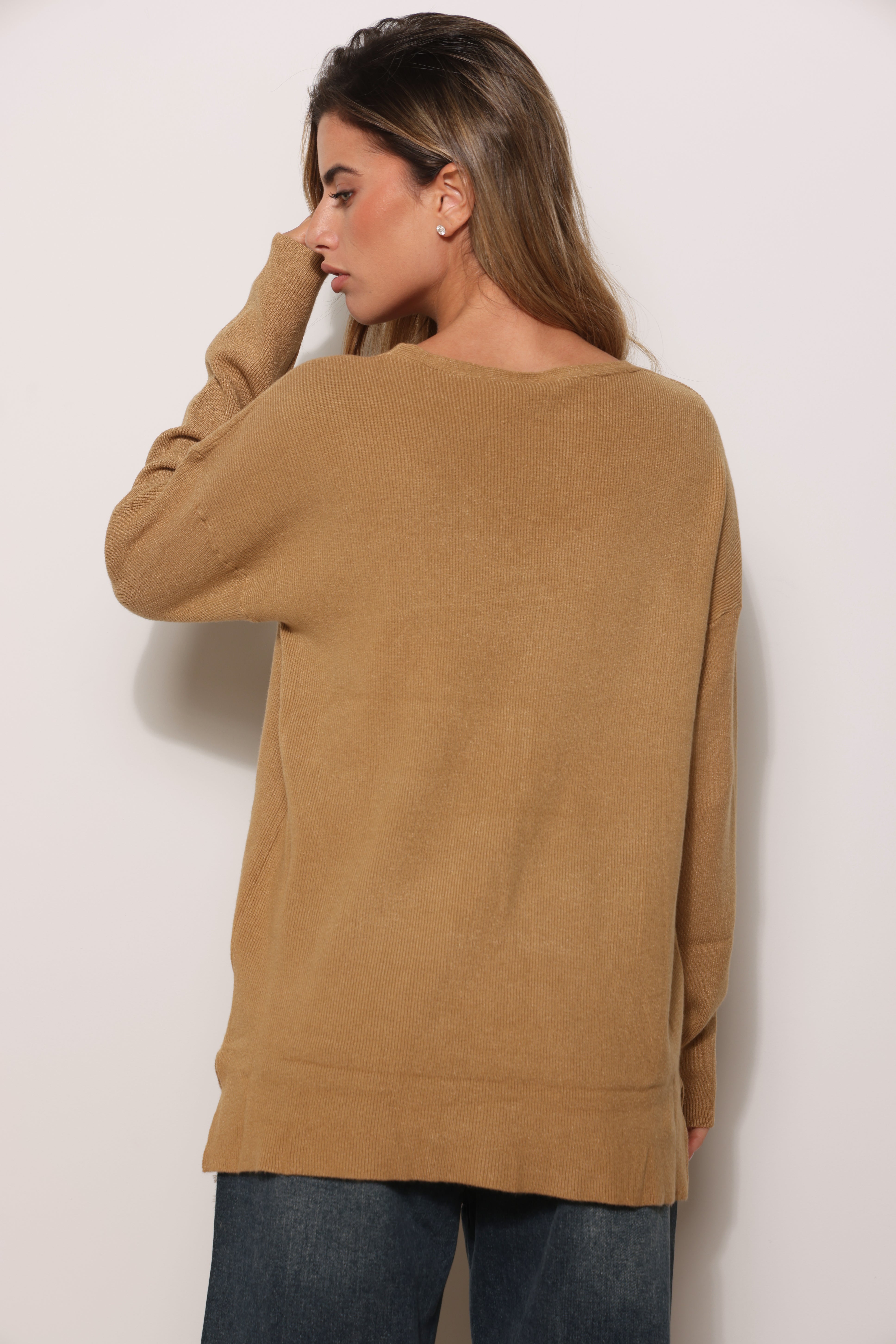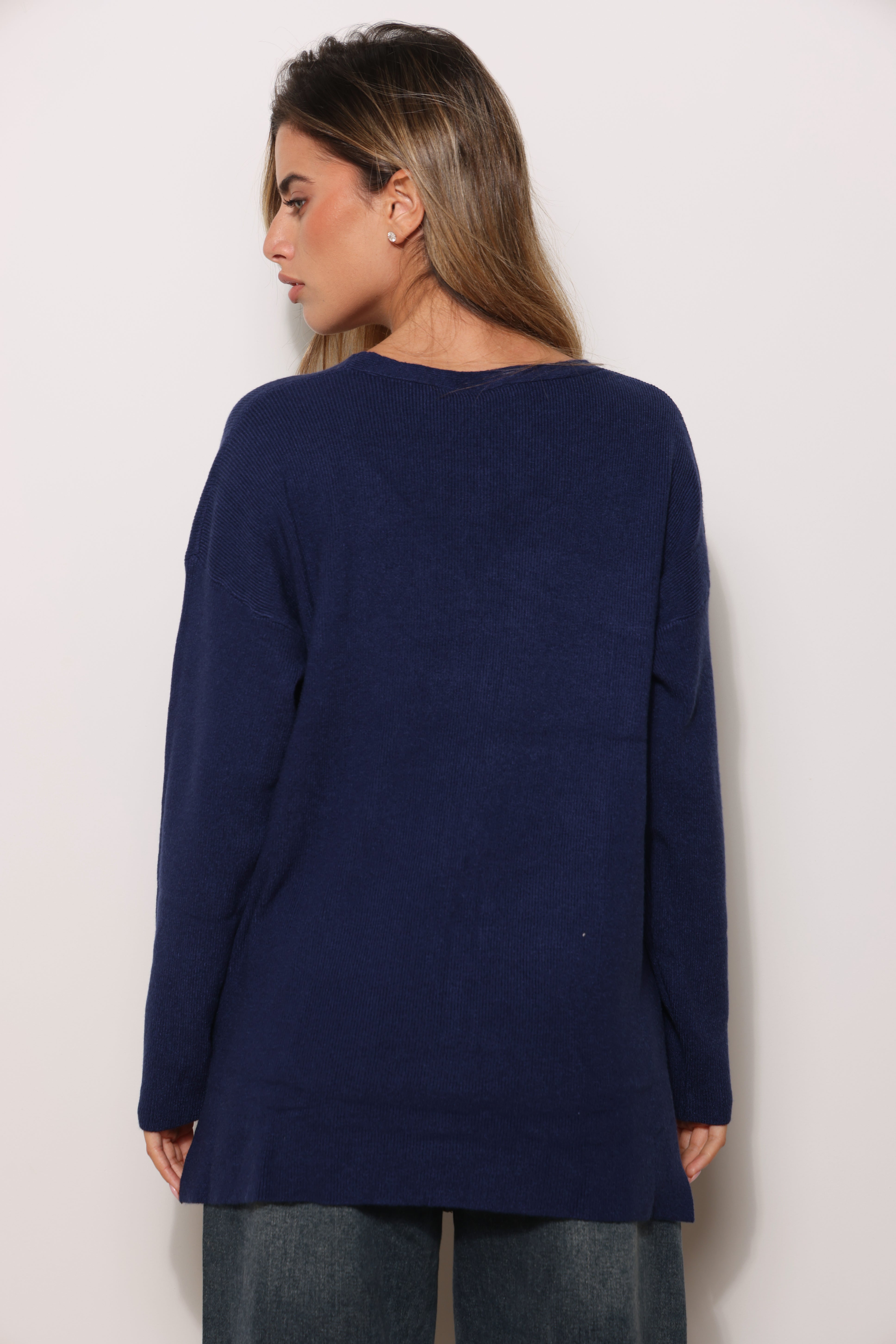 סריג בייסיק במגע רך בגזרת אוברסייז עם מפתח צווארון וי.