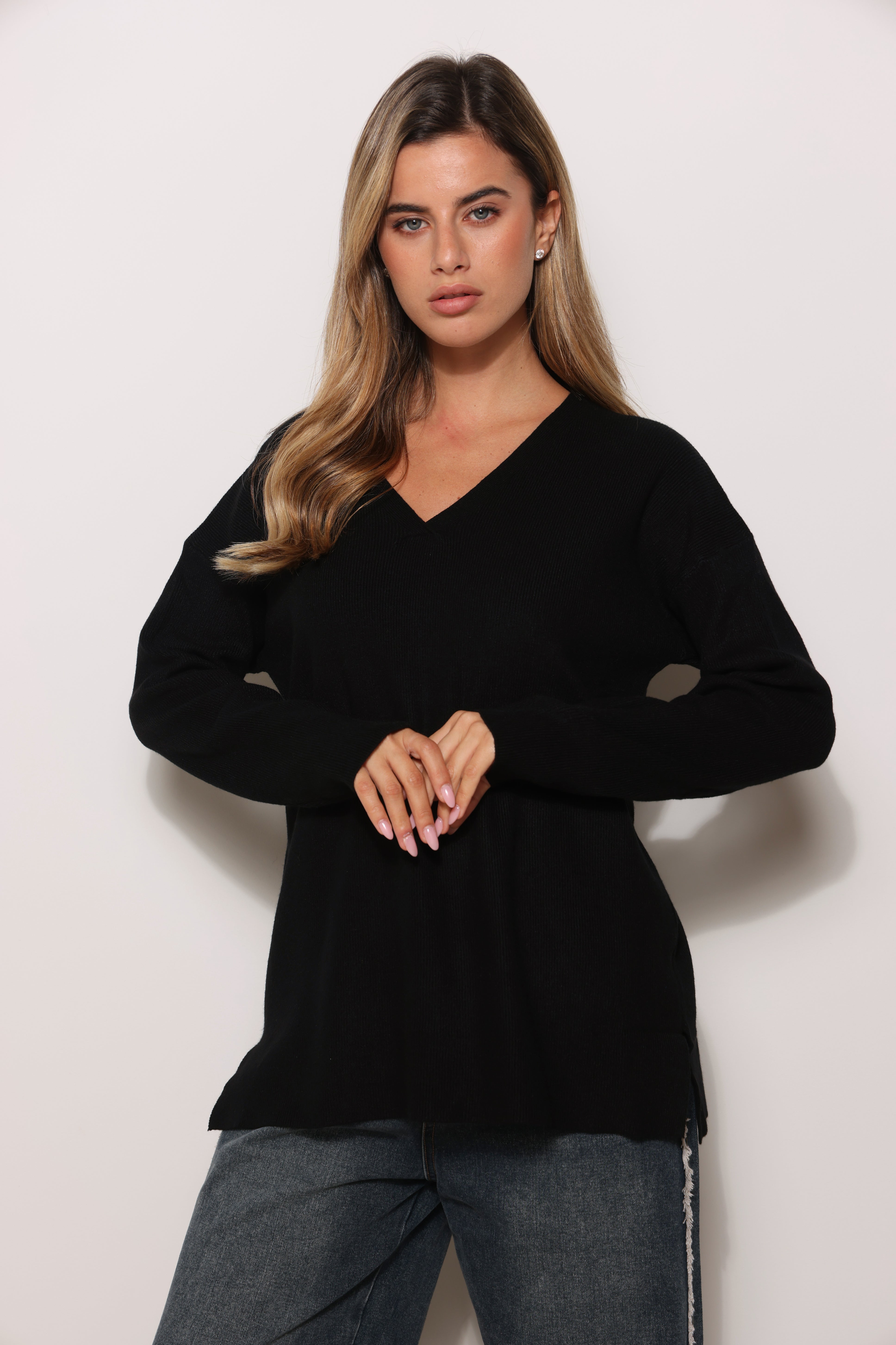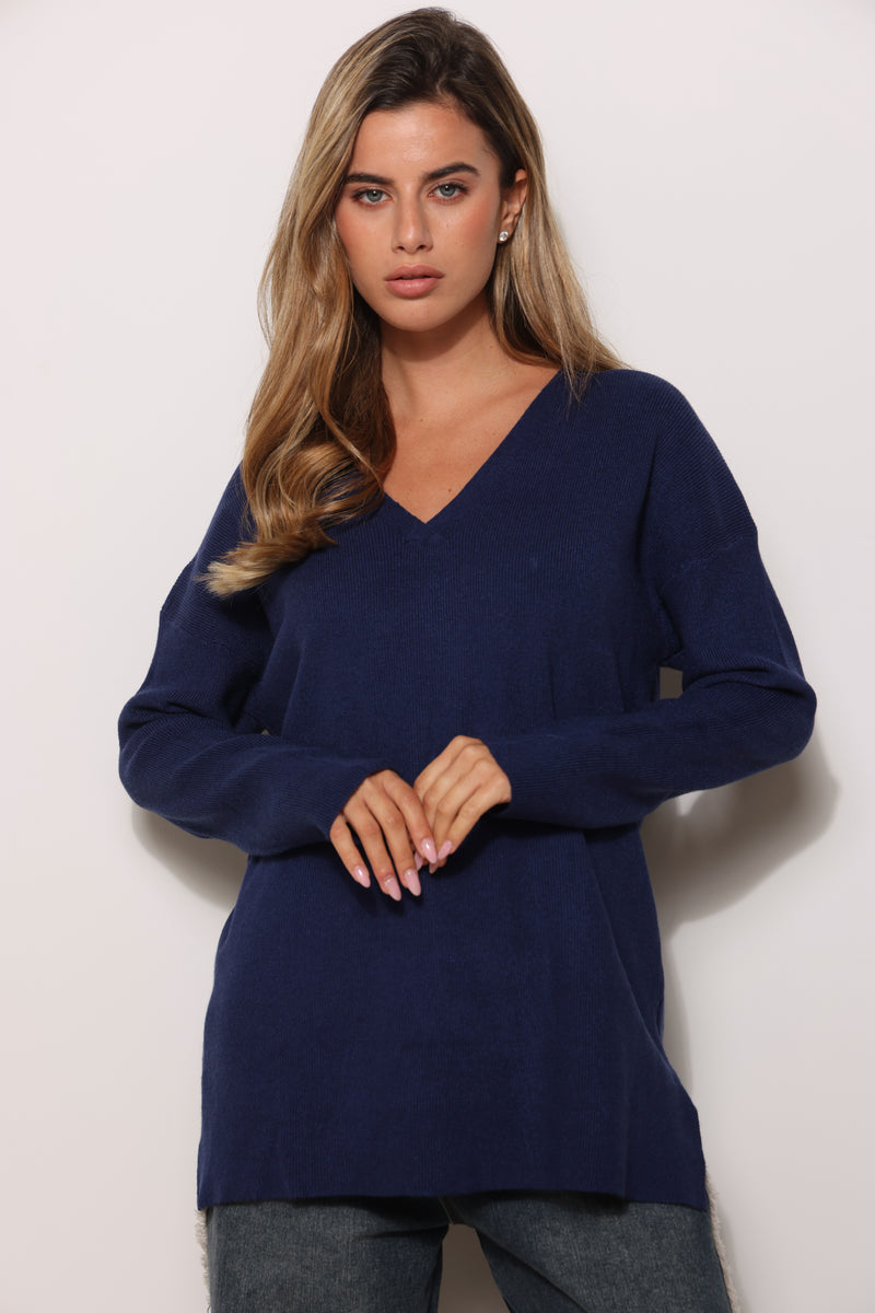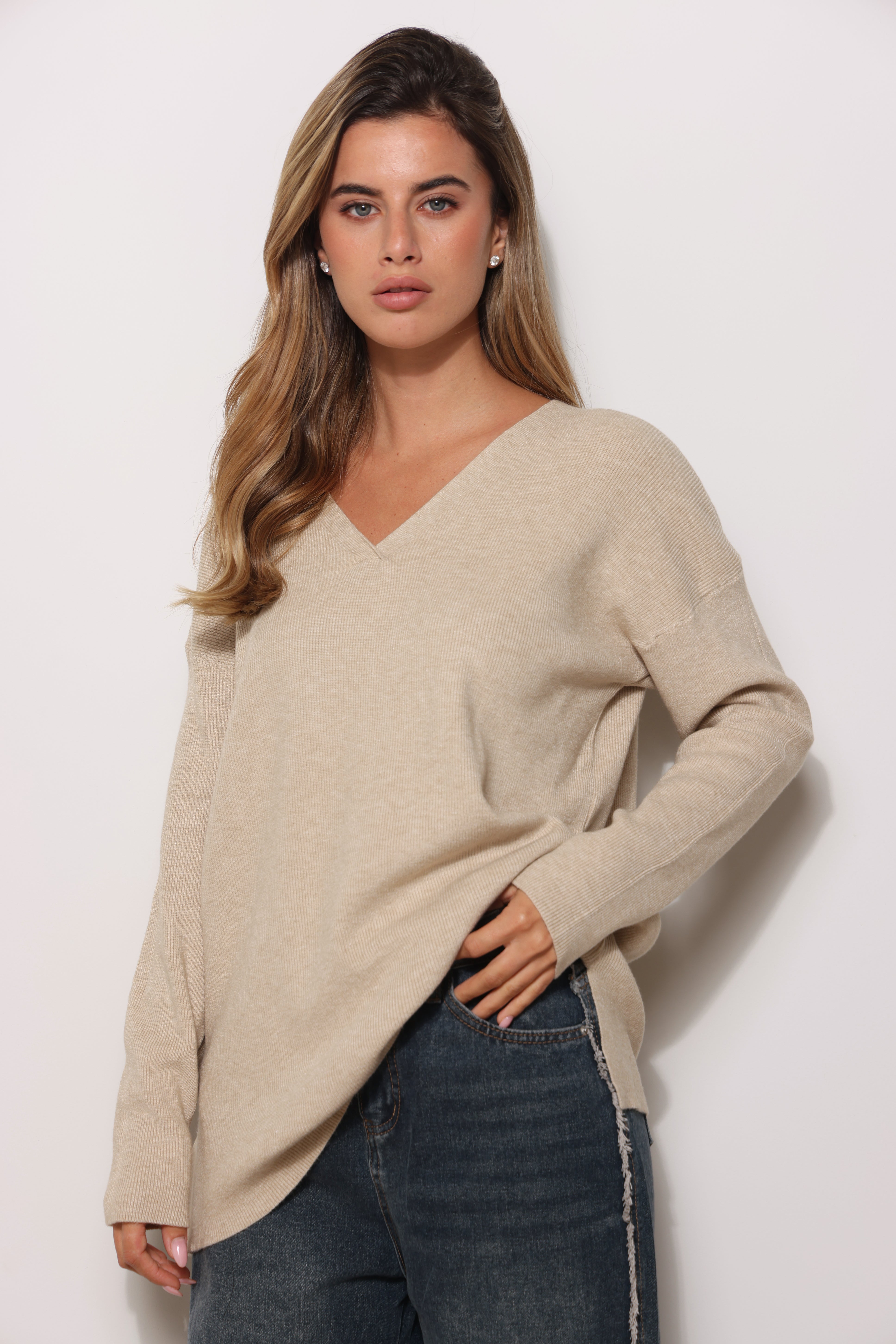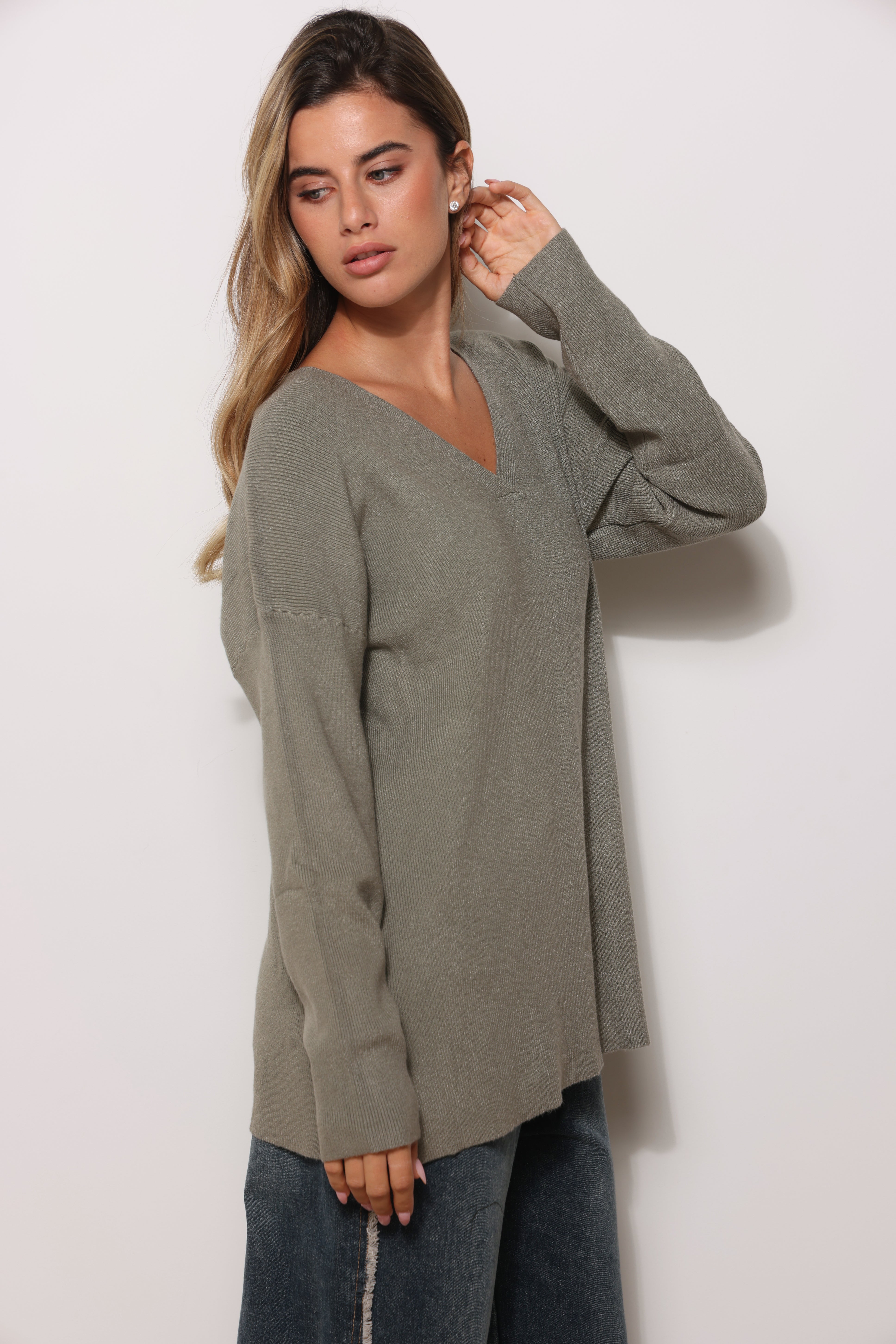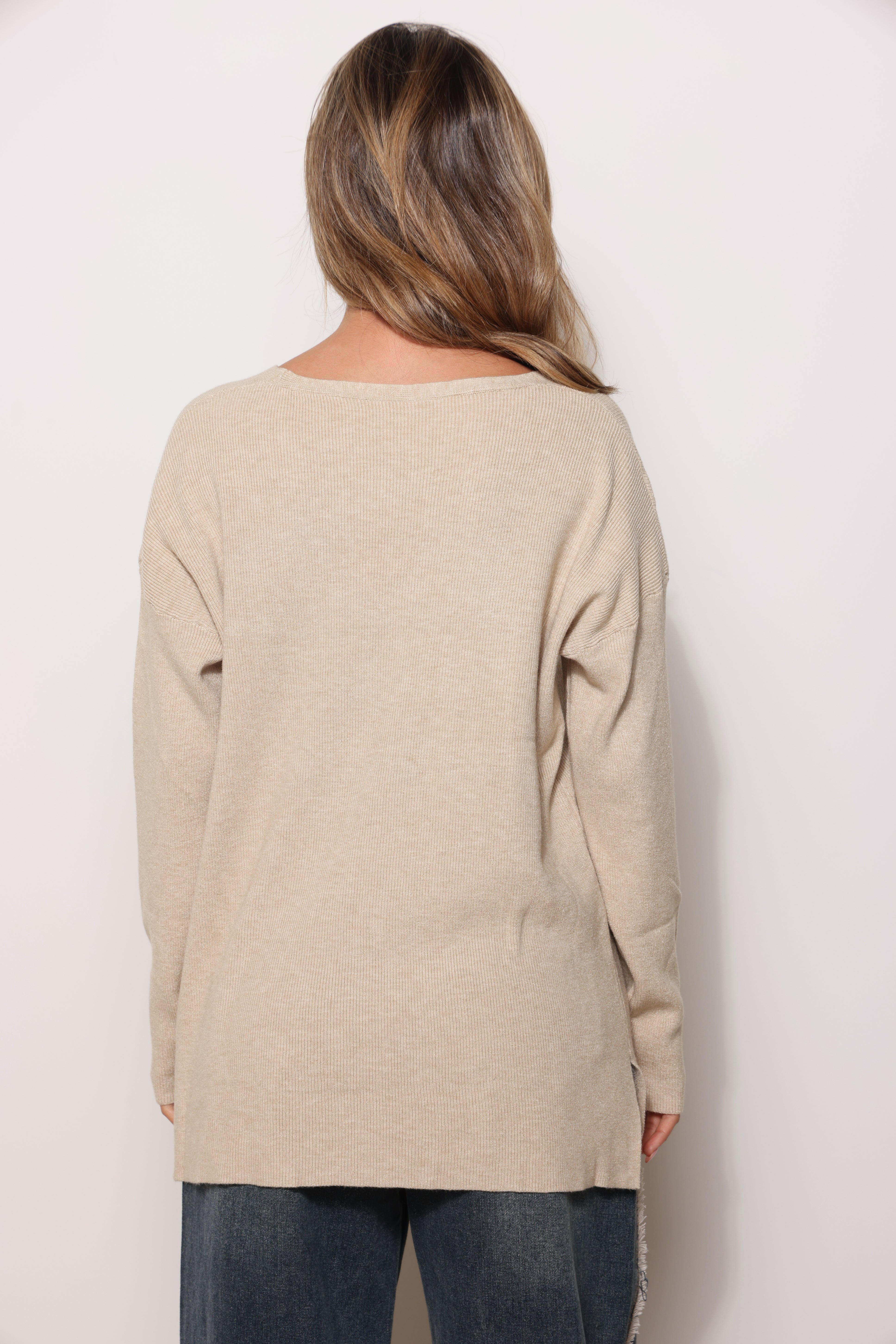 סריג בייסיק במגע רך בגזרת אוברסייז עם מפתח צווארון וי.