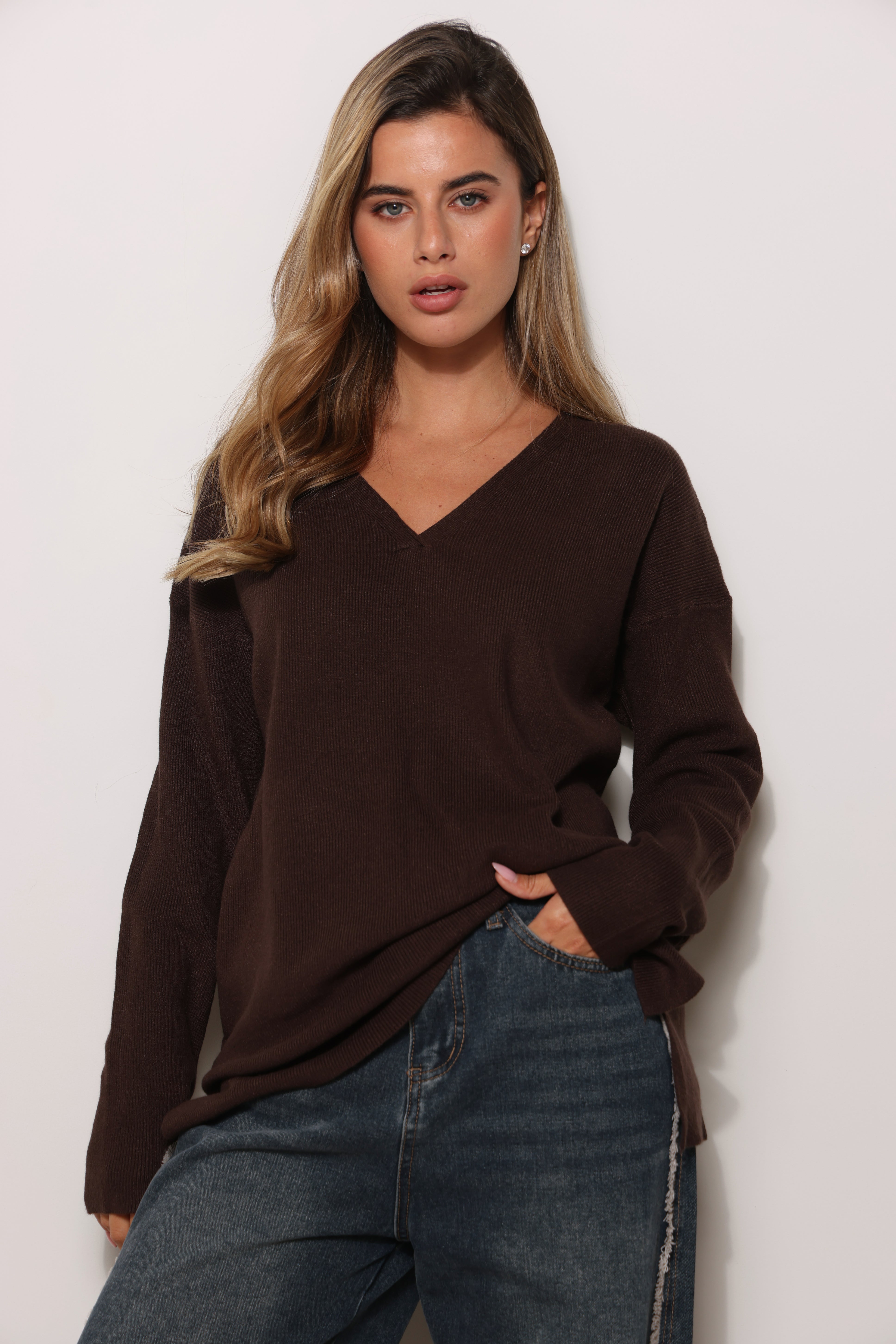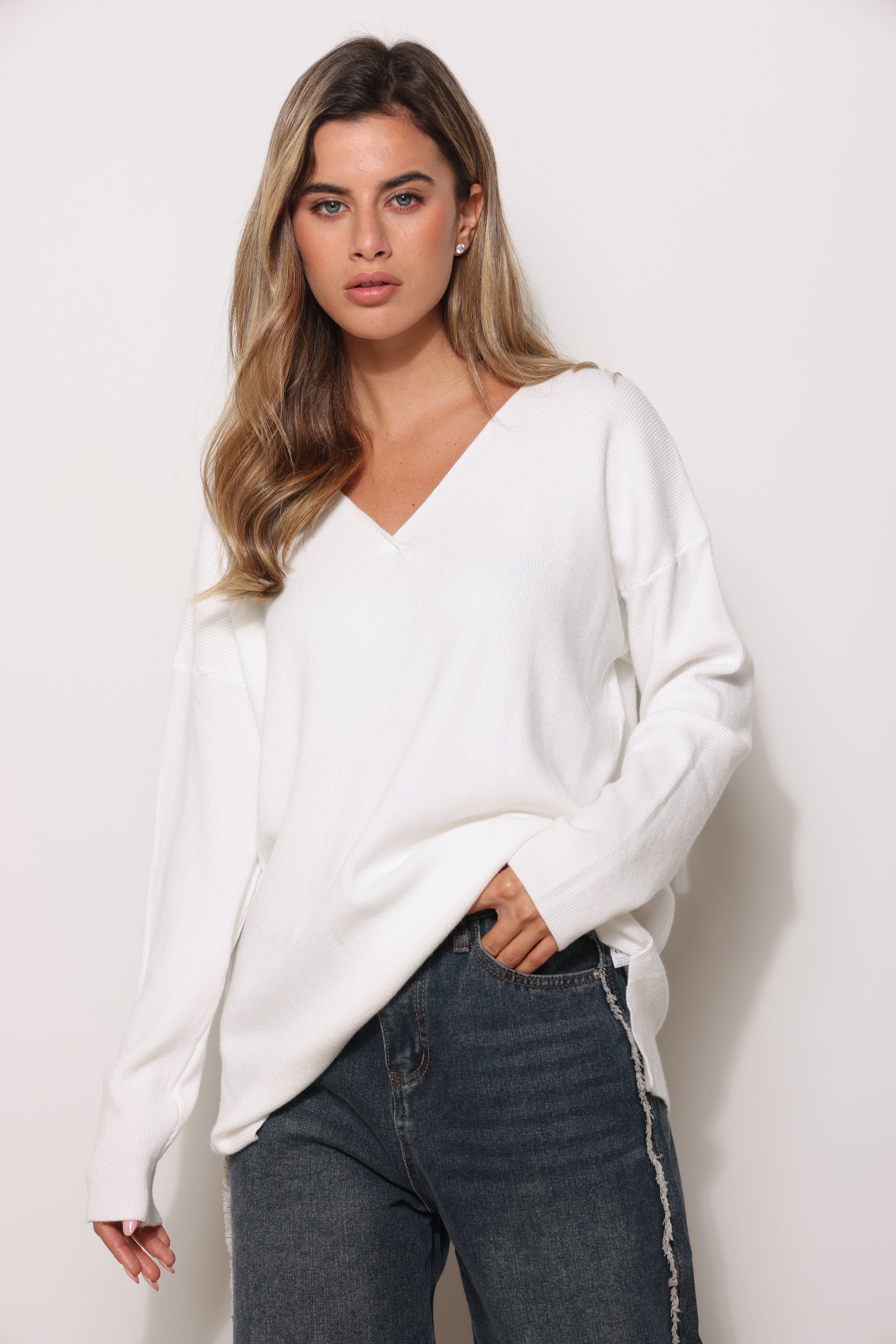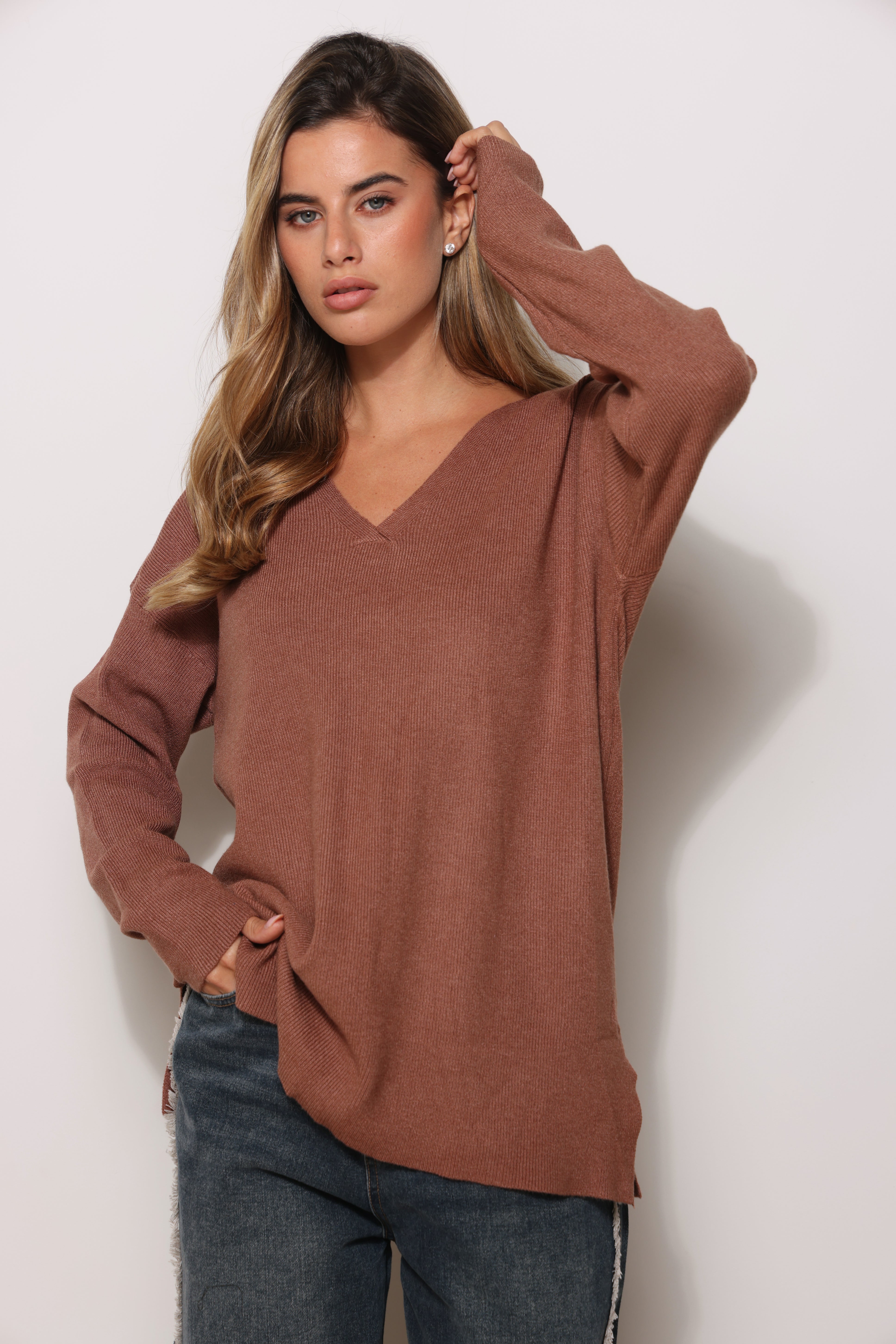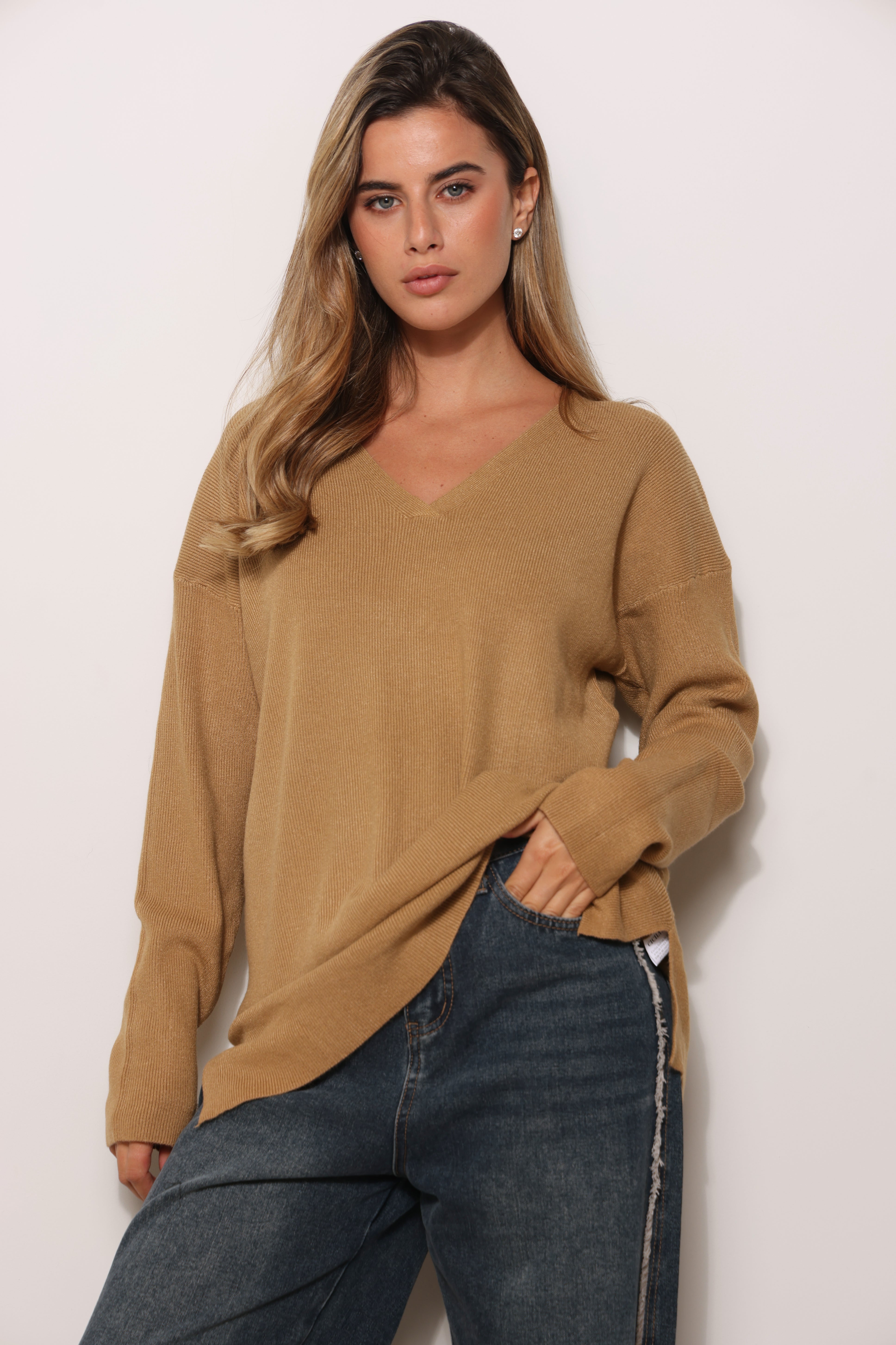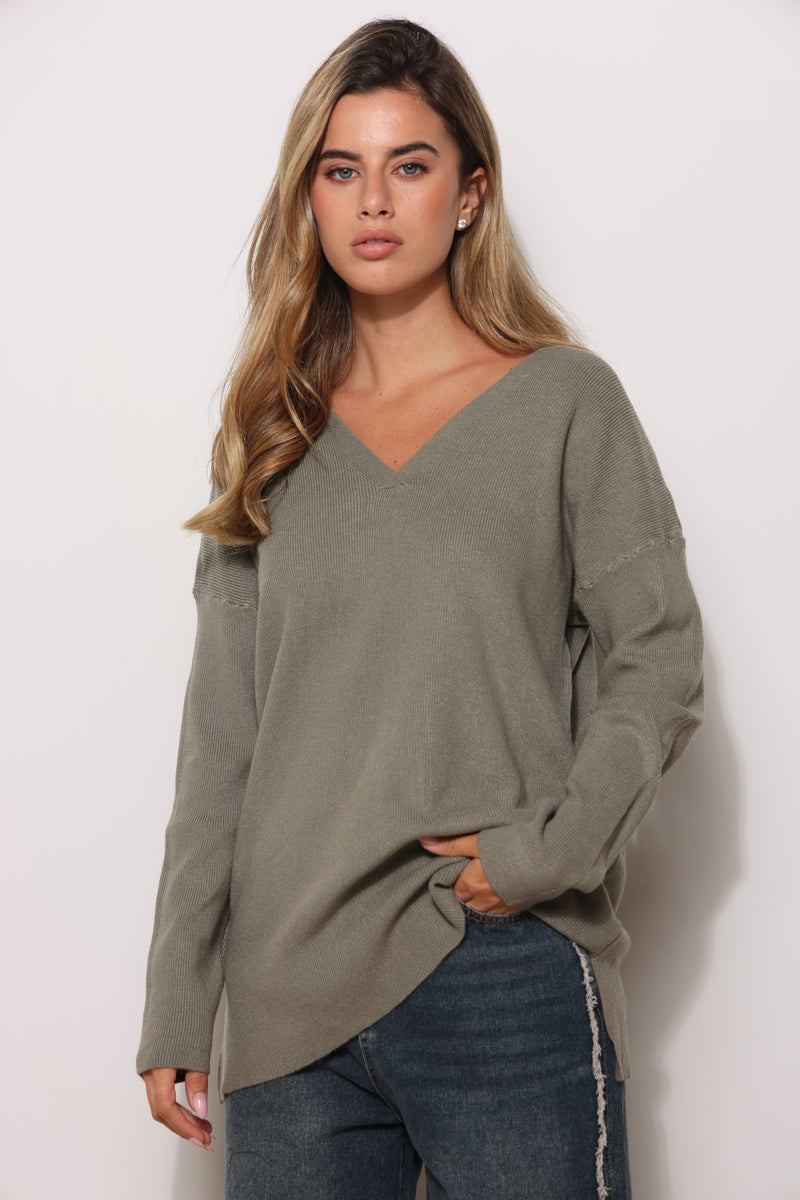 סריג בייסיק במגע רך בגזרת אוברסייז עם מפתח צווארון וי.