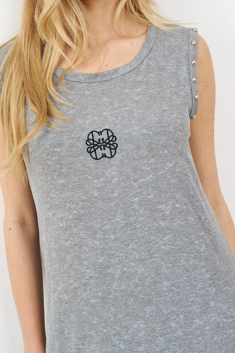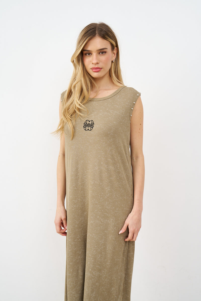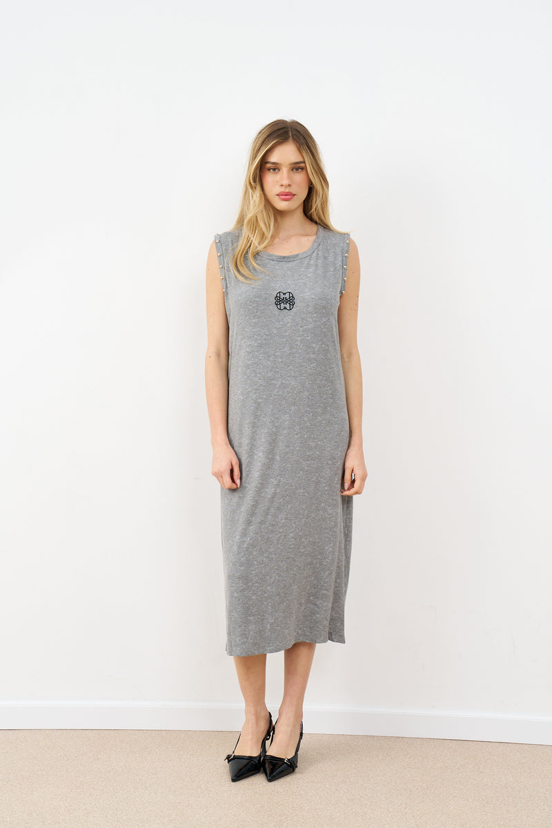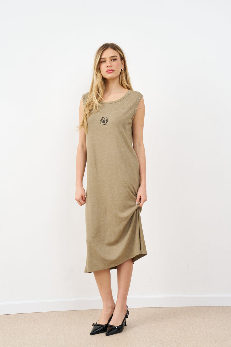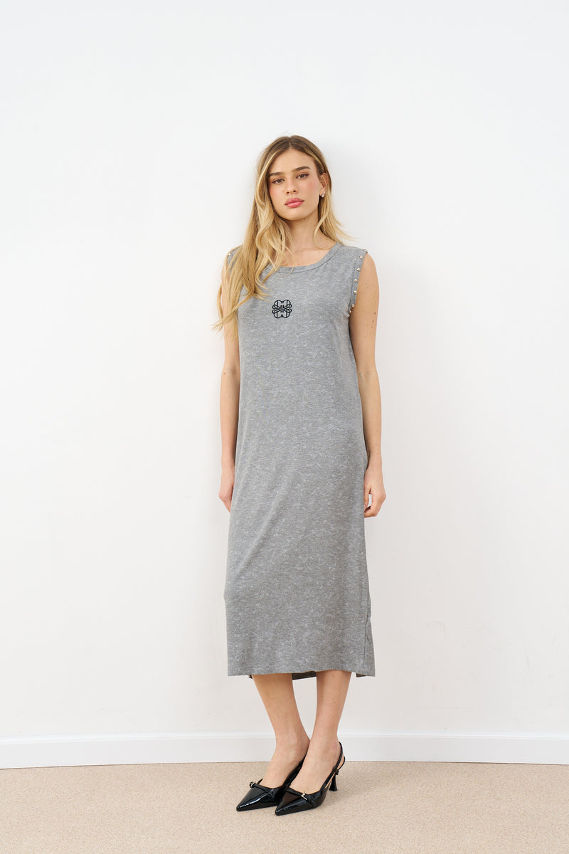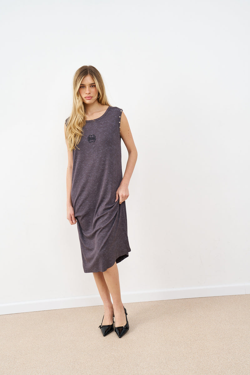 שמלה מבד טיידי כותנה עם טקסטורה, השמלה בעלת לוגו רקום בפרונט וללא שרוולים.