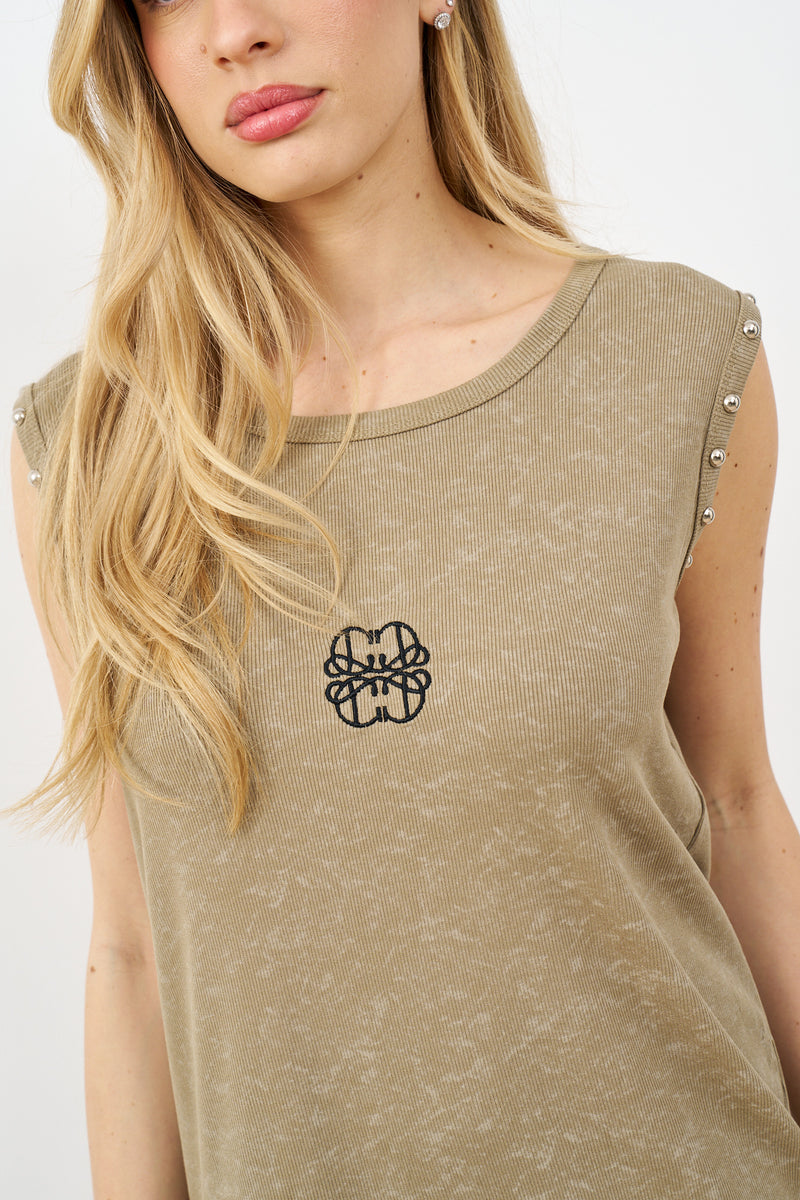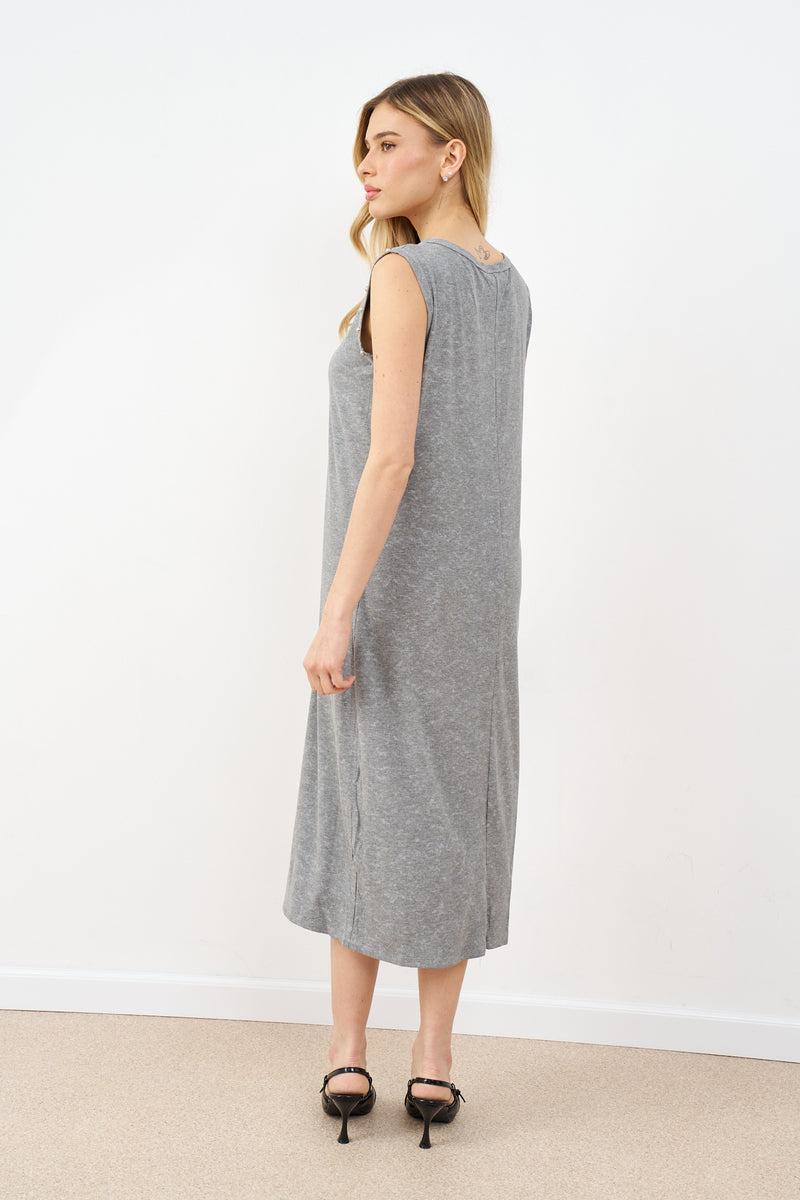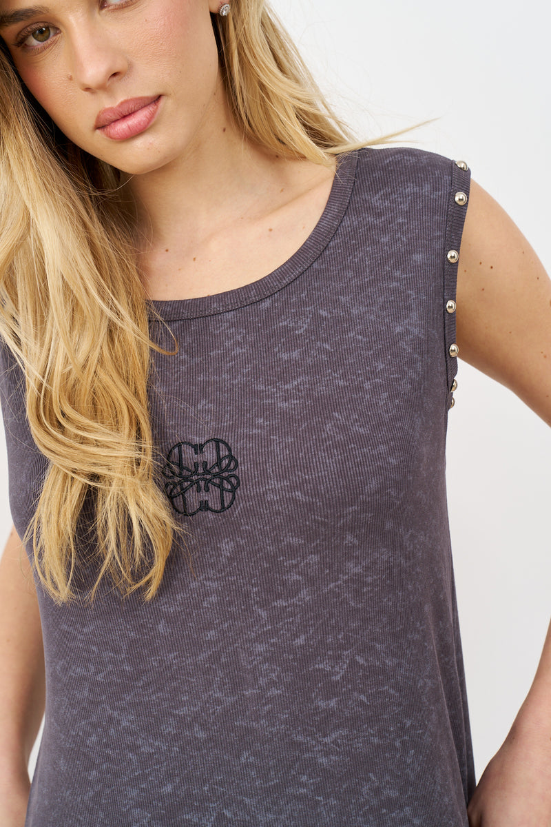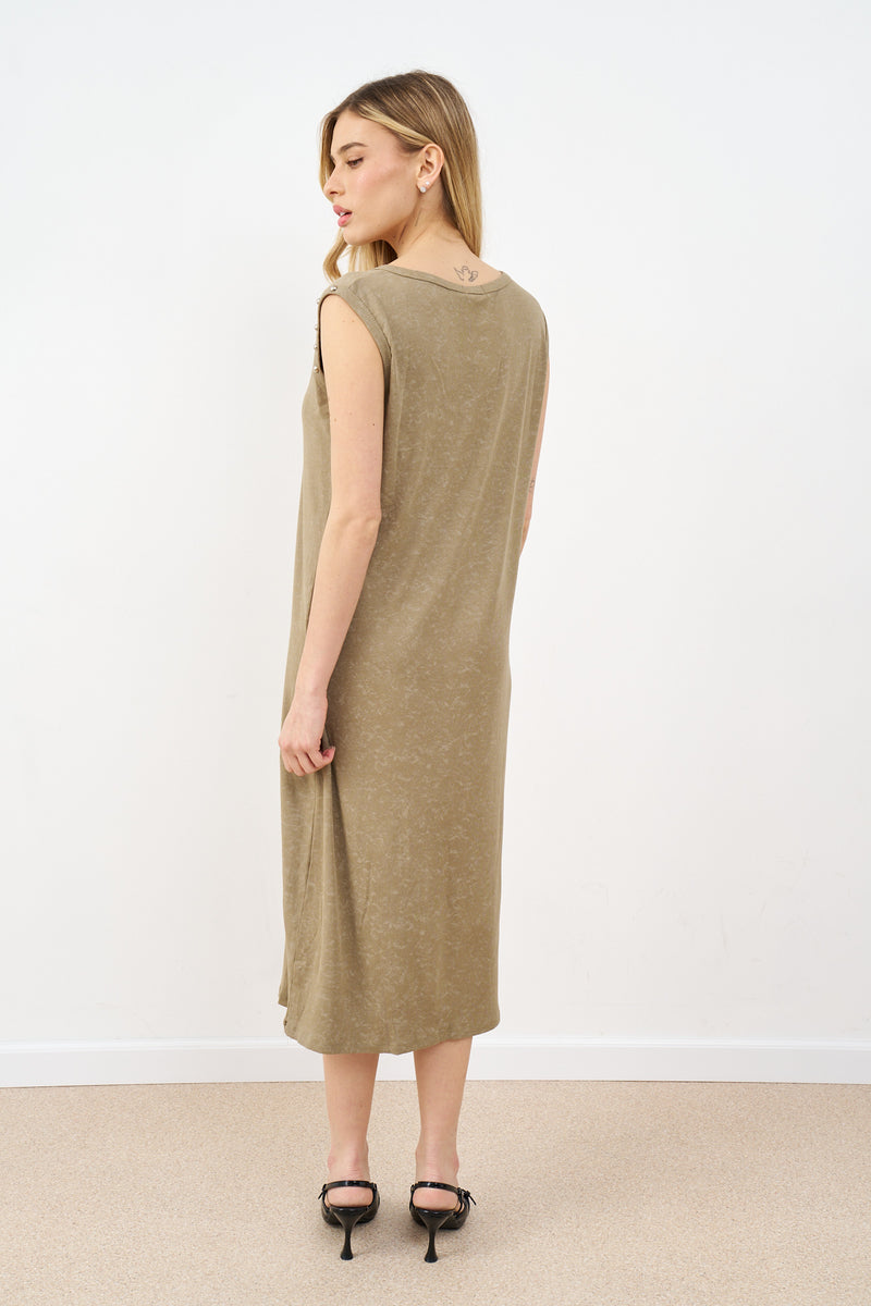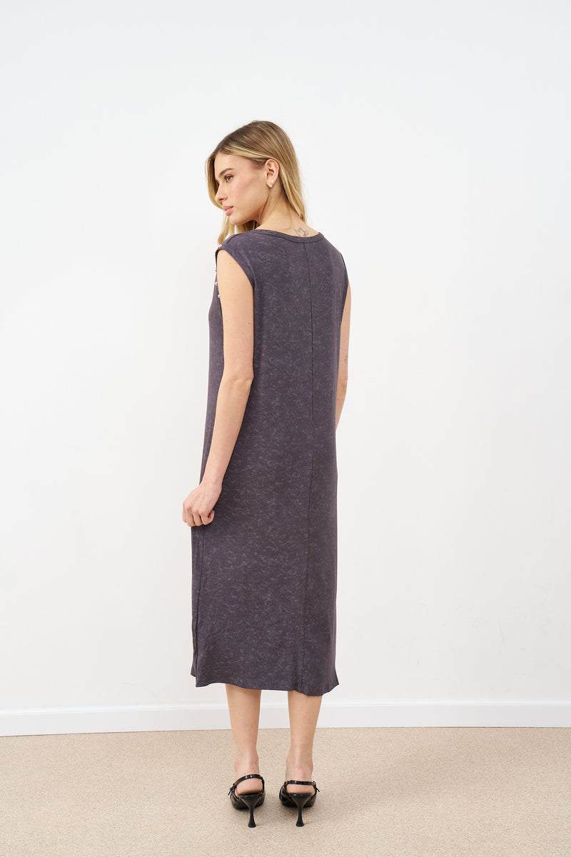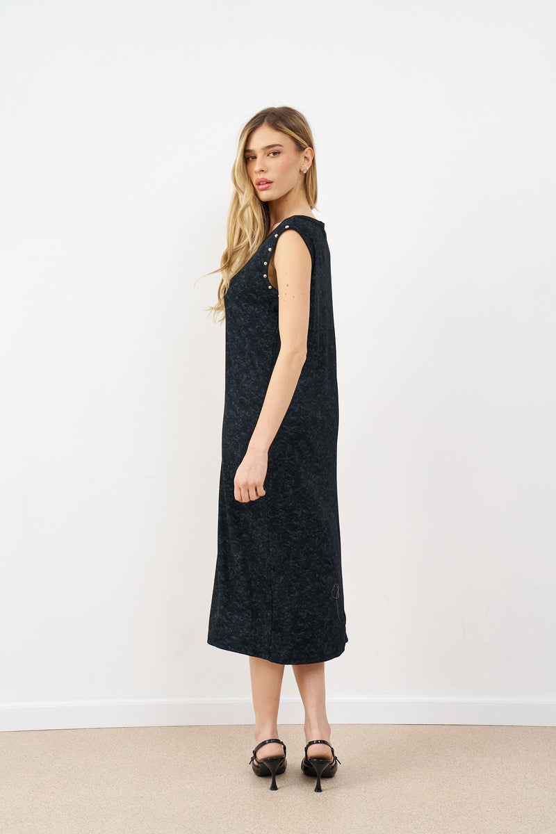 שמלה מבד טיידי כותנה עם טקסטורה, השמלה בעלת לוגו רקום בפרונט וללא שרוולים.