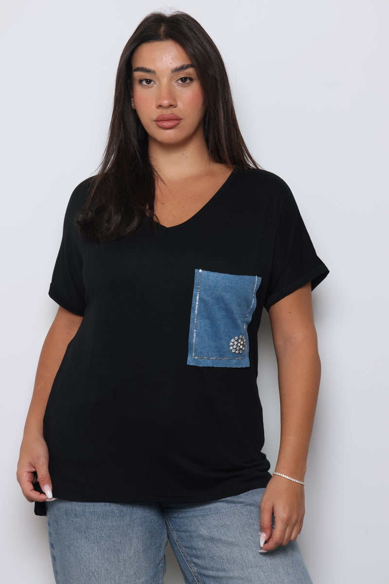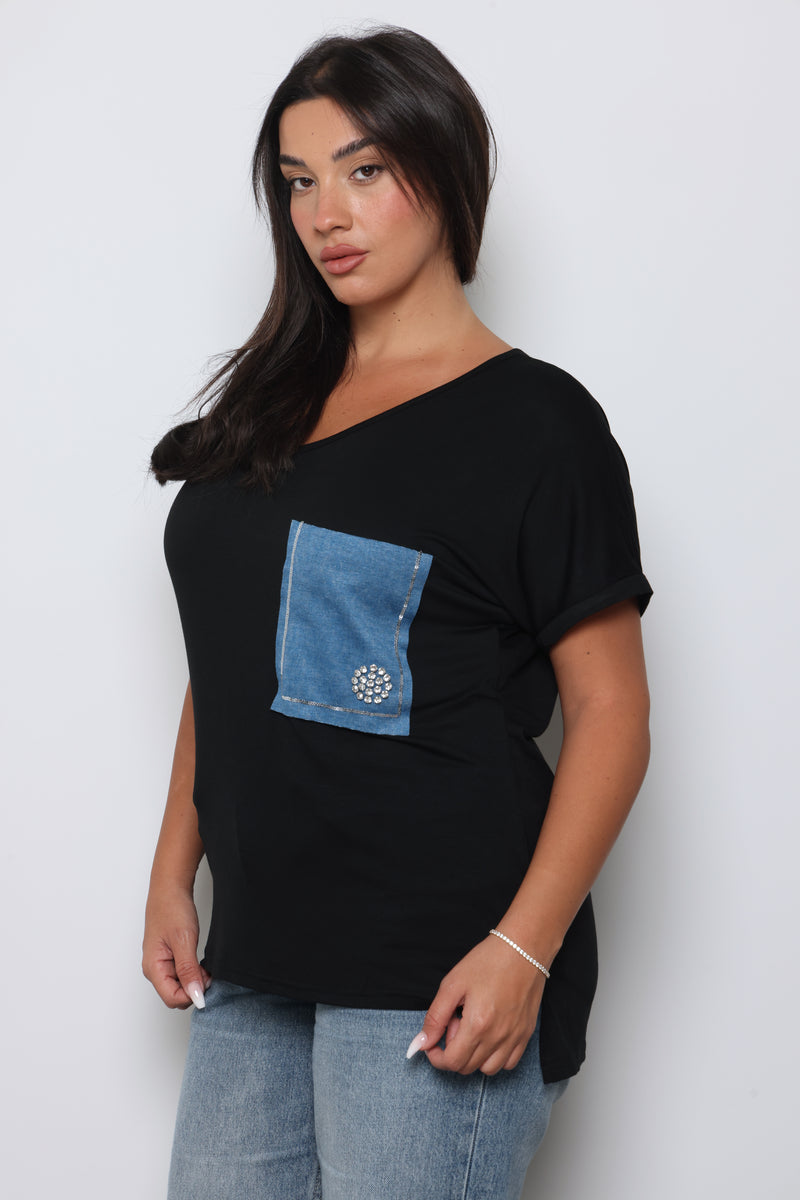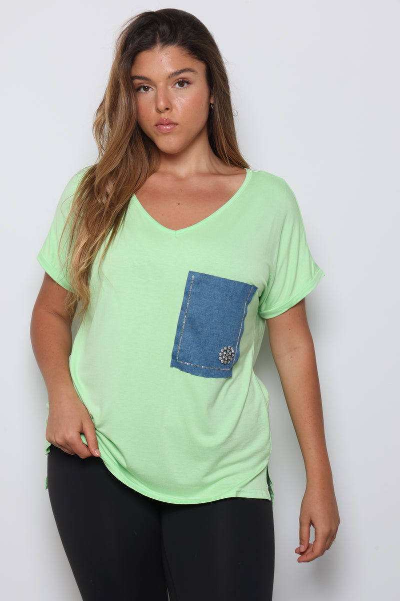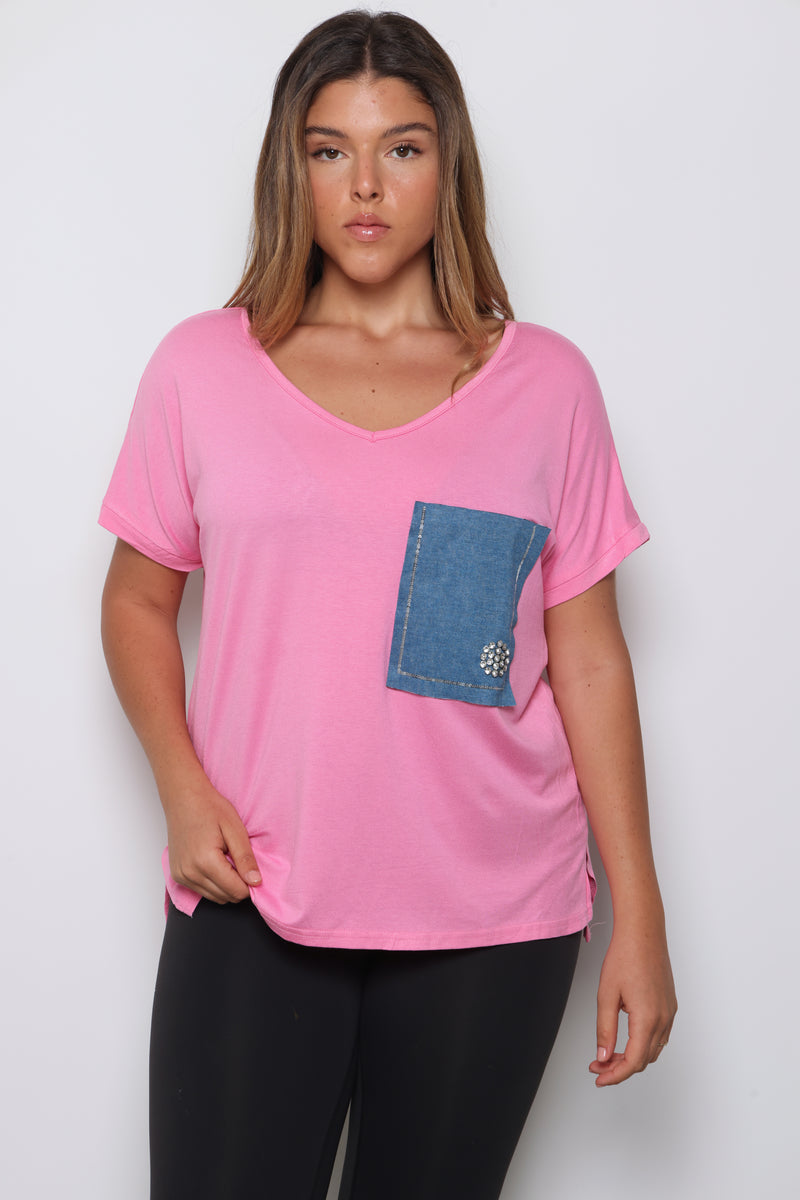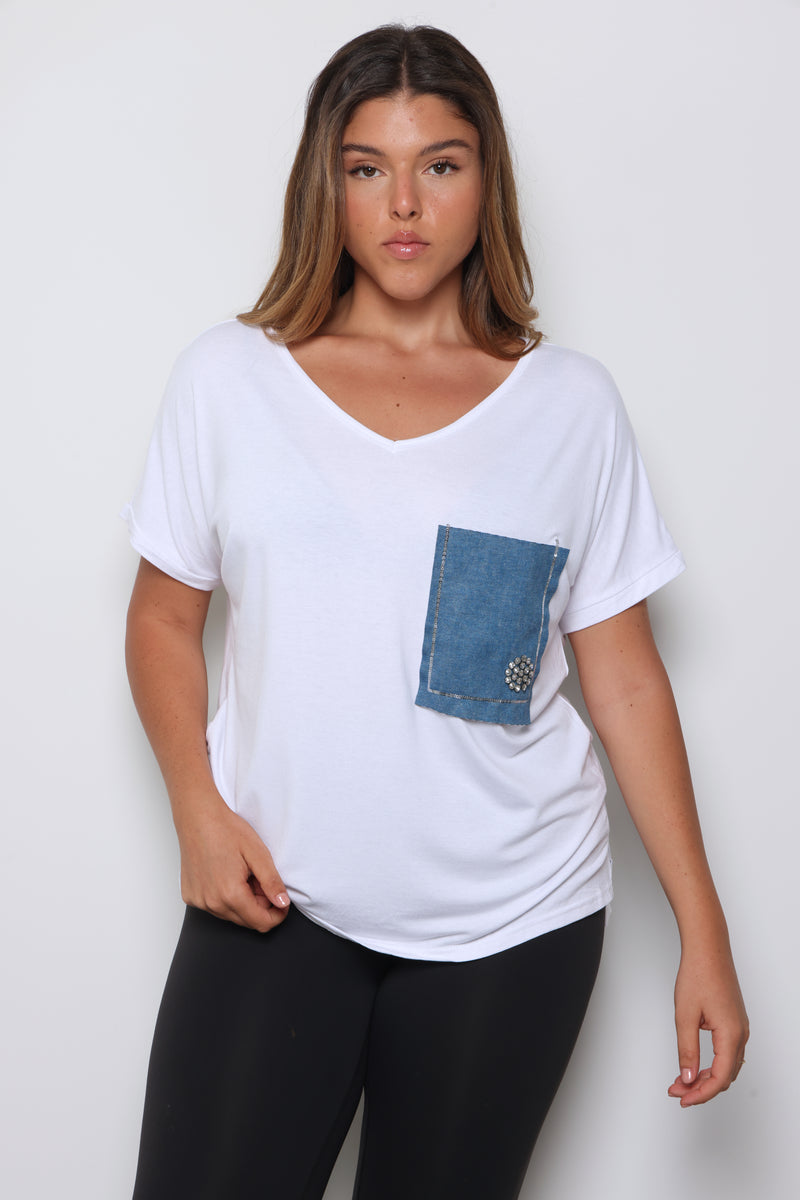 טוניקת פלאס סייז בגזרה רחבה עם צווארון וי עמוק וכיס ג'ינס.
