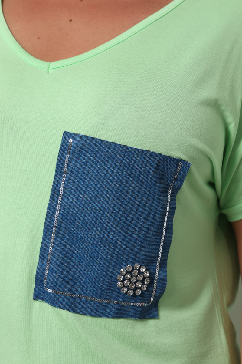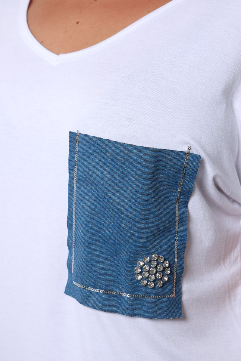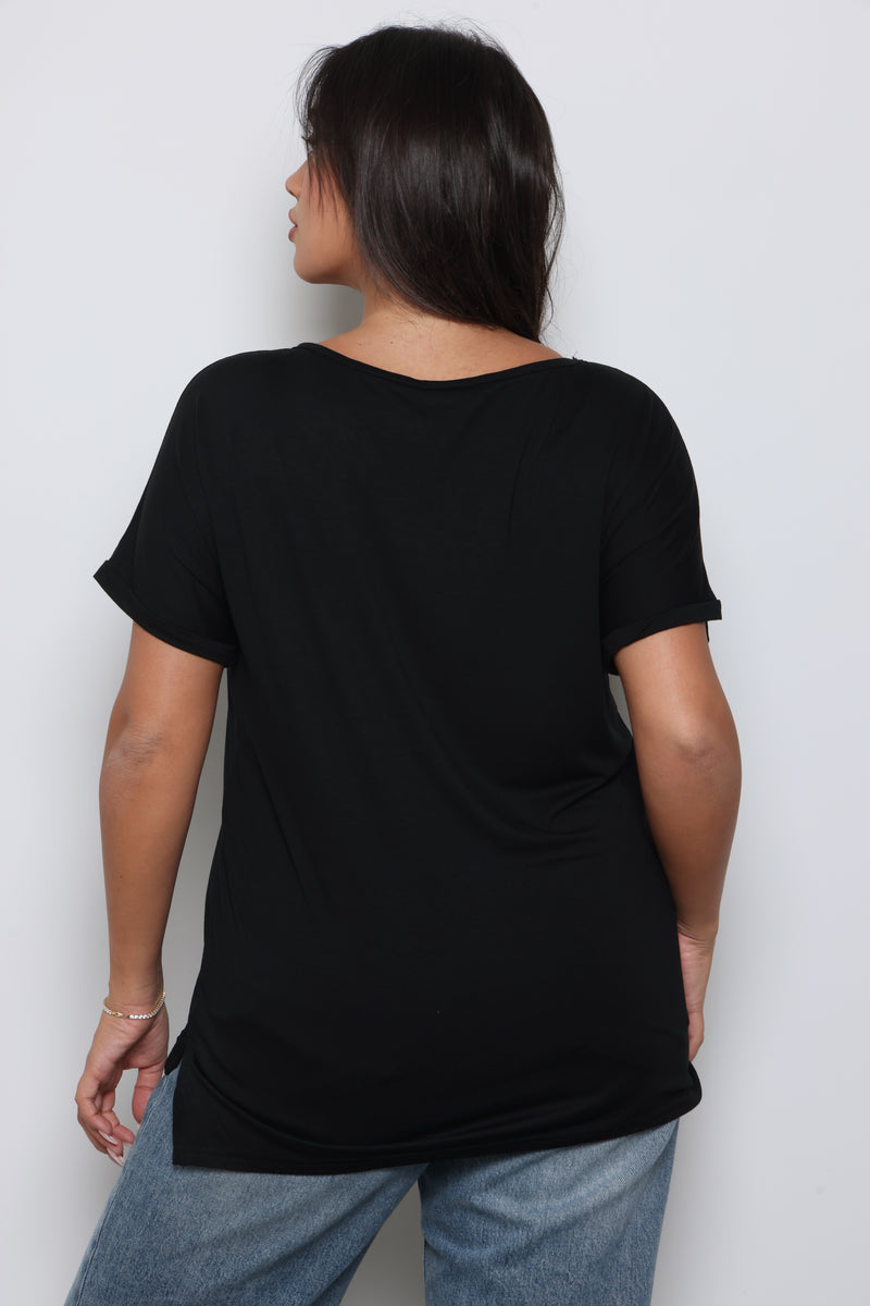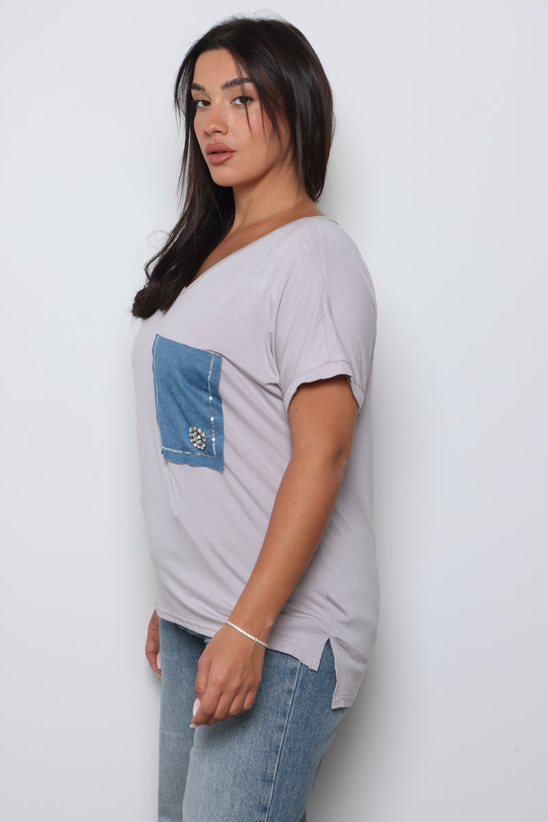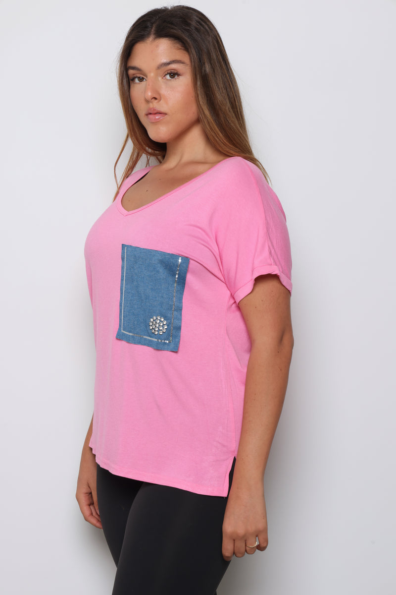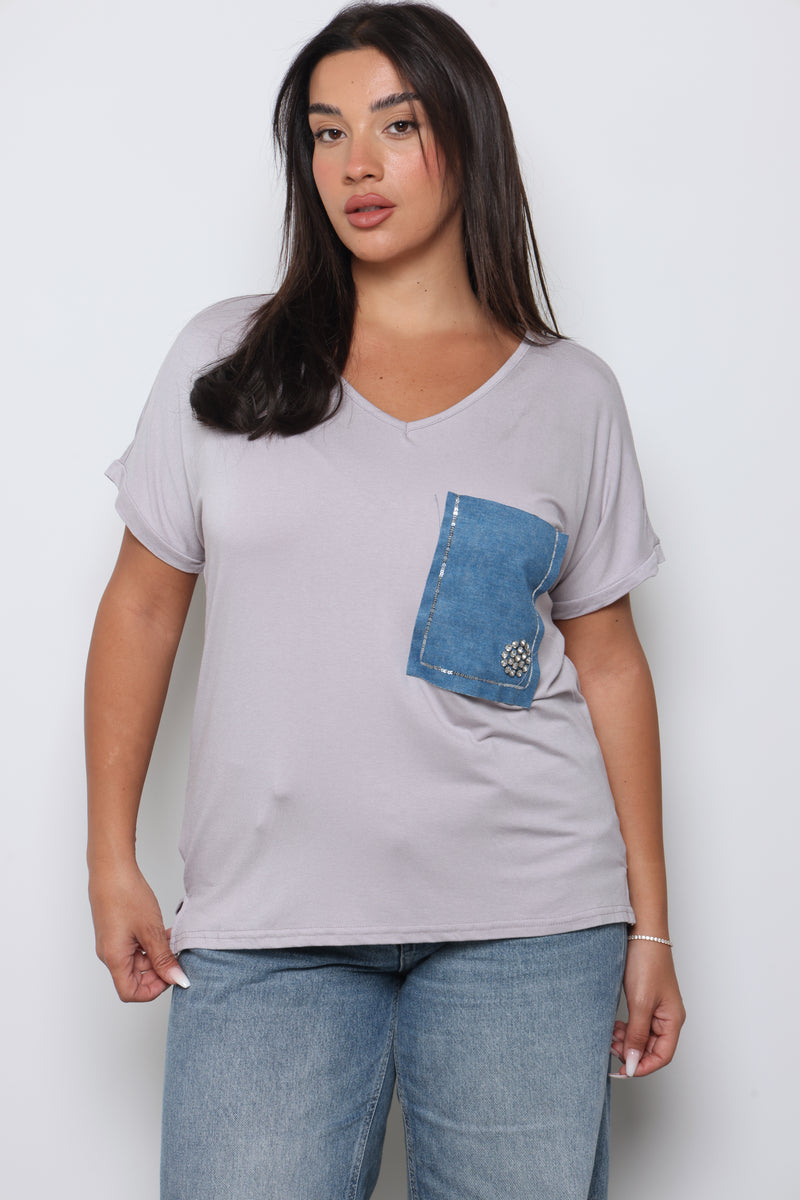טוניקת פלאס סייז בגזרה רחבה עם צווארון וי עמוק וכיס ג'ינס.
