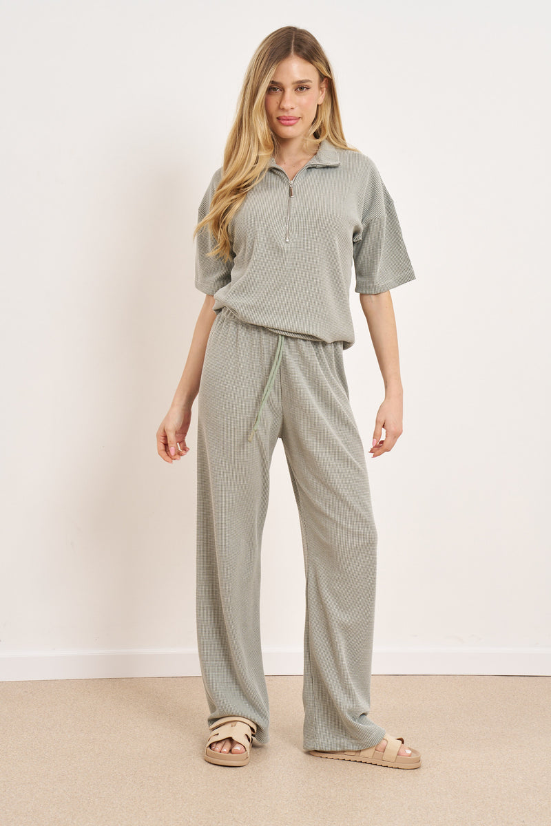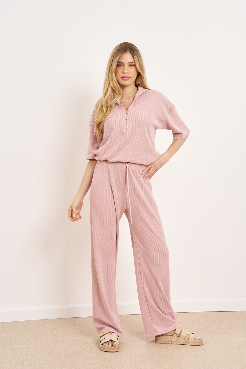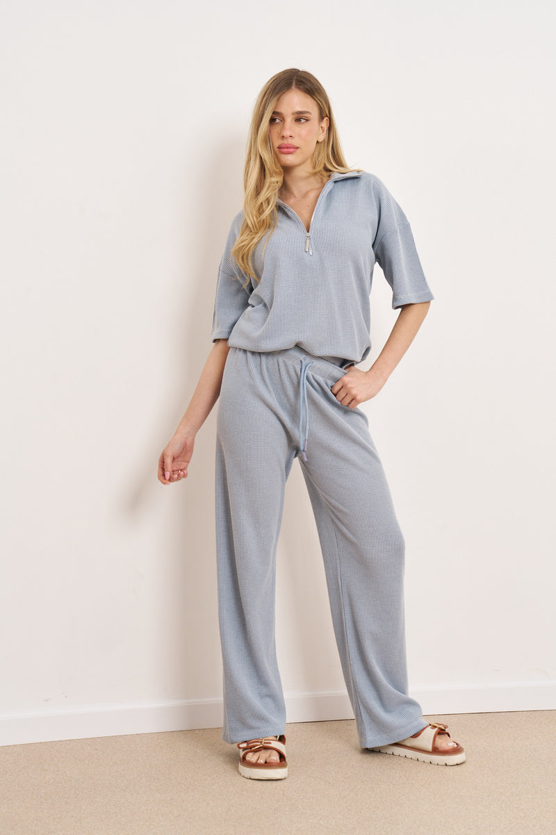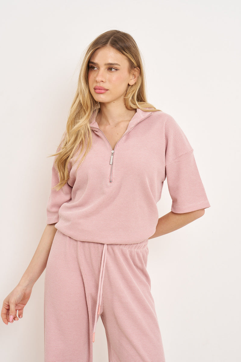 חליפת קזואל מבד וופל מלאנז' עם רוכסן בפרונט ושרוולים קצרים.