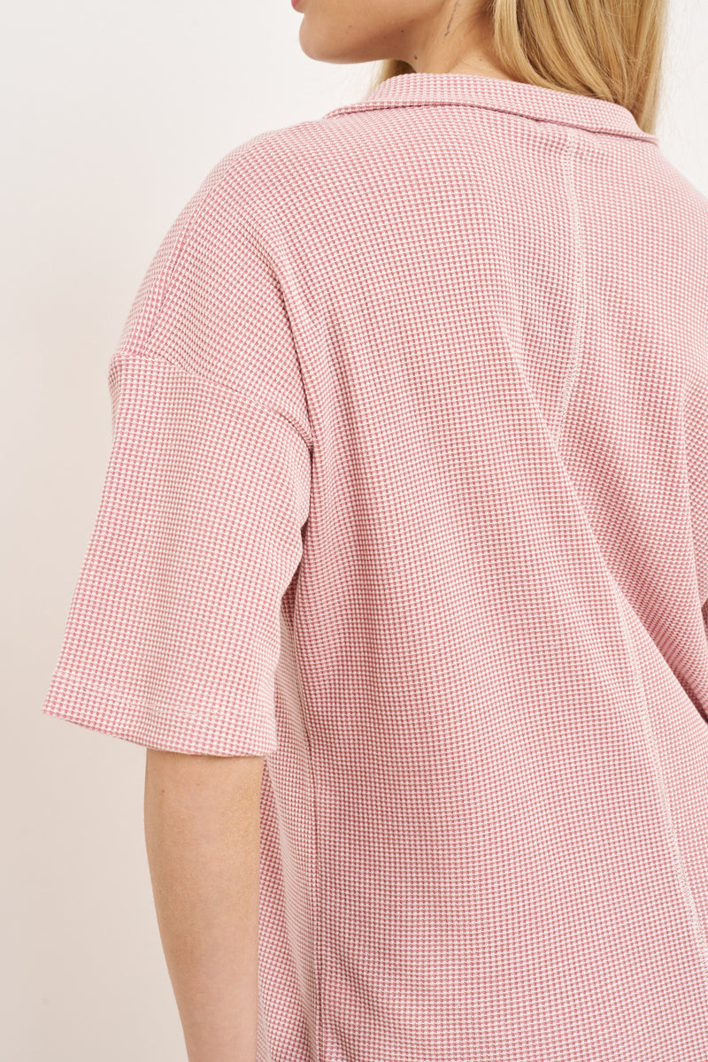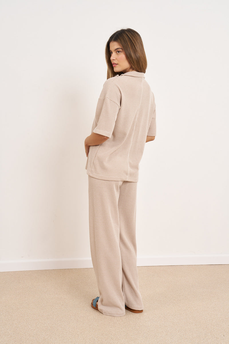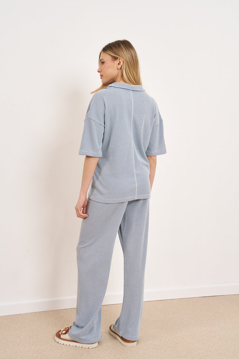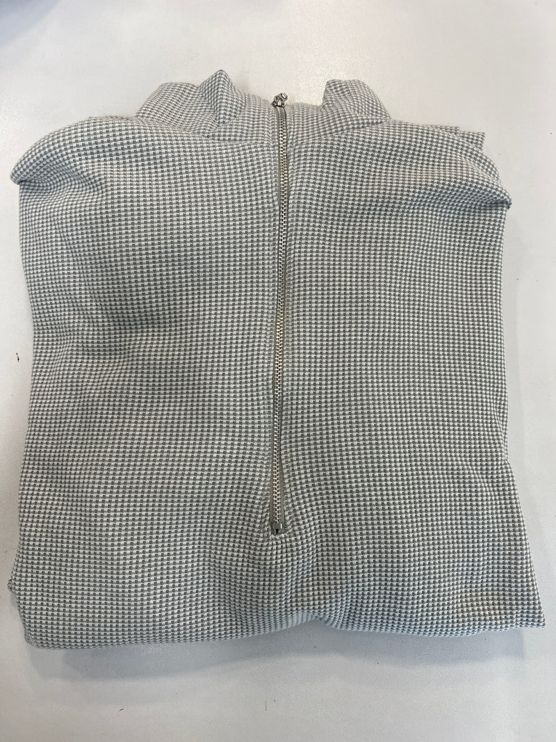 חליפת קזואל מבד וופל מלאנז' עם רוכסן בפרונט ושרוולים קצרים.