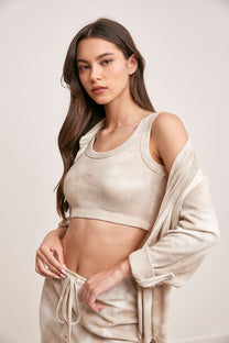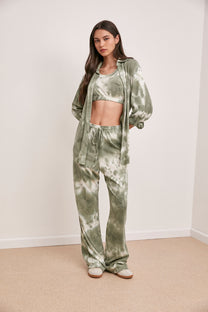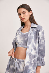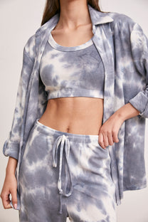 חליפת 3 חלקים מבד וופל טיידי המורכבת ממכנסיים מתרחבים עם גומי במותן ושרוך קשירה, טופ וחולצה מכופתרת.